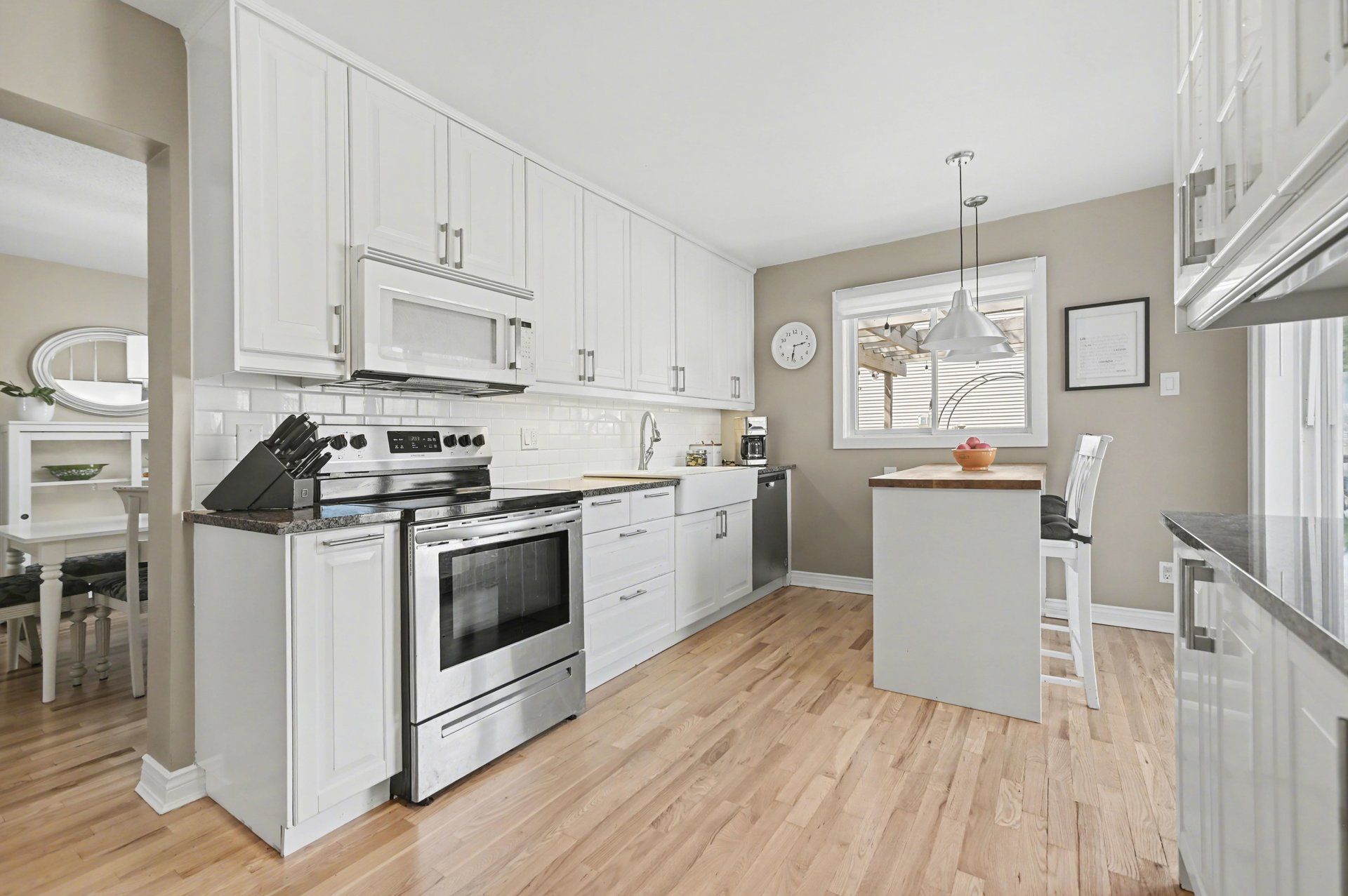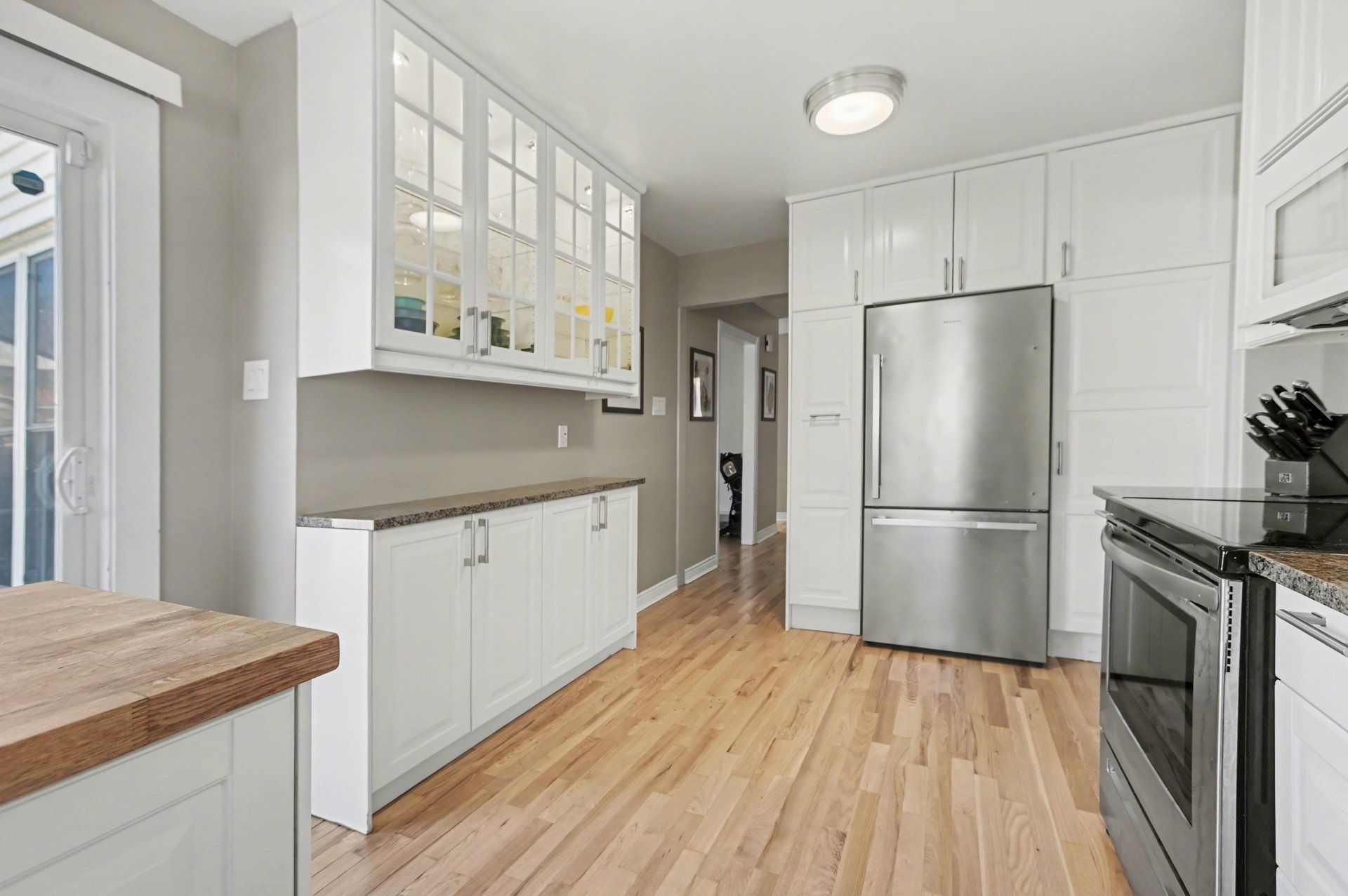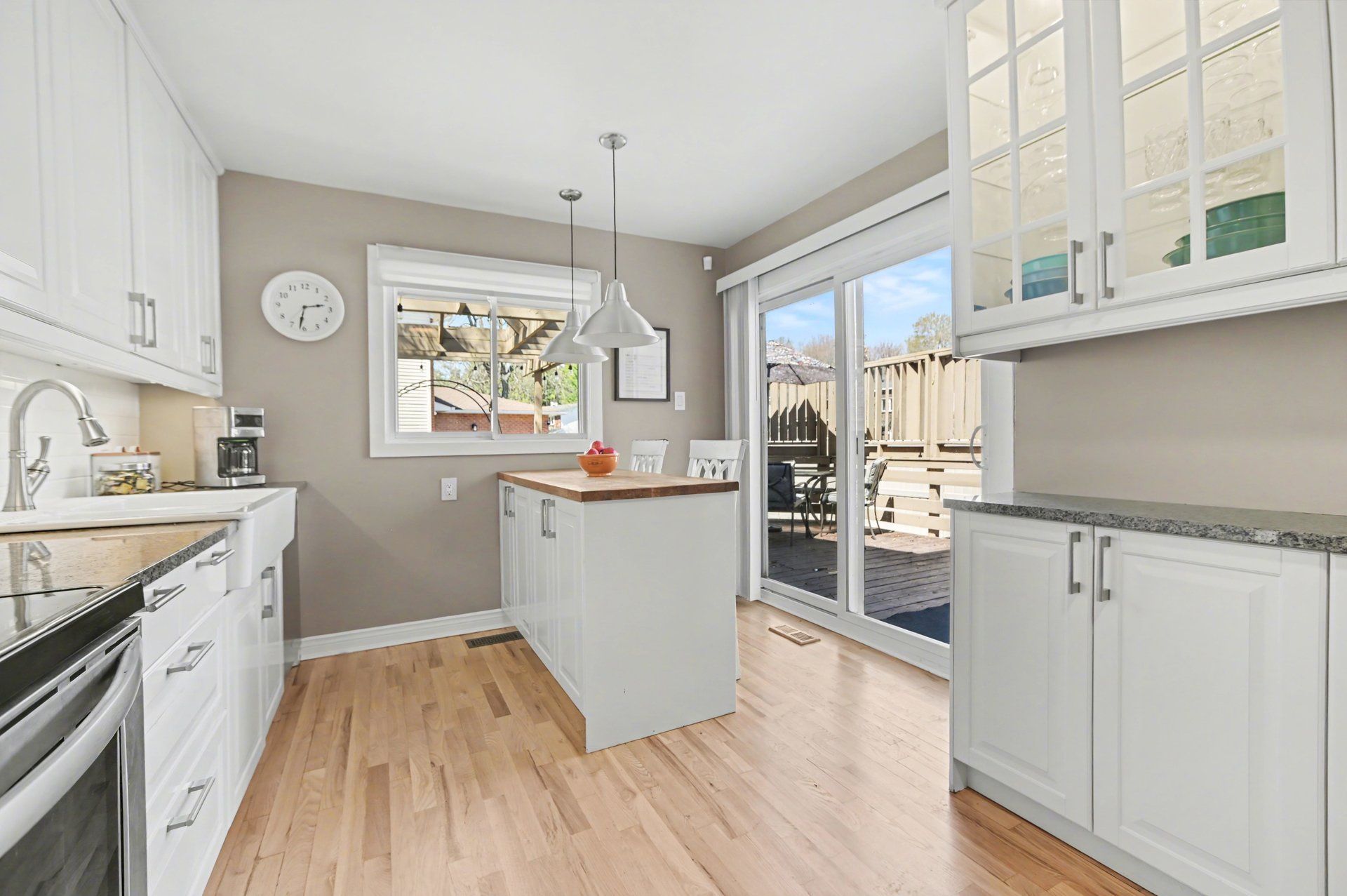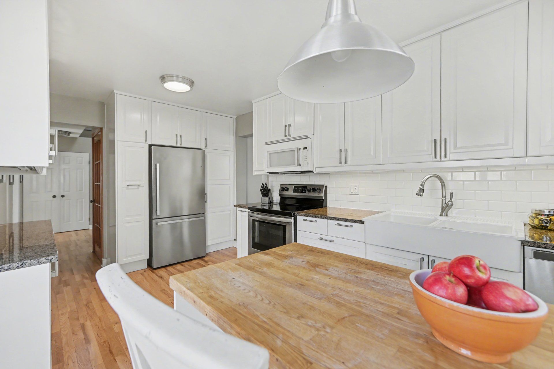 • Renovated kitchen featuring granite countertops and a butcher block island.