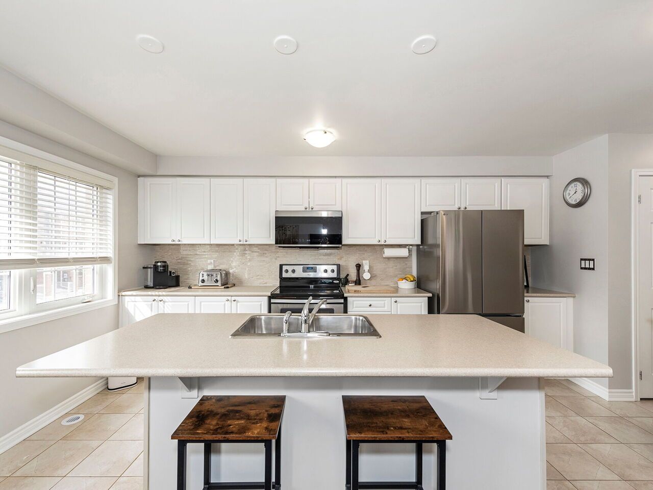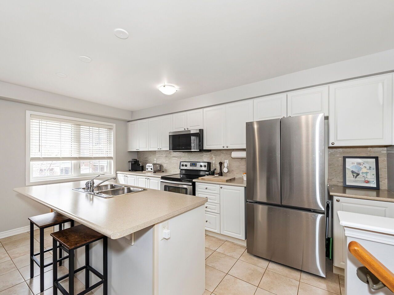 • Spacious kitchen with stainless steel appliances and functional island.