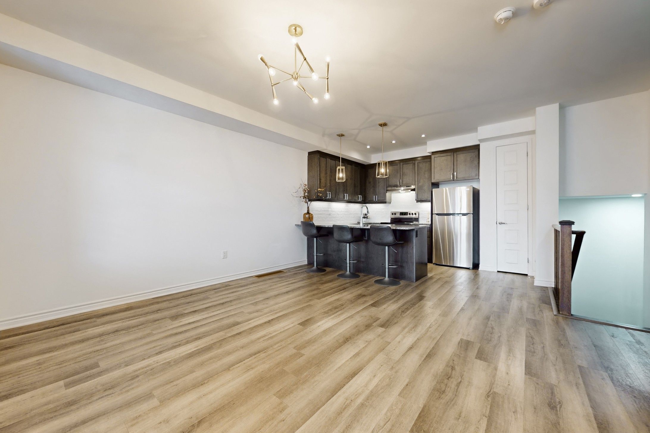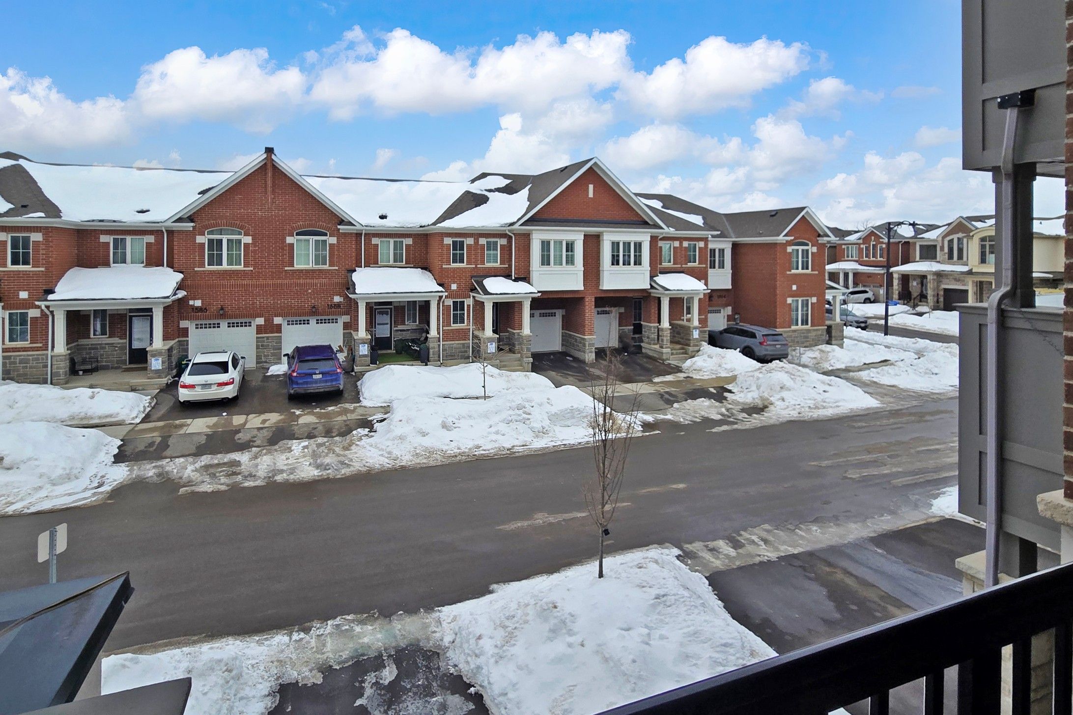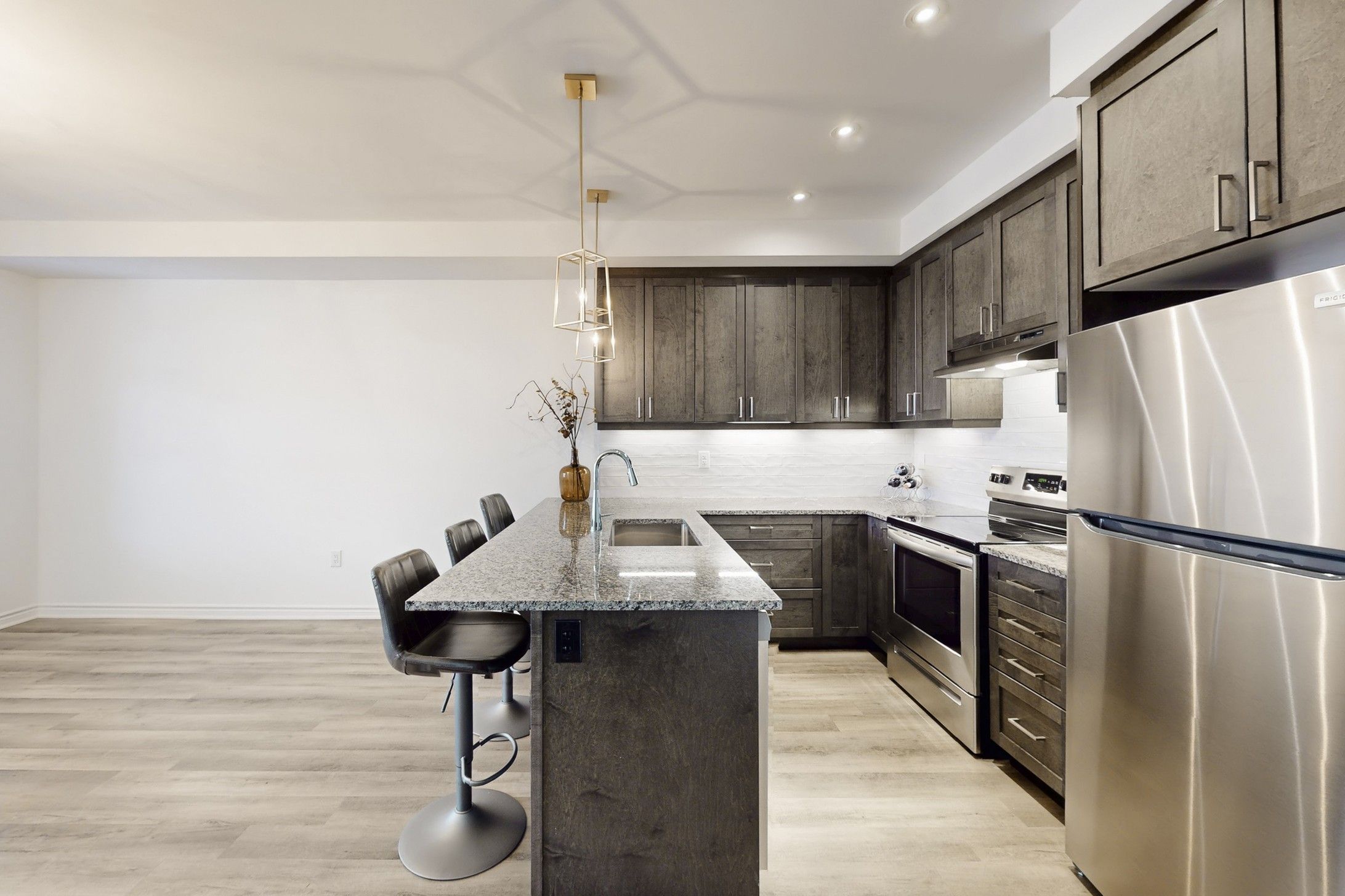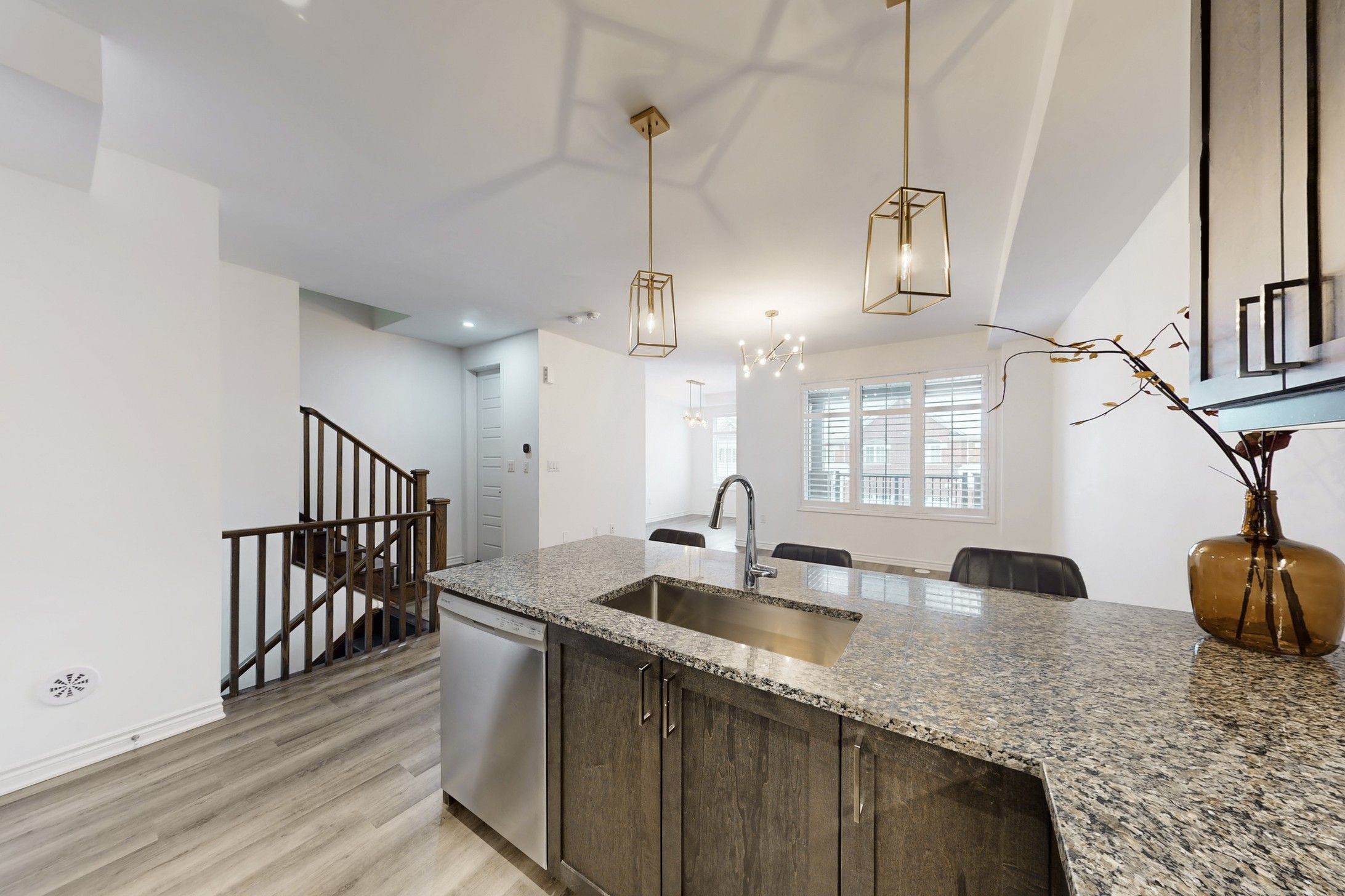 Experience unparalleled luxury in this executive townhouse. This fully freehold townhouse with an all-brick and stone elevation, has great curb appeal. Offering 2 bedrooms, 2. 5 baths, and an oversized 1-car garage, deep driveway with no sidewalk & parking for two cars in the driveway, this property exudes sophistication and style. From the welcoming foyer with upgraded ceramic tiles, a coat closet to the open-concept second level, every detail has been carefully crafted. The modern kitchen features upgraded cabinets, granite countertops, backsplash, breakfast bar, pendant lights and stainless steel appliances, ideal for culinary enthusiasts. Entertain effortlessly in the spacious open concept family room. Separate dining room which opens onto a covered balcony with a gas line for bbq hookup, perfect for outdoor dining or morning coffee. Upstairs, the lavish primary suite features a large walk-in closet, 4pc full ensuite bathroom and walk-out to a balcony. The second suite has a large walk-in closet and 3pc ensuite bathroom. Laundry conveniently located on the 3rd floor with upgraded full size machines. This home is upgraded throughout with tall bathroom vanities, stone counters, ceramic tiles, modern laminate floors, modern light fixtures and built-in storage cabinets. Access door from house to garage and smart auto garage door opener installed. Ideally located near amenities, schools, library, shopping, parks and easy access to hwy 401. Don't miss the chance to make this exceptional home your own.