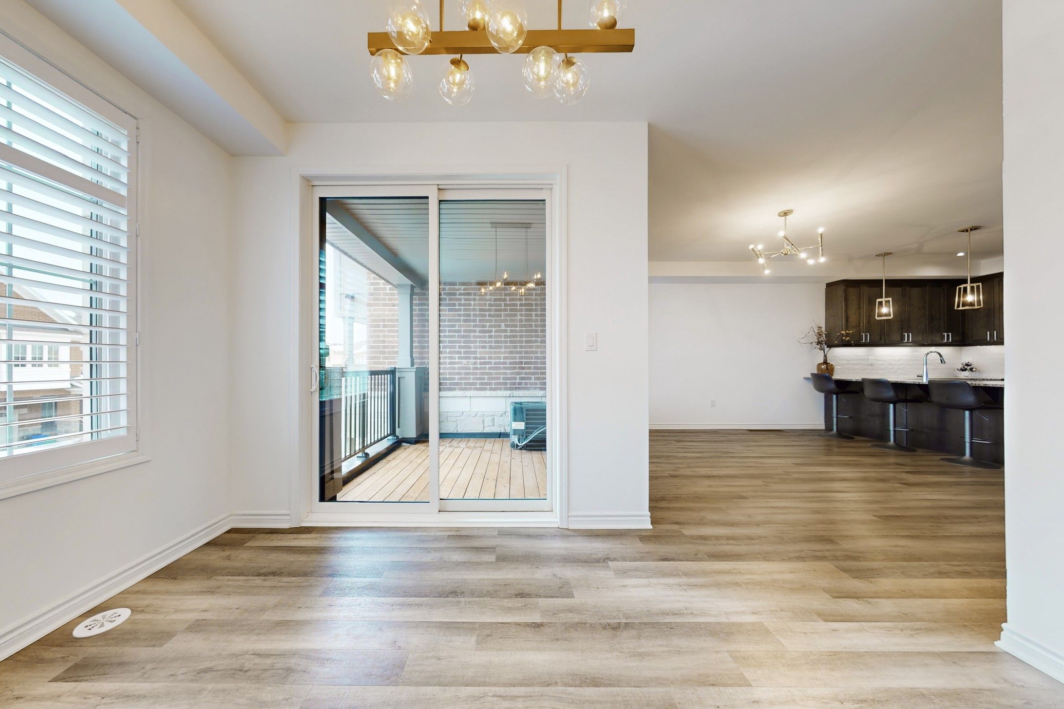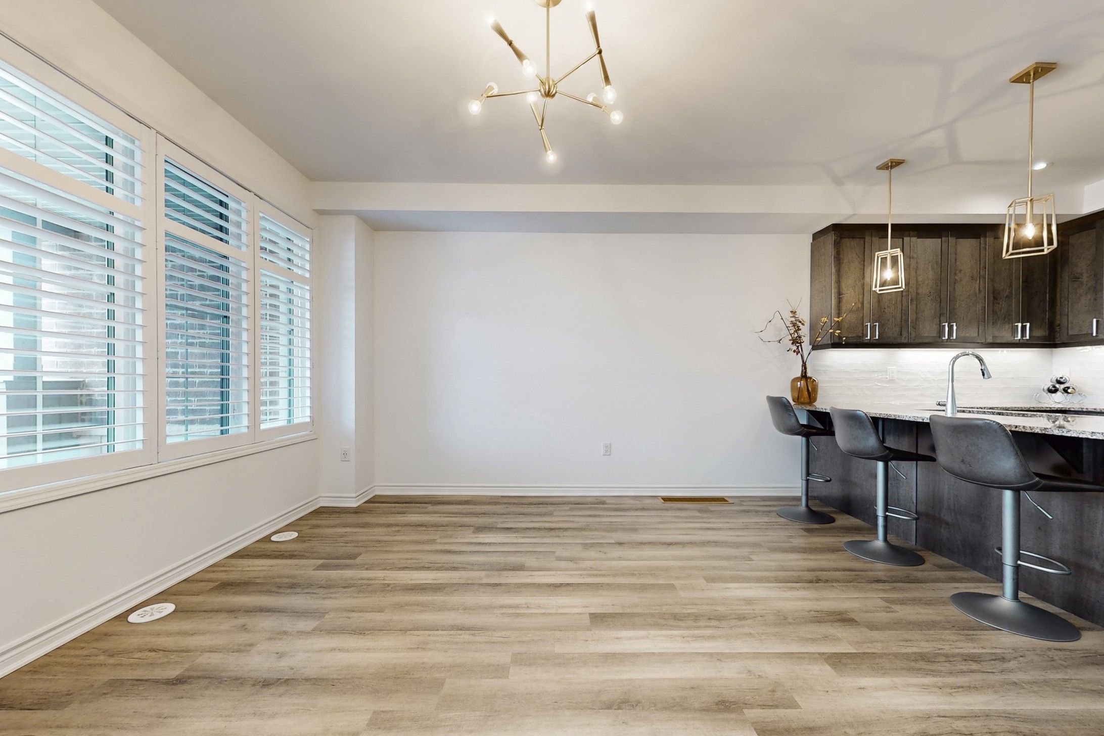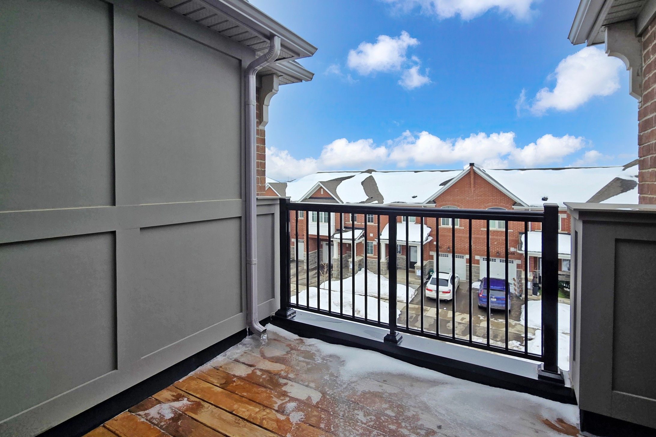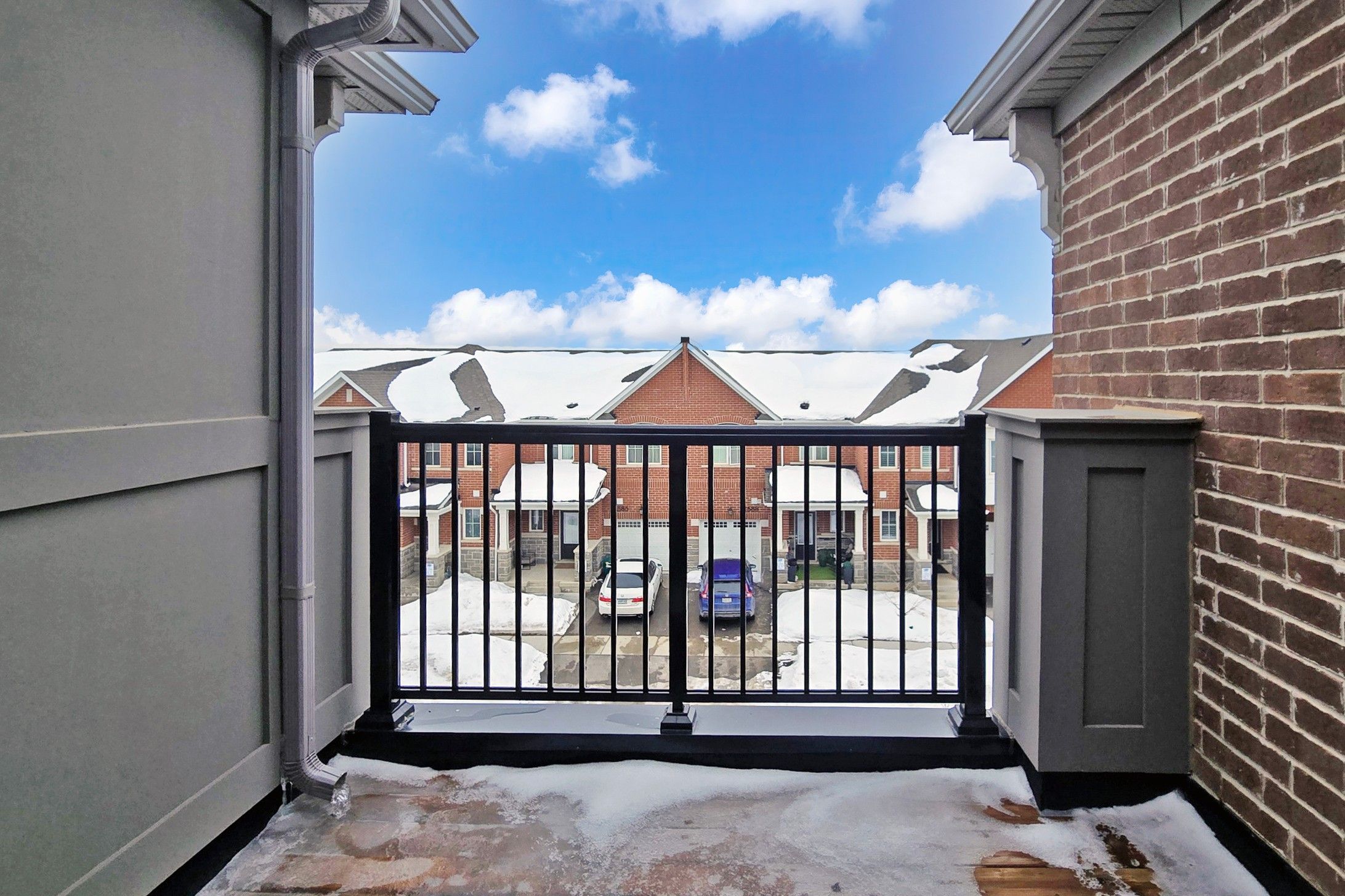 Experience unparalleled luxury in this executive townhouse. This fully freehold townhouse with an all-brick and stone elevation, has great curb appeal. Offering 2 bedrooms, 2. 5 baths, and an oversized 1-car garage, deep driveway with no sidewalk & parking for two cars in the driveway, this property exudes sophistication and style. From the welcoming foyer with upgraded ceramic tiles, a coat closet to the open-concept second level, every detail has been carefully crafted. The modern kitchen features upgraded cabinets, granite countertops, backsplash, breakfast bar, pendant lights and stainless steel appliances, ideal for culinary enthusiasts. Entertain effortlessly in the spacious open concept family room. Separate dining room which opens onto a covered balcony with a gas line for bbq hookup, perfect for outdoor dining or morning coffee. Upstairs, the lavish primary suite features a large walk-in closet, 4pc full ensuite bathroom and walk-out to a balcony. The second suite has a large walk-in closet and 3pc ensuite bathroom. Laundry conveniently located on the 3rd floor with upgraded full size machines. This home is upgraded throughout with tall bathroom vanities, stone counters, ceramic tiles, modern laminate floors, modern light fixtures and built-in storage cabinets. Access door from house to garage and smart auto garage door opener installed. Ideally located near amenities, schools, library, shopping, parks and easy access to hwy 401. Don't miss the chance to make this exceptional home your own.