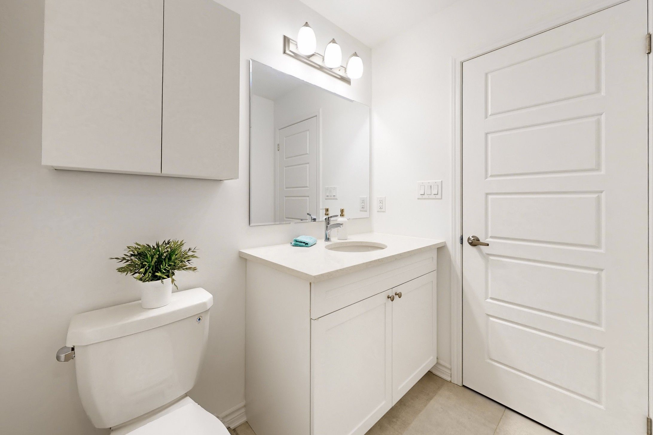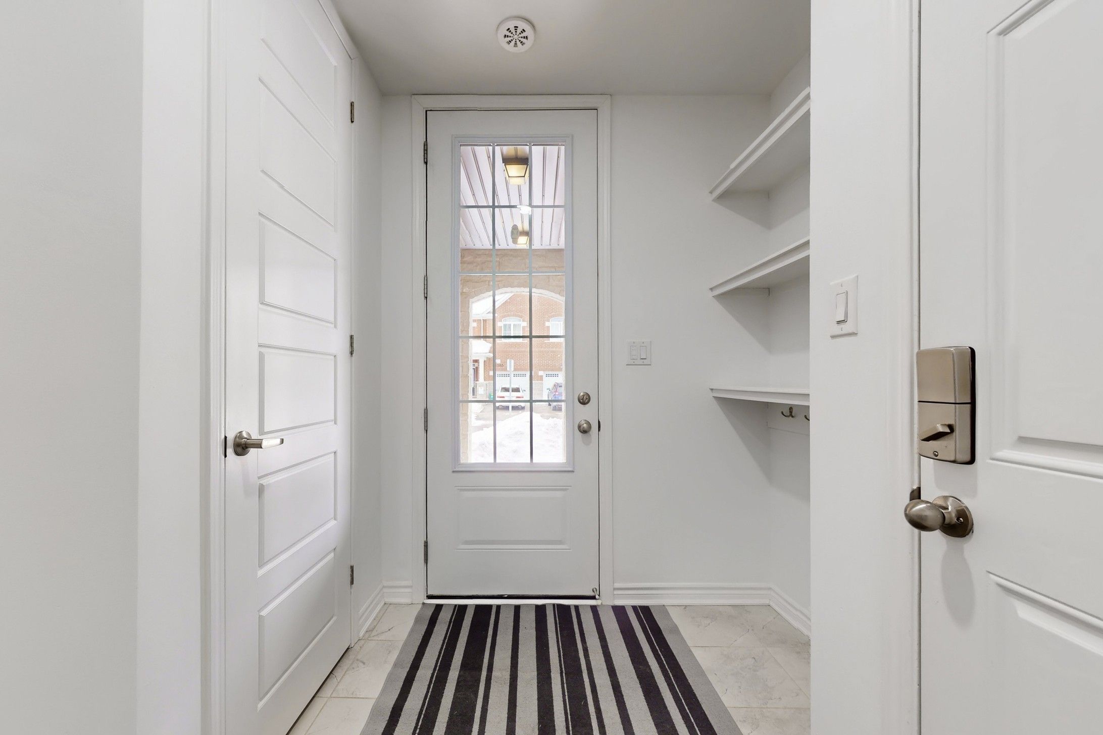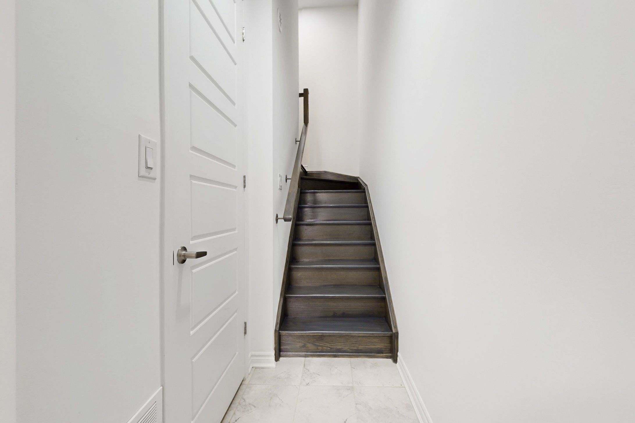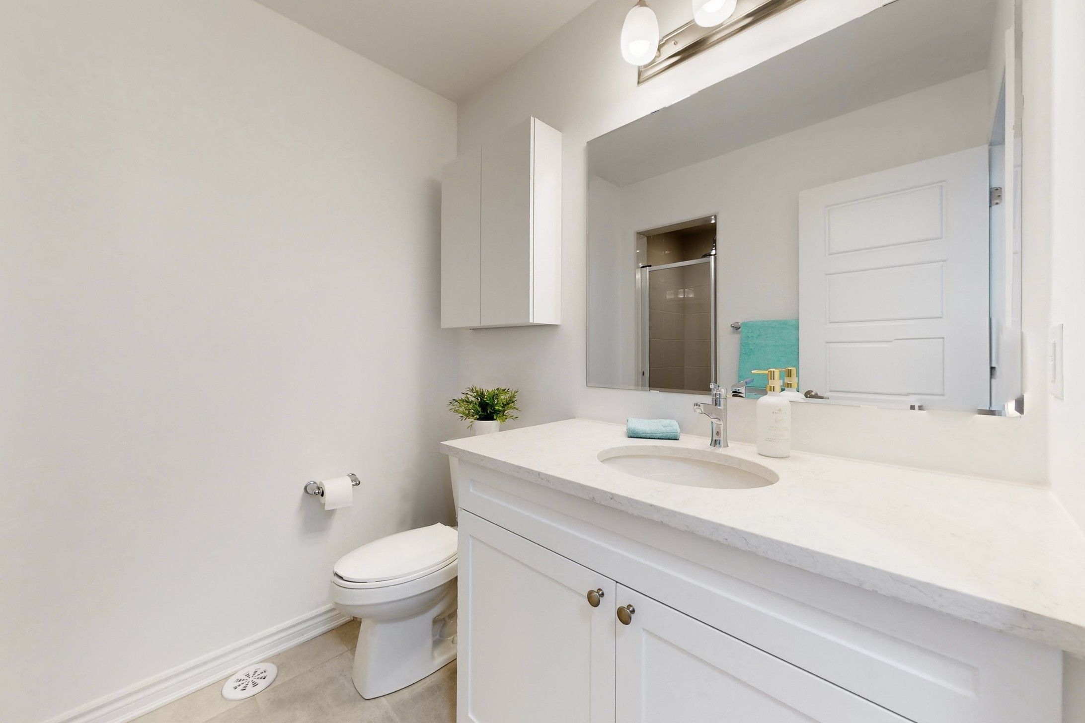 Experience unparalleled luxury in this executive townhouse. This fully freehold townhouse with an all-brick and stone elevation, has great curb appeal. Offering 2 bedrooms, 2. 5 baths, and an oversized 1-car garage, deep driveway with no sidewalk & parking for two cars in the driveway, this property exudes sophistication and style. From the welcoming foyer with upgraded ceramic tiles, a coat closet to the open-concept second level, every detail has been carefully crafted. The modern kitchen features upgraded cabinets, granite countertops, backsplash, breakfast bar, pendant lights and stainless steel appliances, ideal for culinary enthusiasts. Entertain effortlessly in the spacious open concept family room. Separate dining room which opens onto a covered balcony with a gas line for bbq hookup, perfect for outdoor dining or morning coffee. Upstairs, the lavish primary suite features a large walk-in closet, 4pc full ensuite bathroom and walk-out to a balcony. The second suite has a large walk-in closet and 3pc ensuite bathroom. Laundry conveniently located on the 3rd floor with upgraded full size machines. This home is upgraded throughout with tall bathroom vanities, stone counters, ceramic tiles, modern laminate floors, modern light fixtures and built-in storage cabinets. Access door from house to garage and smart auto garage door opener installed. Ideally located near amenities, schools, library, shopping, parks and easy access to hwy 401. Don't miss the chance to make this exceptional home your own.