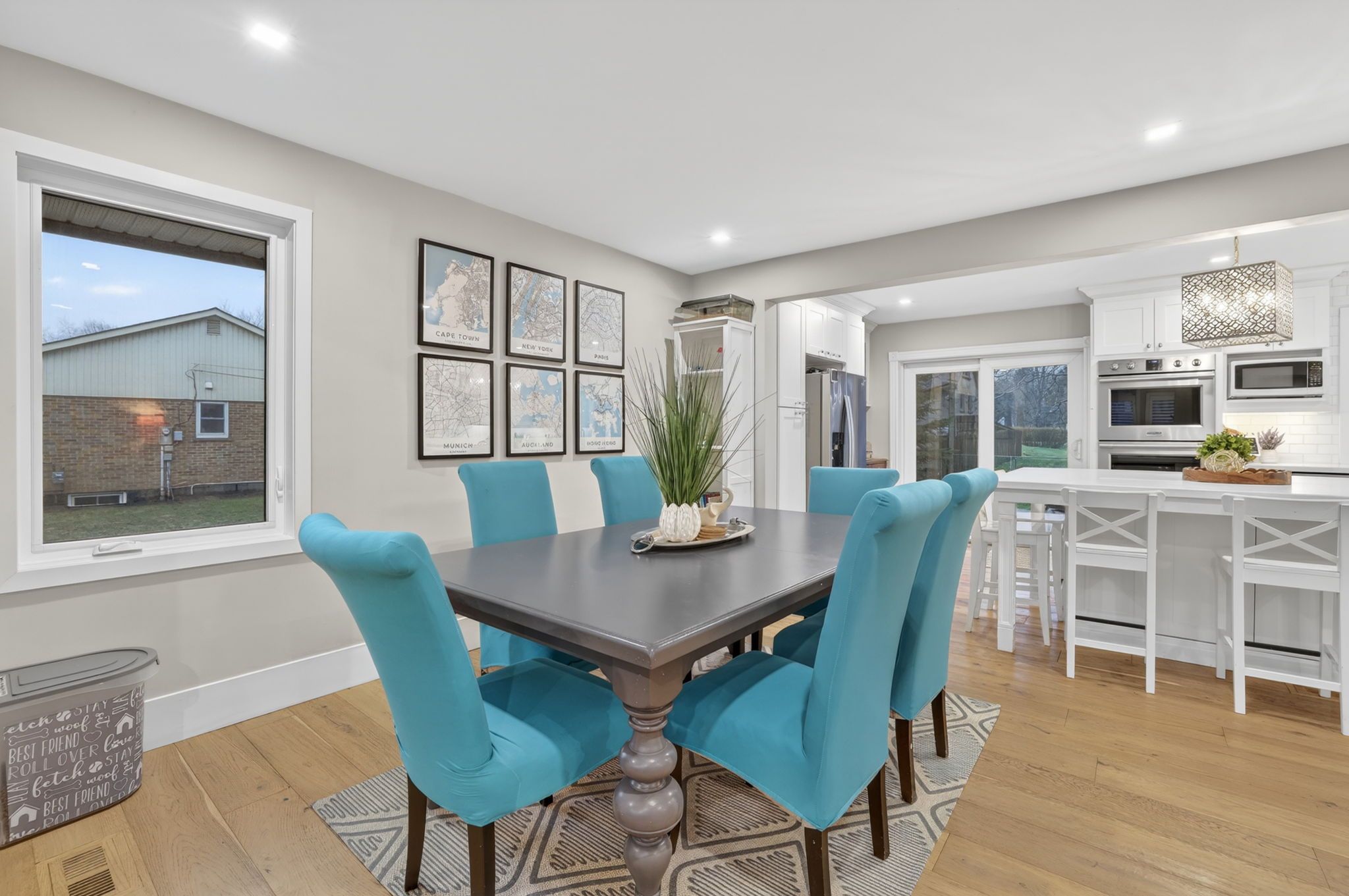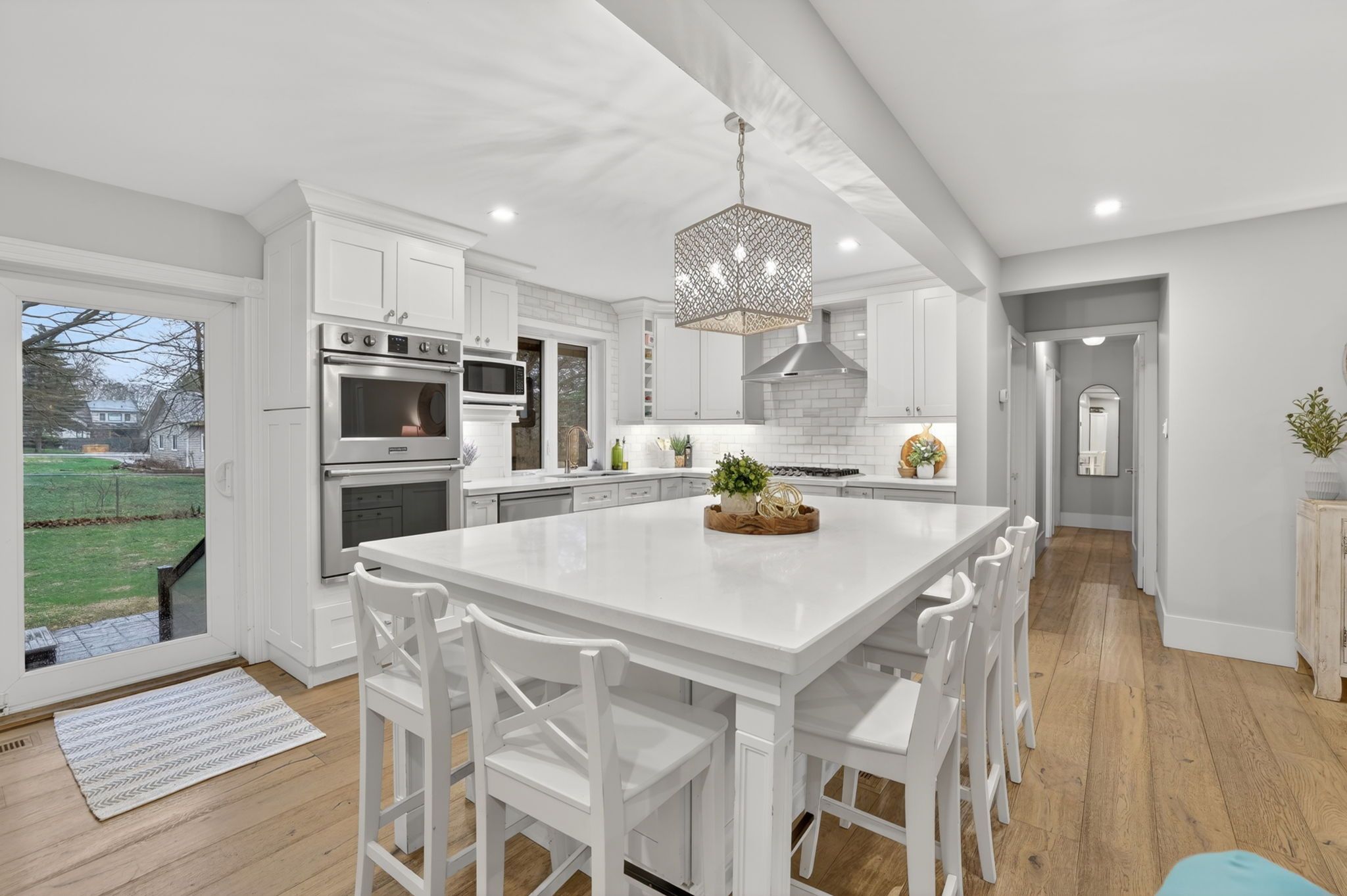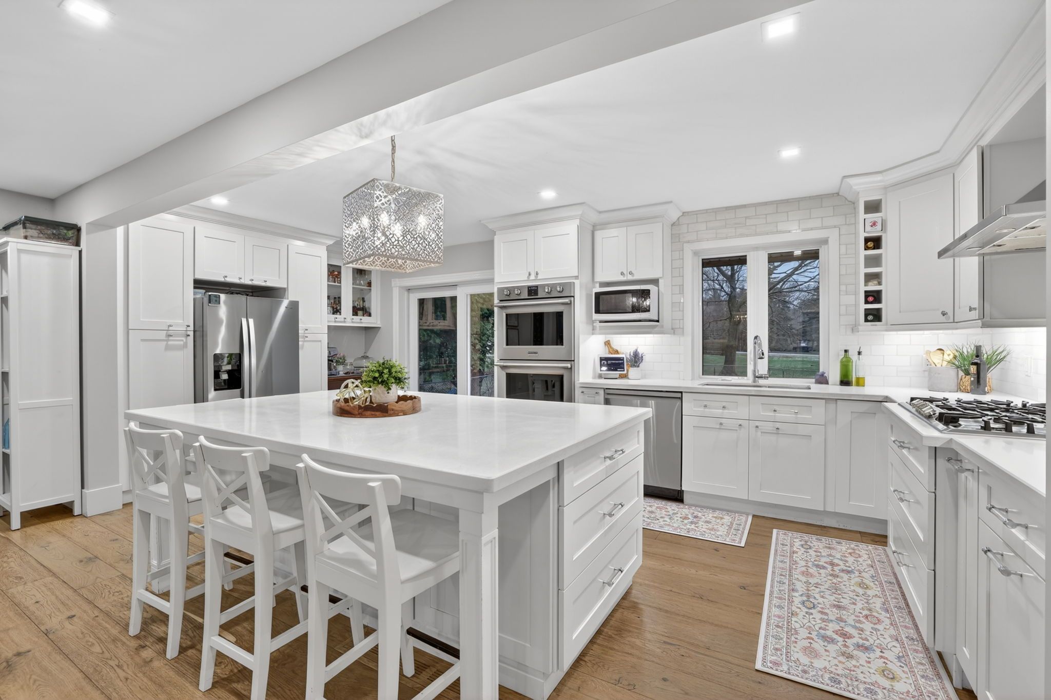 • Impressive kitchen with quartz island, double oven, and large dining area.