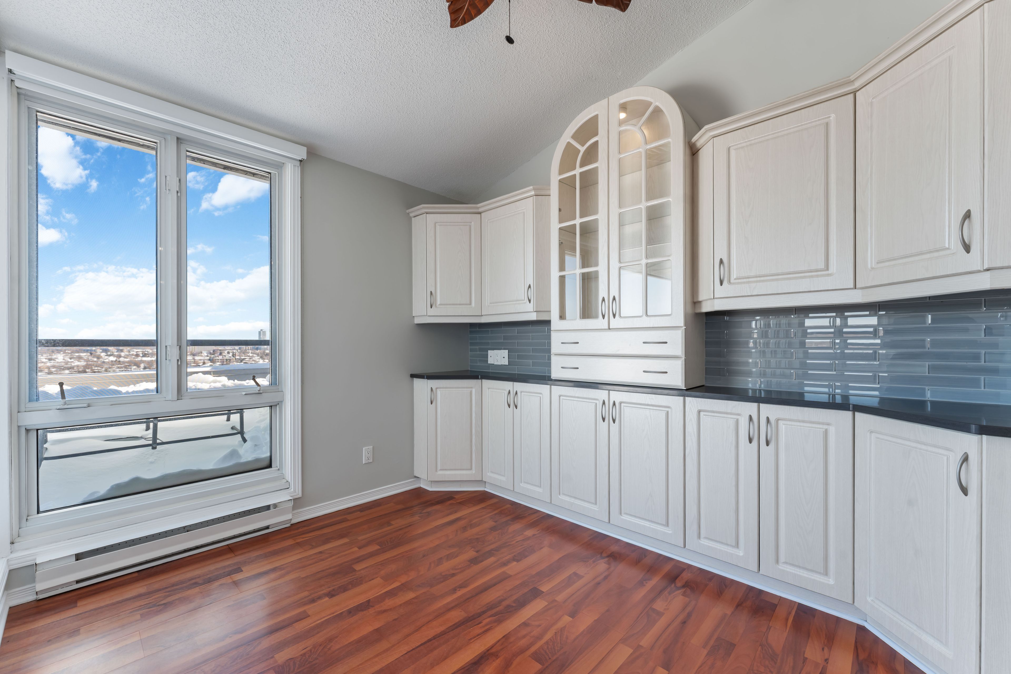 Discover downtown living at an affordable price! Blocks to riverain park & rideau river biking trails & sports club, beechwood shops, sandy hill (ottawa u), minutes to byward market, hwy 417, - bus to parliament hill at the door - this true 3 bedroom / 2 full bathroom penthouse is a bungalow in the sky! Enjoy customized living spaces with tons of built-in storage and dramatic vaulted ceilings. Open concept living, dining & kitchen surrounded by windows create a fabulous entertaining space - opening onto the 400+ sq ft terrace. (attn chefs & gardeners)! The high-quality kitchen with s/s appliances & glass backsplash is designed with pot drawers, pantry, an island, & lit showcase tower. Two full bathrooms feature built-in storage, one with jet tub and one with shower. Main light fixtures have been upgraded to led pot lights on dimmers. Enjoy your new hvac mini split (programmable b/board heat still in place). The second bedroom includes a rich built-in desk and murphy bed, providing exceptional flexibility (work at home or guest suite). Bedrooms have big closets & main closets have mirrored doors. Enjoy the seasons (new deck) from your private & partially covered terrace - dramatic sunrises & sunsets & sweeping views of the gatineau hills, ottawa river at st. Patrick st bridge overlooking beautifully treed surroundings. Gardening is easy with hose hookup. Large private locker above unit, and underground parking space. The complex features on-site management & superintendents, gorgeous gardens, visitor parking; the resort lifestyle amenities include large salt water pool, sauna, gym, party/meeting rooms, library, two e-charging stations, & access to shared vehicle service, convenience store, personal services shops such as nail/hair/barber studios, cleaning service, & computer firm. Across the street from loblaws & green fresh with public transit at the door. Freshly painted, professionally cleaned & available immediately.