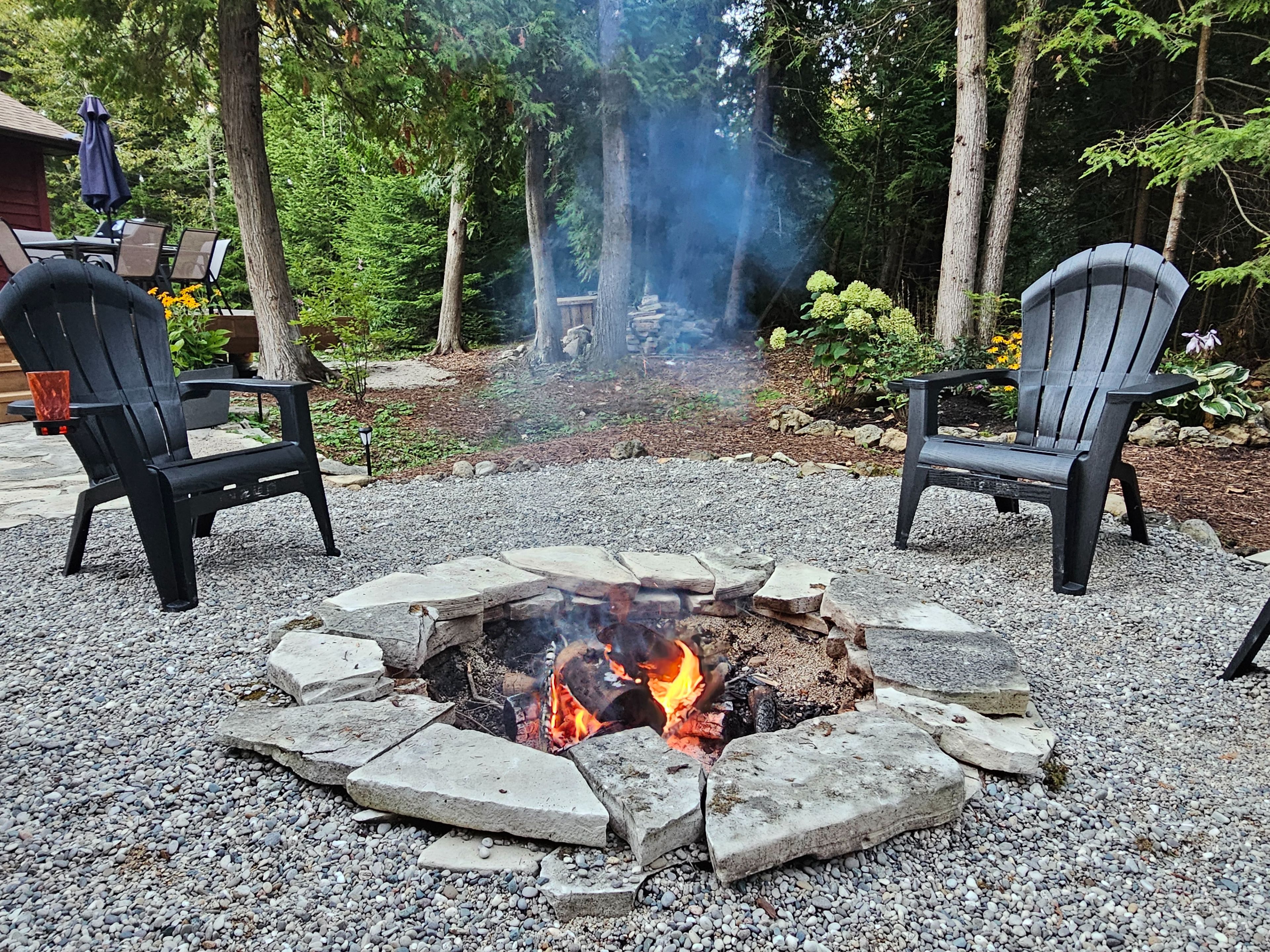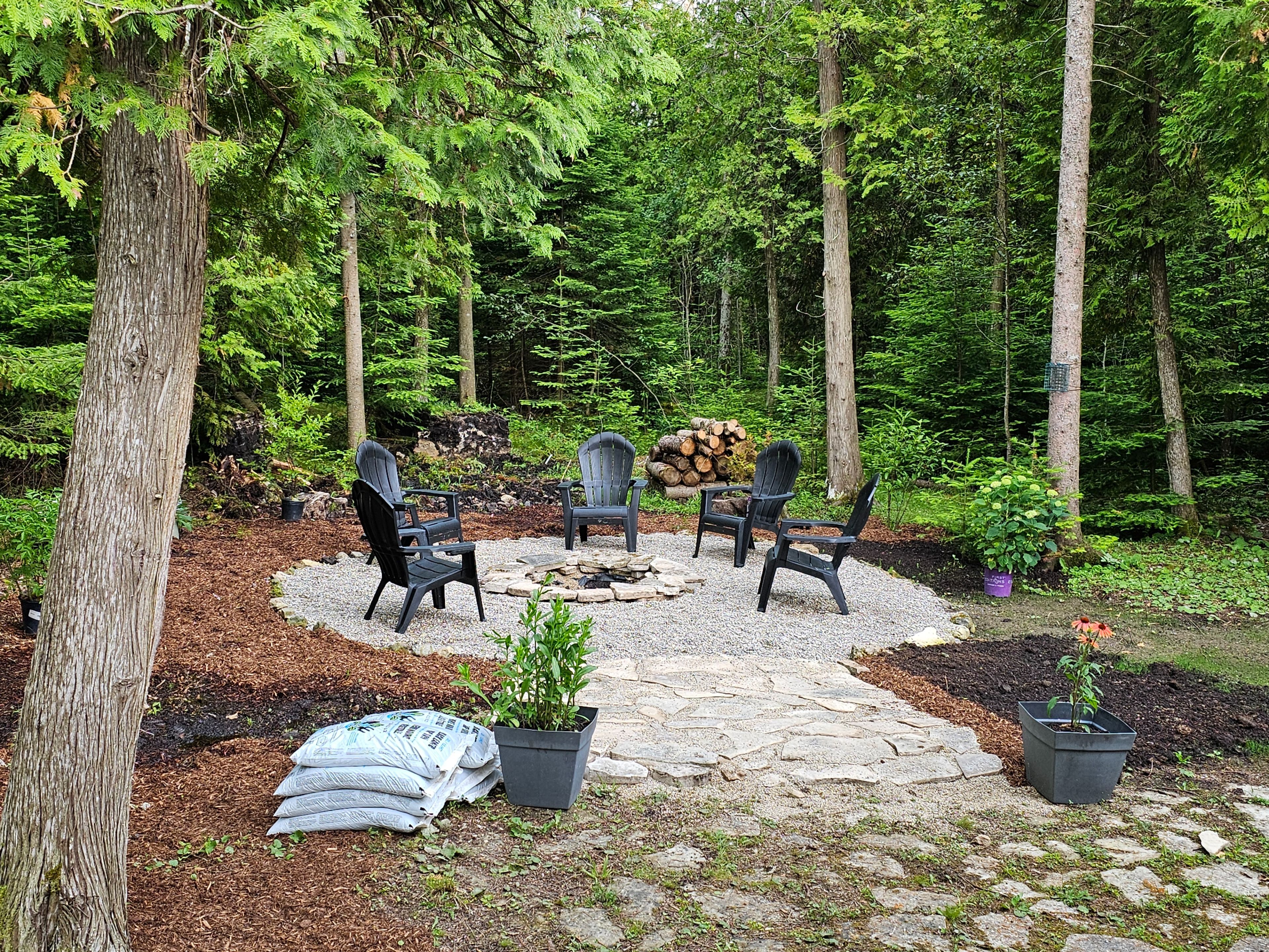 • Beautifully landscaped gardens and a cozy firepit area outdoors.