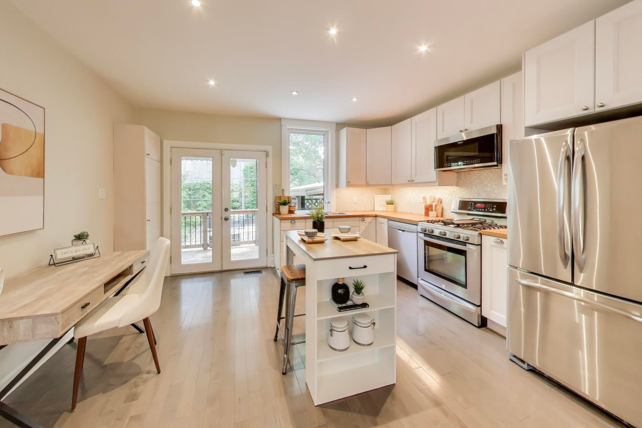 • Modern kitchen features natural wood countertop and stainless steel appliances.