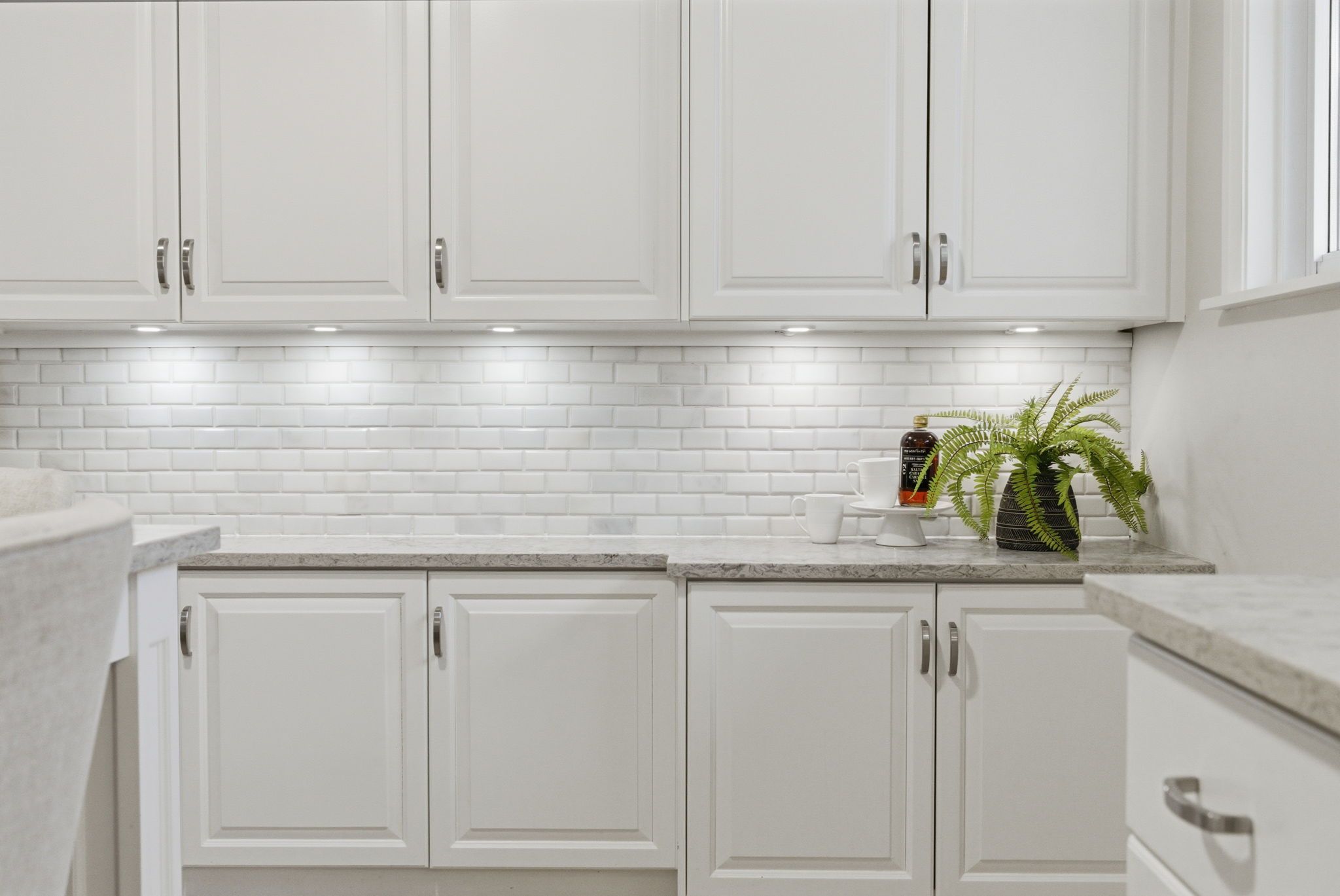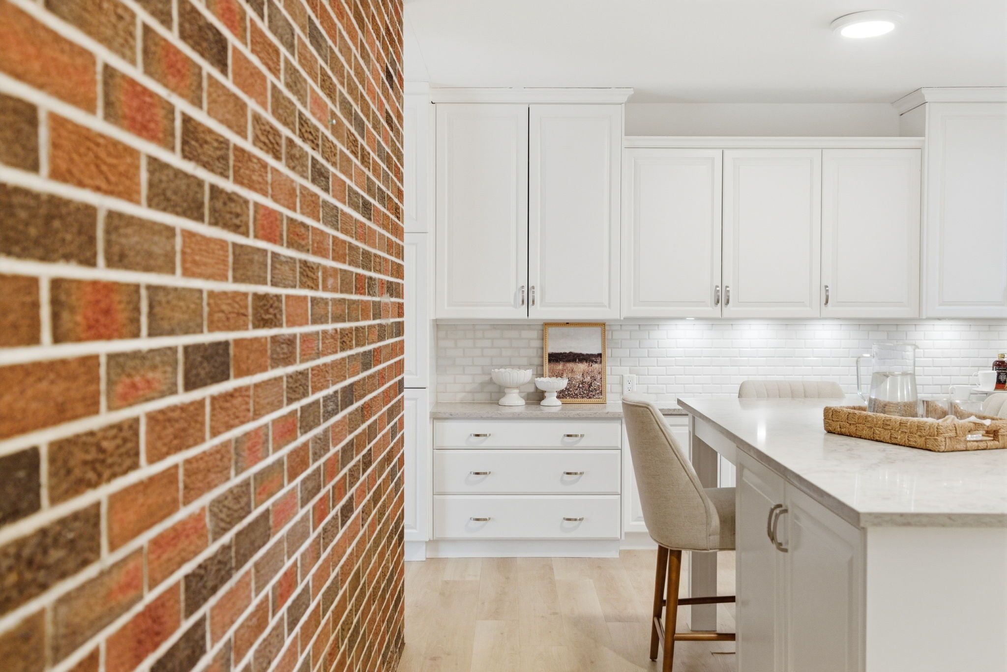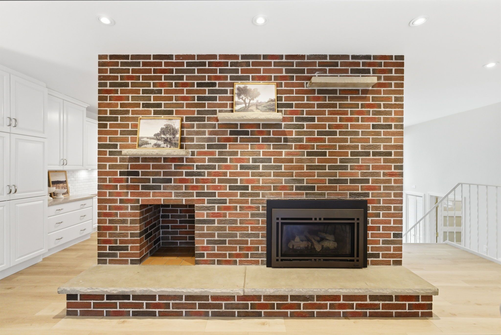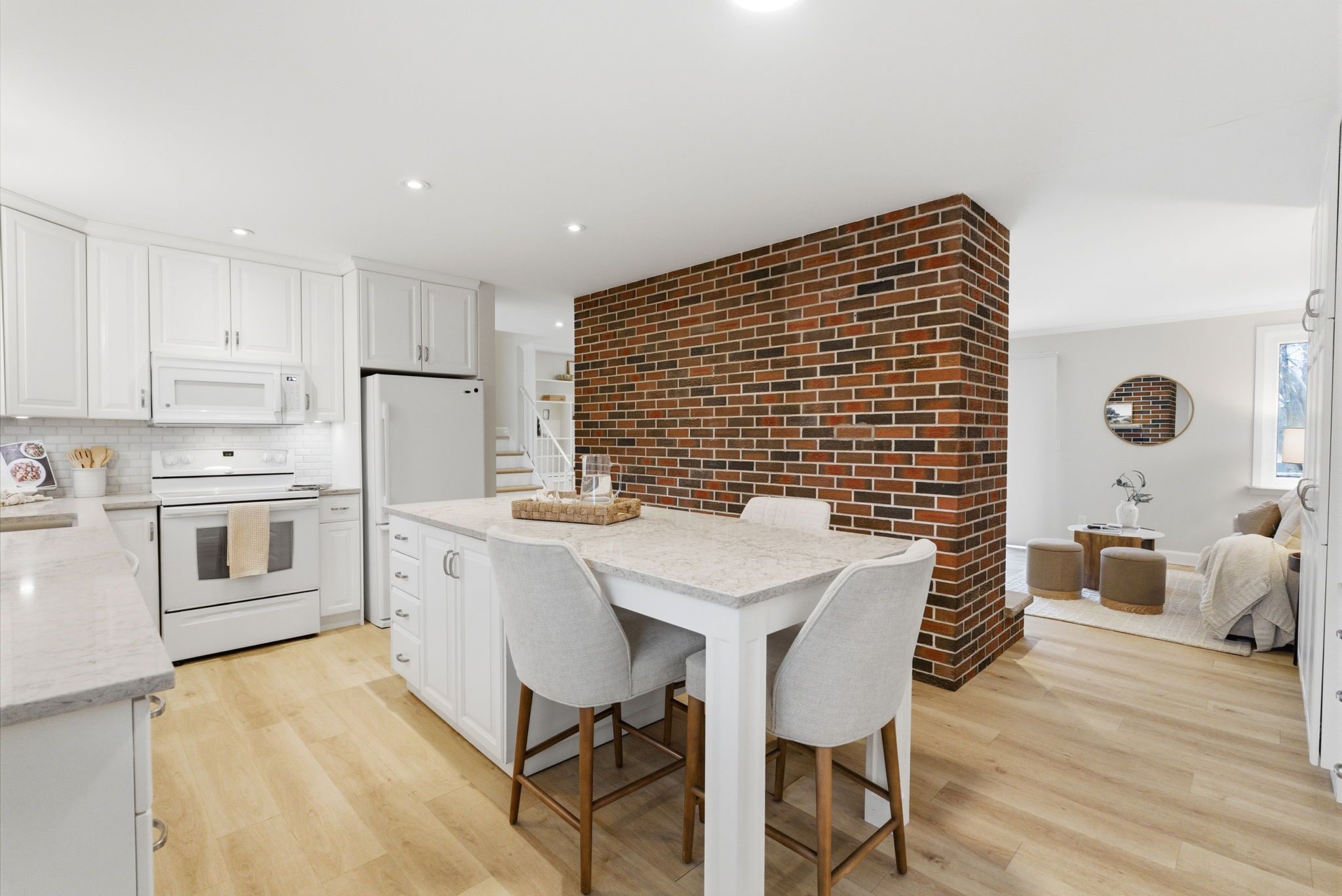 • Renovated kitchen features quartz countertops and extensive cabinetry space.
