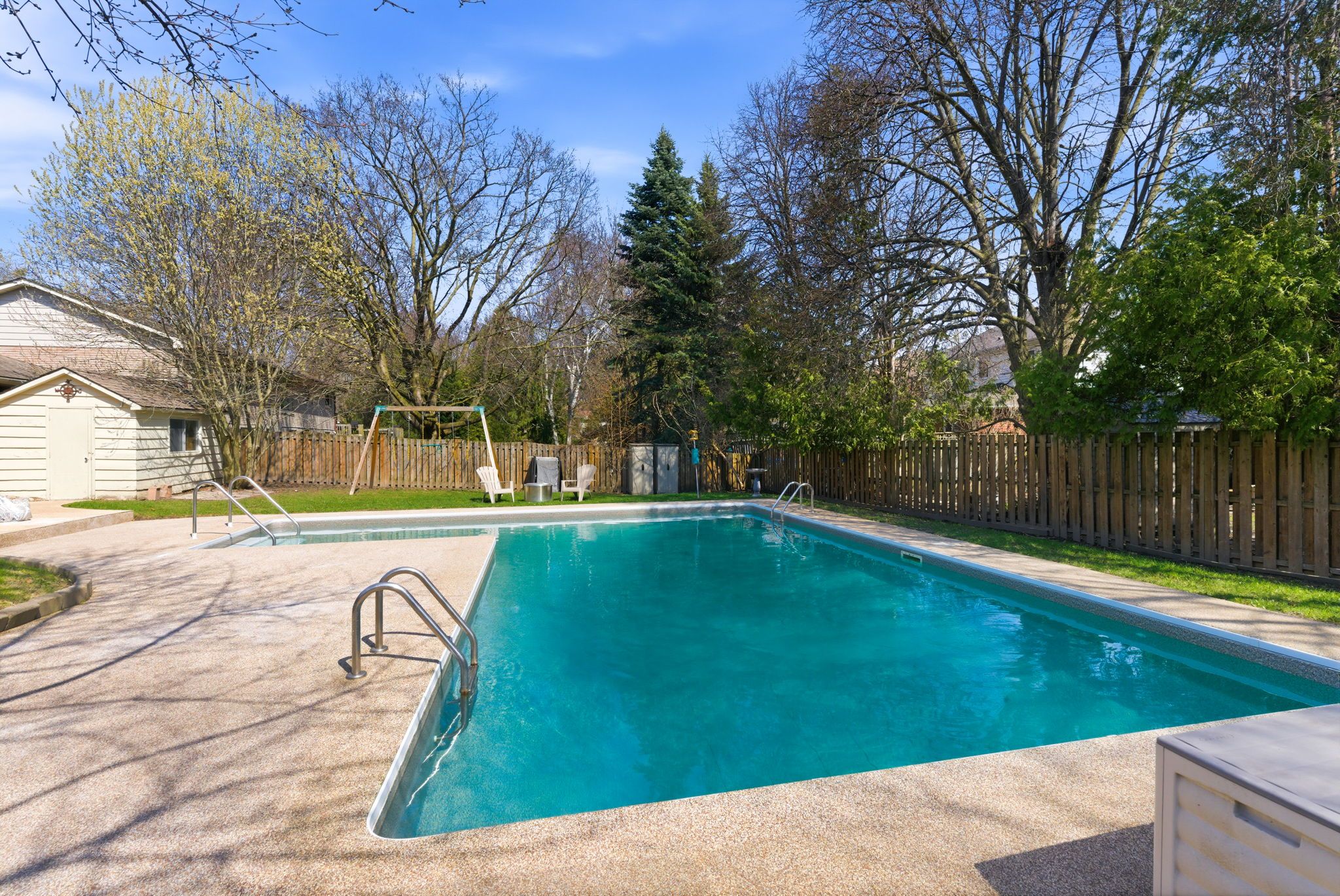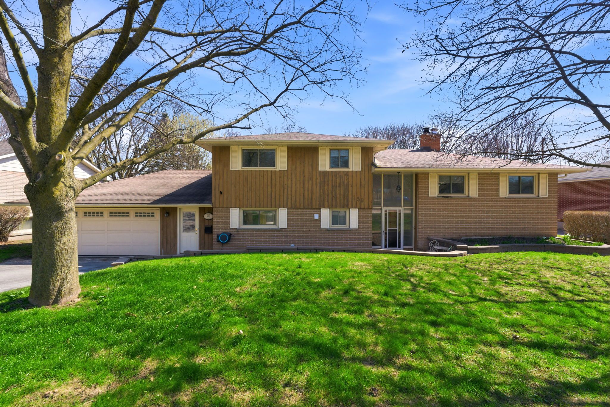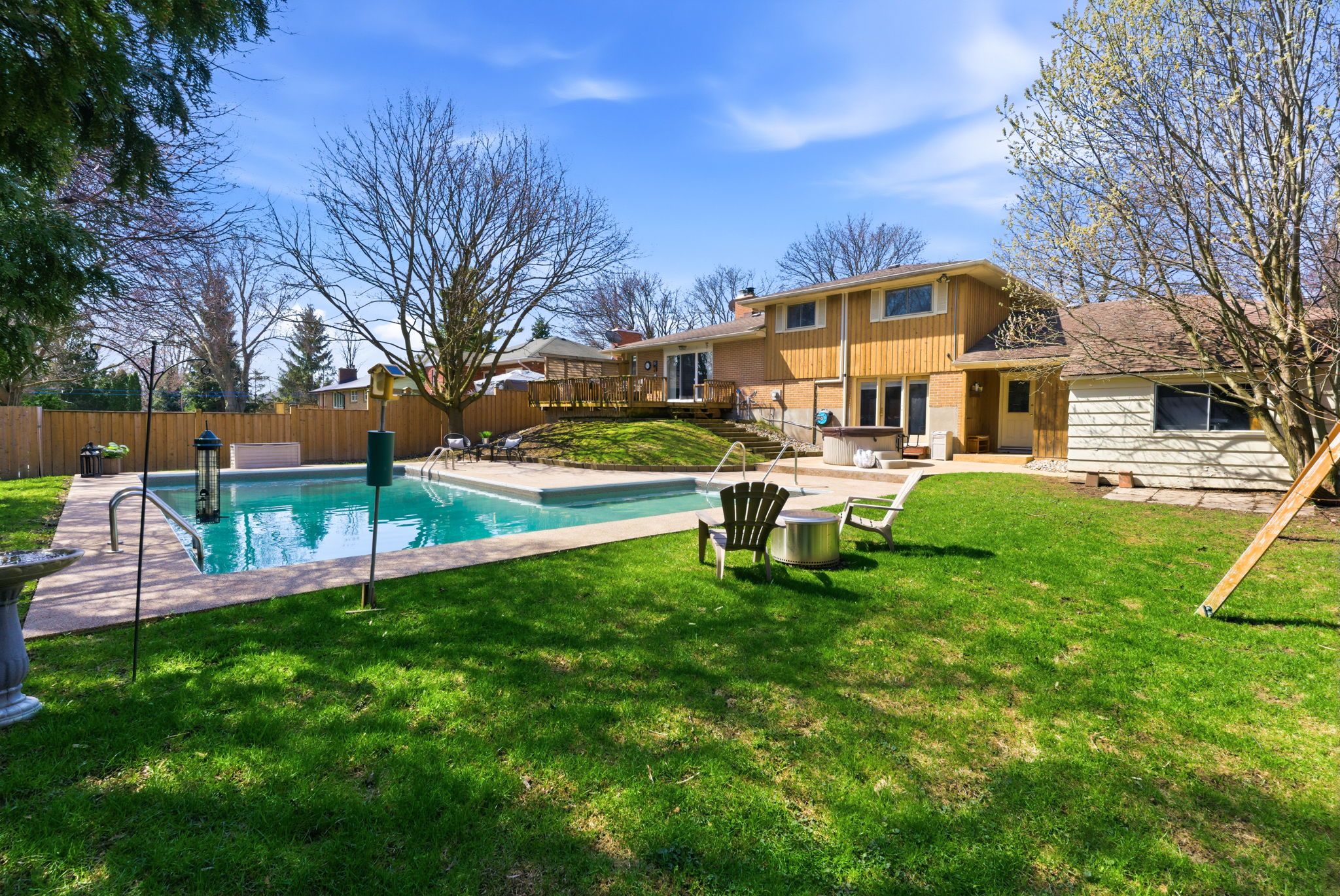 Set on an exceptional 85 x 135 ft private lot, this custom four-level side split delivers a backyard experience rarely found in the city! Wrapped in mature trees and featuring a massive heated saltwater inground pool, completely refurbished with new rubber-top surfacing, updated landscaping, and a safety cover. In pool season, you are in complete privacy! This feels like country living, right in bowmanville. The home itself embraces a mid-century modern aesthetic and has been very well maintained. The foyer makes a statement with double-height ceilings and strong architectural presence. The main level features a renovated kitchen with quartz countertops, extensive cabinetry/pantries, and a large centre island with seating. A striking floor-to-ceiling brick fireplace anchors the space and separates the kitchen from the open living and dining area, where original built-in cabinetry adds character and charm. A sliding glass door walkout leads to a private deck overlooking the pool, complete with a louvred privacy wall. Upstairs are 3 well-sized bedrooms and a spacious bathroom with a separate soaking tub and walk-in glass shower. The ground level offers an impressive family room with gas fireplace, walkout to the yard and hot tub area, a two-piece bath, laundry, and access to a large mudroom and breezeway connecting to the double garage. The bonus basement level adds a third living space with gas fireplace, bar area, and a 4th bedroom. Highly efficient 3. 5-ton heat pump system with 5 control zones provides heating and cooling throughout. Two gas fireplaces add comfort and warmth. Updated flooring. Freshly painted. Updated modern lighting. Double garage, four-car driveway parking. A walkable location near historic downtown bowmanville shops, restaurants, and it's famous seasonal festivals complete this beautiful property!