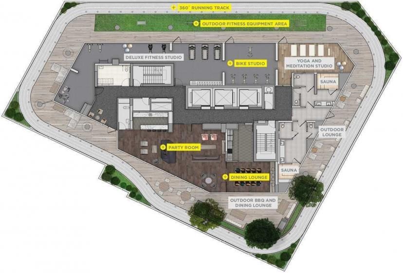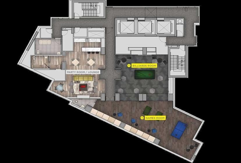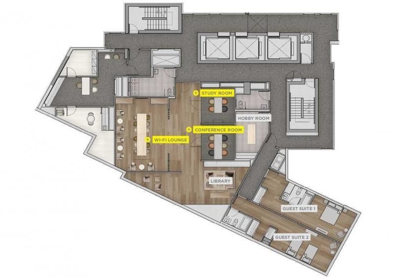 • Amenities include gym, yoga room, library-study, and multiple recreational spaces.