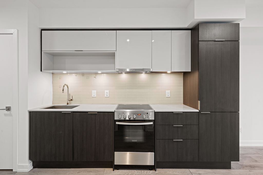 • Open-concept layout connects modern kitchen to living and dining areas.