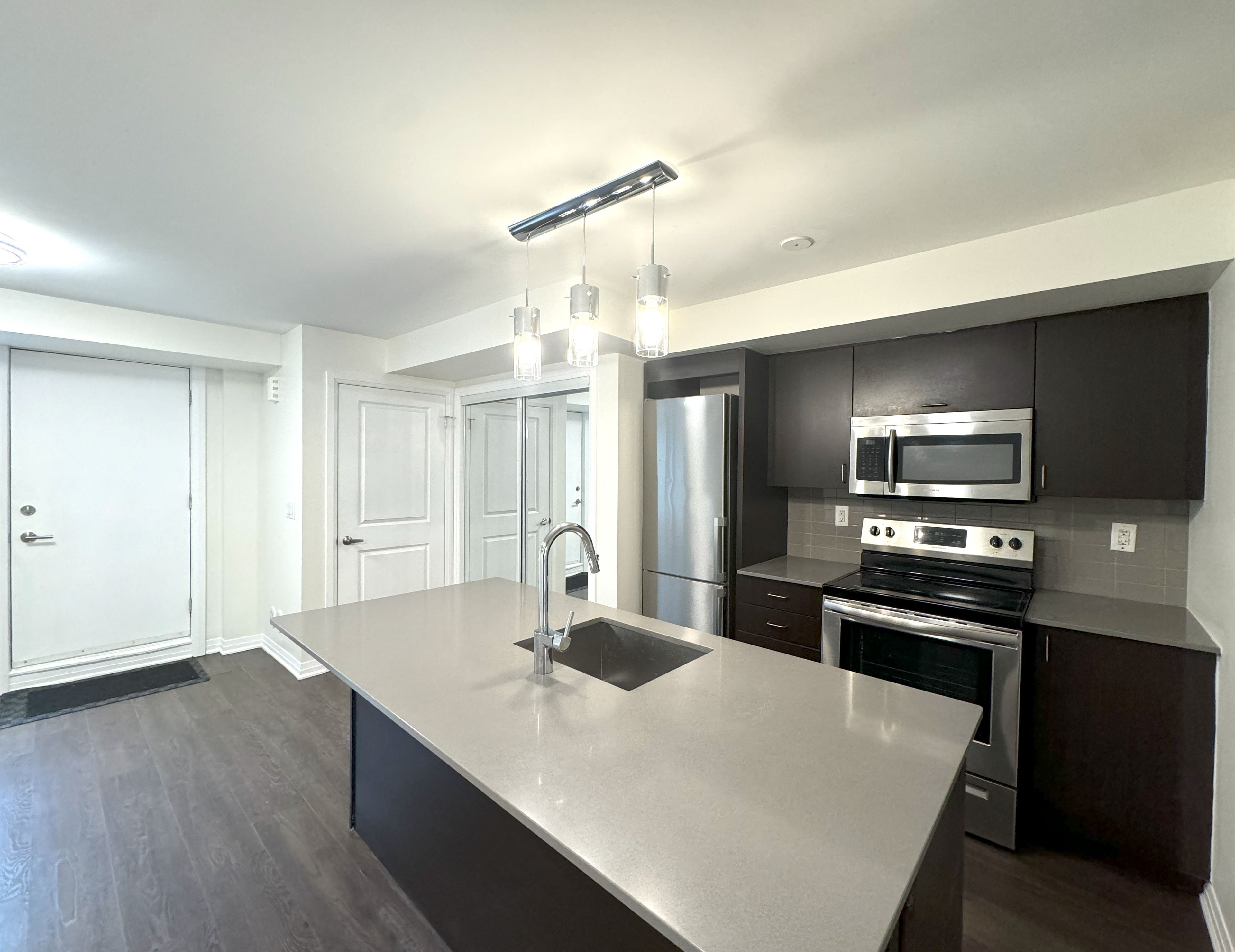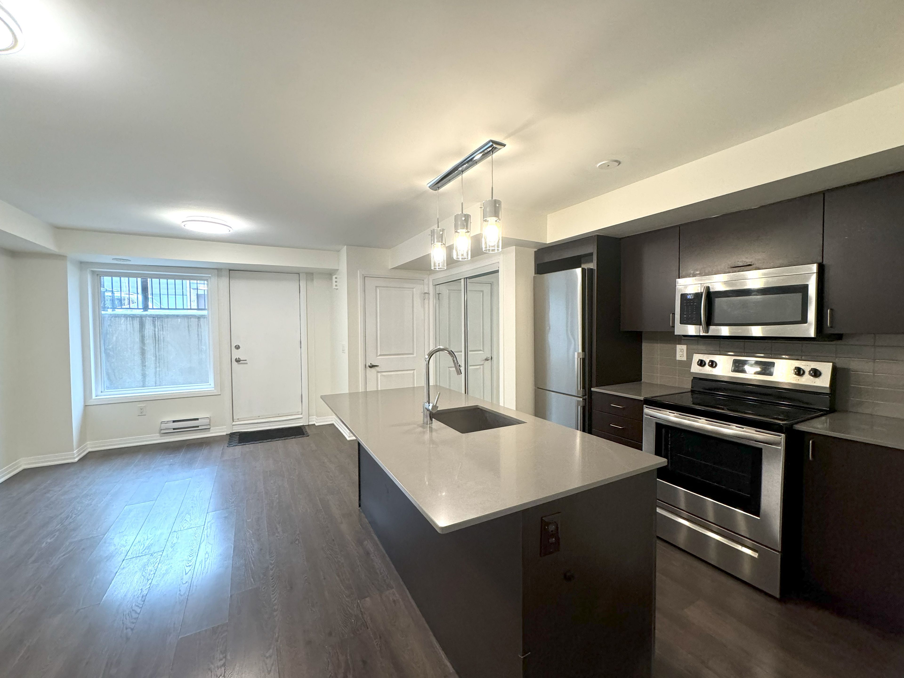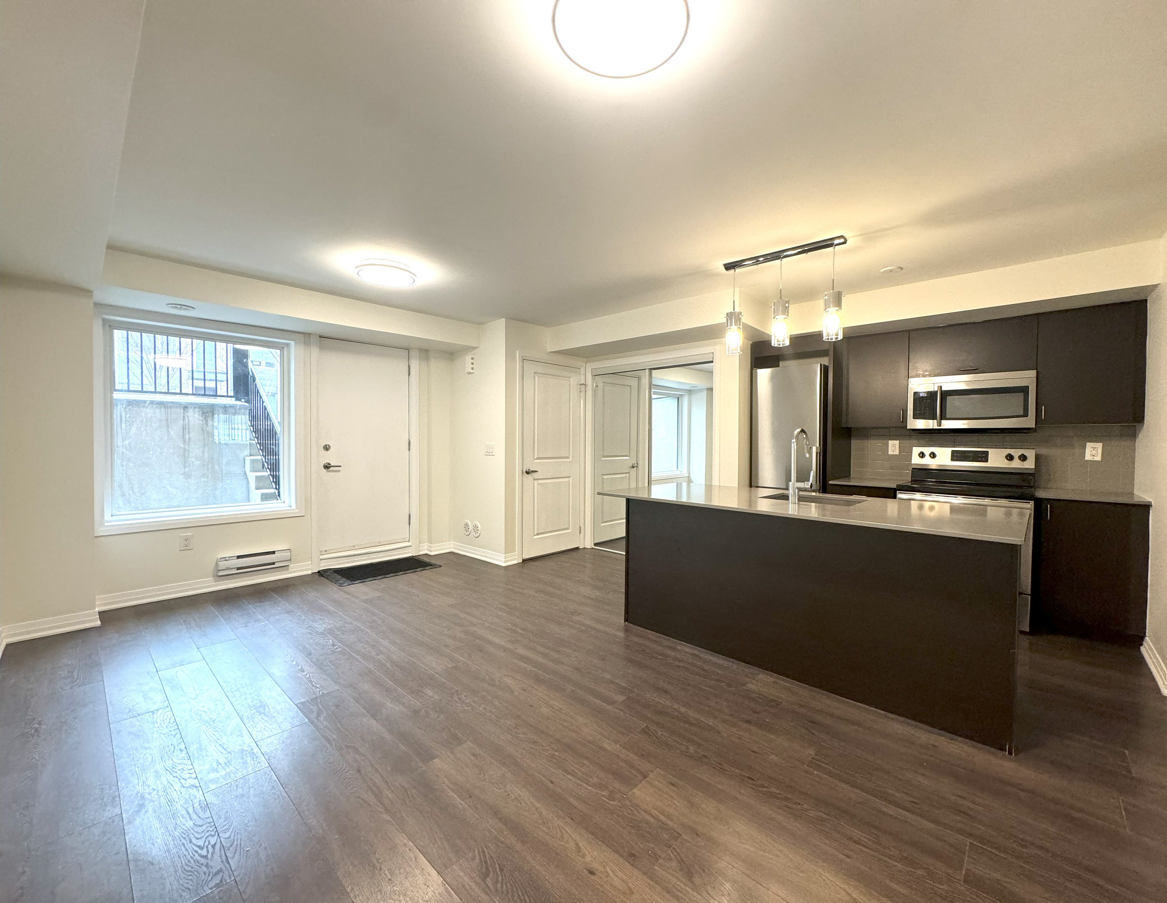 Inside downsview park! Freshly painted, upgraded light fixtures, inside downsview park, rare floor plan of 2 bedroom + full size den. 1 washroom, 1 parking. Front and rear patio, open concept with laminate flooring, large kitchen island, stainless steal appliances, full size laundry machines. Shuttle to subway station. Walk to the park, pond, playgrounds, & farmers market. Mins from york university, yorkdale shopping centre, local eateries, and more! Enjoy all the city has to offer with a community feel.