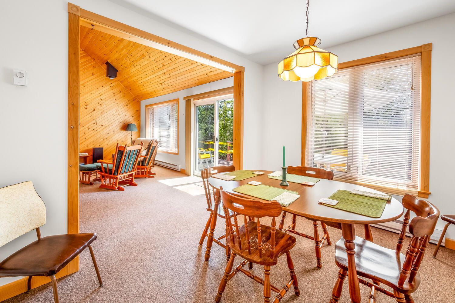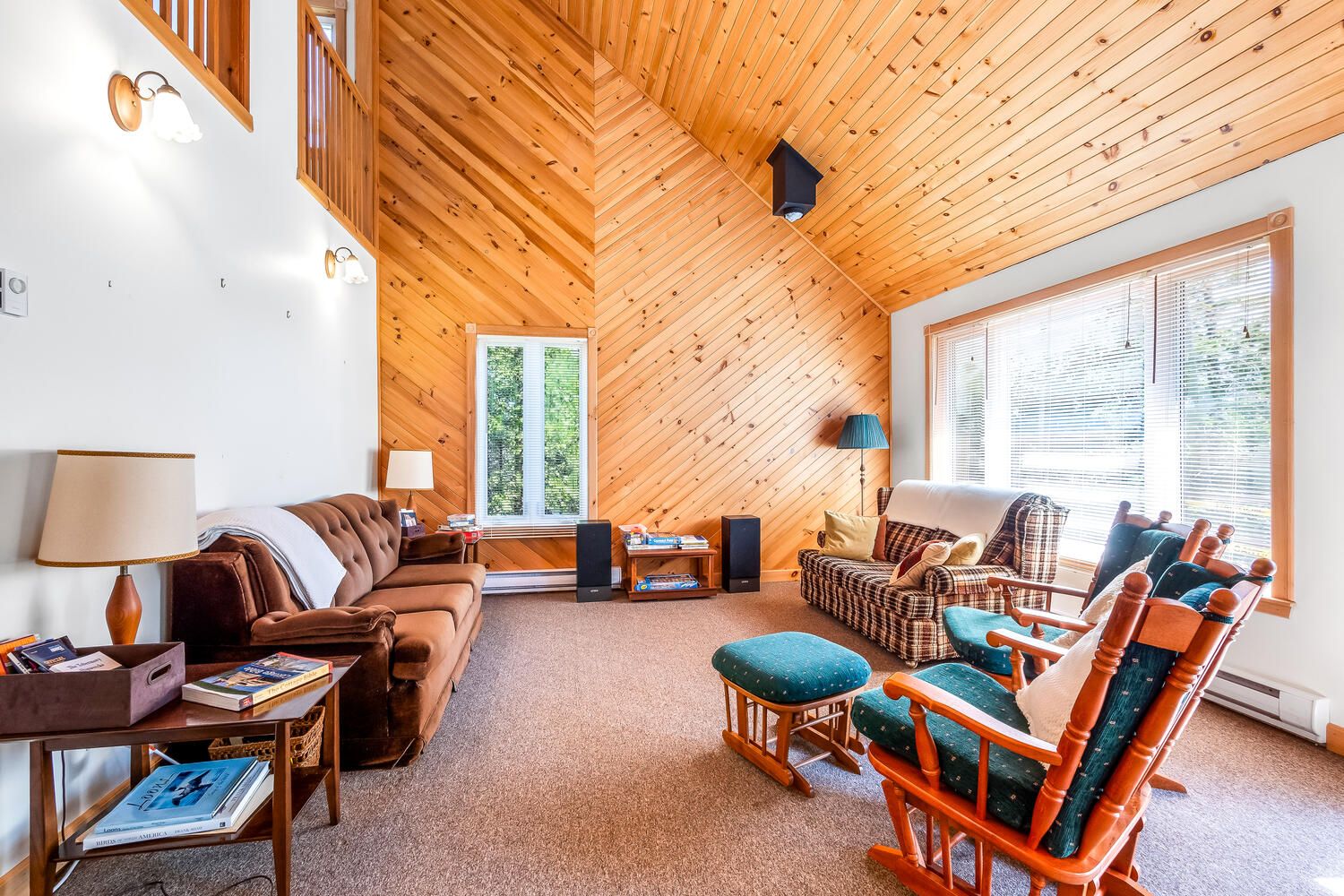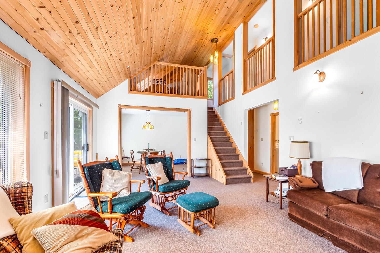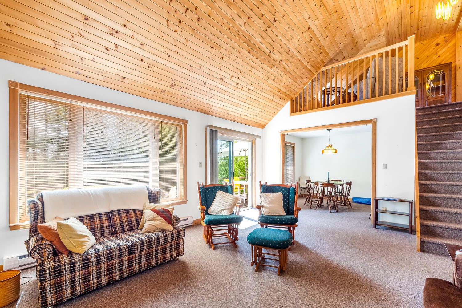 • Bright living room with vaulted ceiling opens onto a spacious deck.