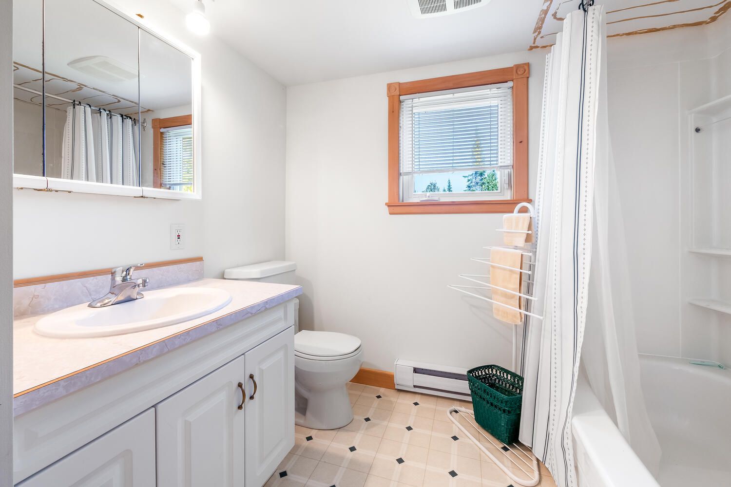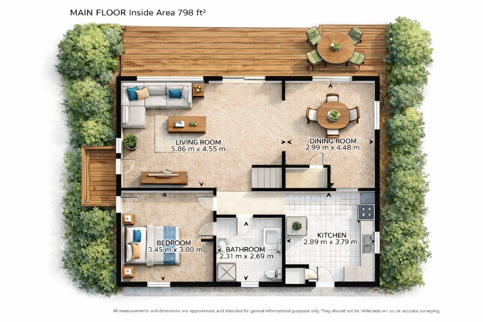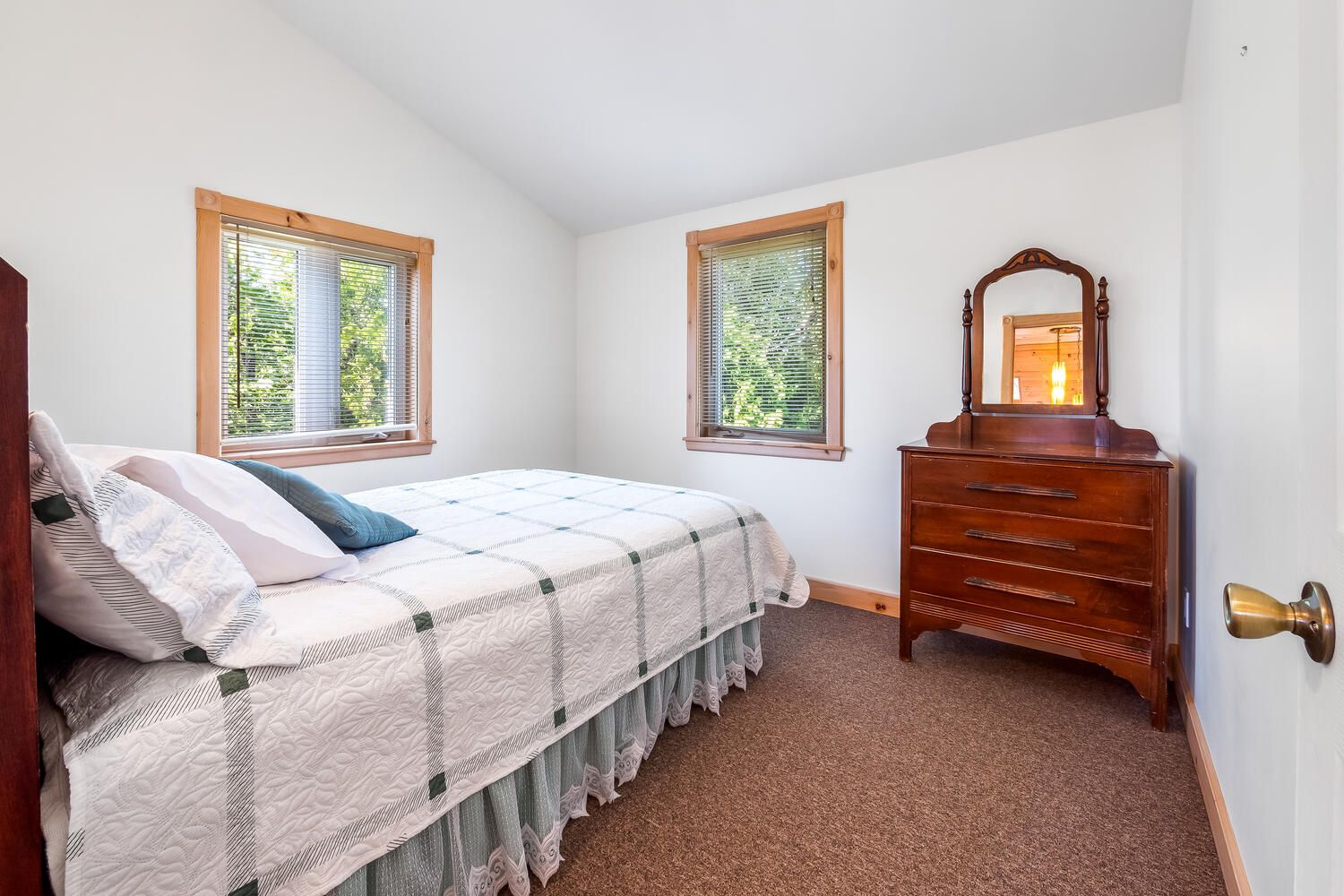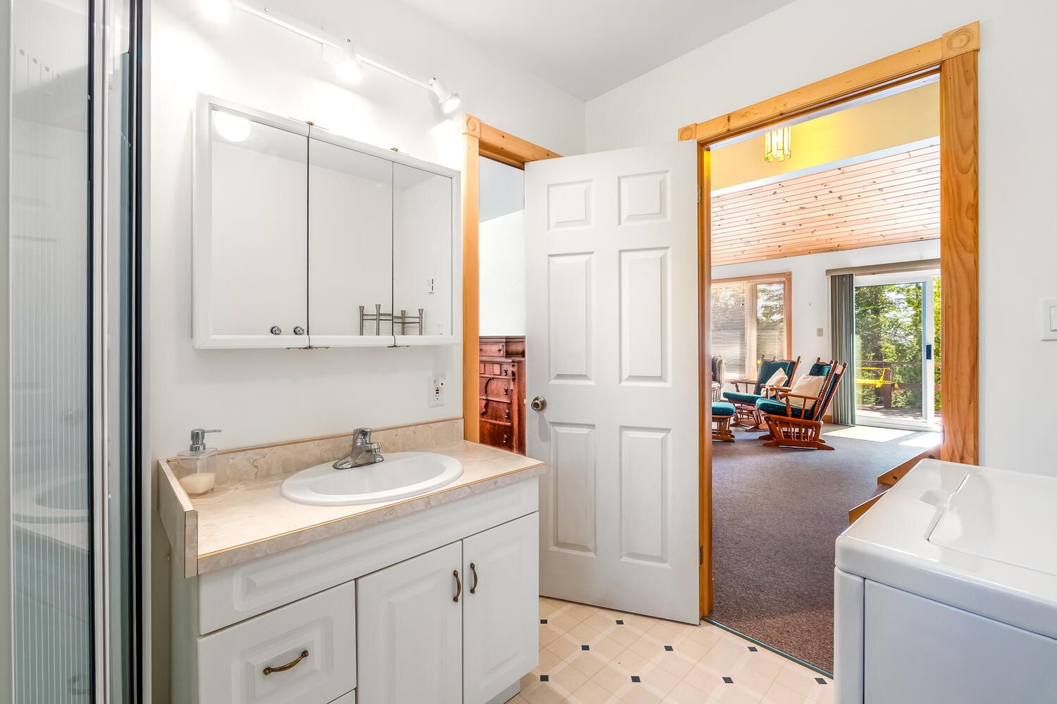• Bright living room with vaulted ceiling opens onto a spacious deck.