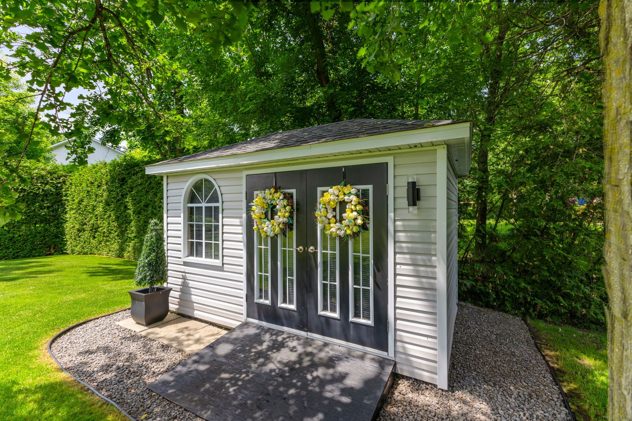1591 stephanie anne drive invites you to enjoy luxurious living on a peaceful, treed corner lot surrounded by manicured 20-foot hedges for privacy and set back from the road in one of greely's most established and coveted communities. The main floor opens with a grand foyer boasting vaulted ceilings, ceramic tile and gleaming hardwood floors. Anchored by a gas fireplace with soaring 13-foot ceilings, the living room exudes warmth and grandeur, while the separate dining room sets the stage for memorable gatherings. The spacious designer kitchen is perfect for hosting and features quartz counters, stainless steel appliances, and a large central island with seating. A bright adjoining eating area with oversized windows extends to a private backyard and two-level hardscape patios, perfect for morning coffee or evening relaxation. The primary suite offers a walk-in closet, additional wardrobes, and a luxurious 5-piece ensuite. A spacious secondary bedroom and beautifully finished full bath with striking shower tile complete the main level. (3 bathrooms include quartz counters). A striking circular staircase leads to the lower level, where the soundproof theatre takes centre stage with two level seating and cinematic scale. Complementing this is an expansive recreation room with a center gas fireplace, an additional bedroom (currently being used as a gym) with wall-to-wall closet, a home office, a sleek full bath, and a laundry room. This custom home crafted with enduring steel construction, sweeping circular 21 vehicle driveway to the oversized two car garage, and underground irrigation system impress across the manicured property, while the large custom storage shed offers unmatched convenience. Successful inspection reports completed july 2025 (home, well and septic) available upon request. Minutes from schools, parks, shops, and nature trails. This home delivers greely's tranquility with modern luxury and unforgettable entertainment at home with family and friends.