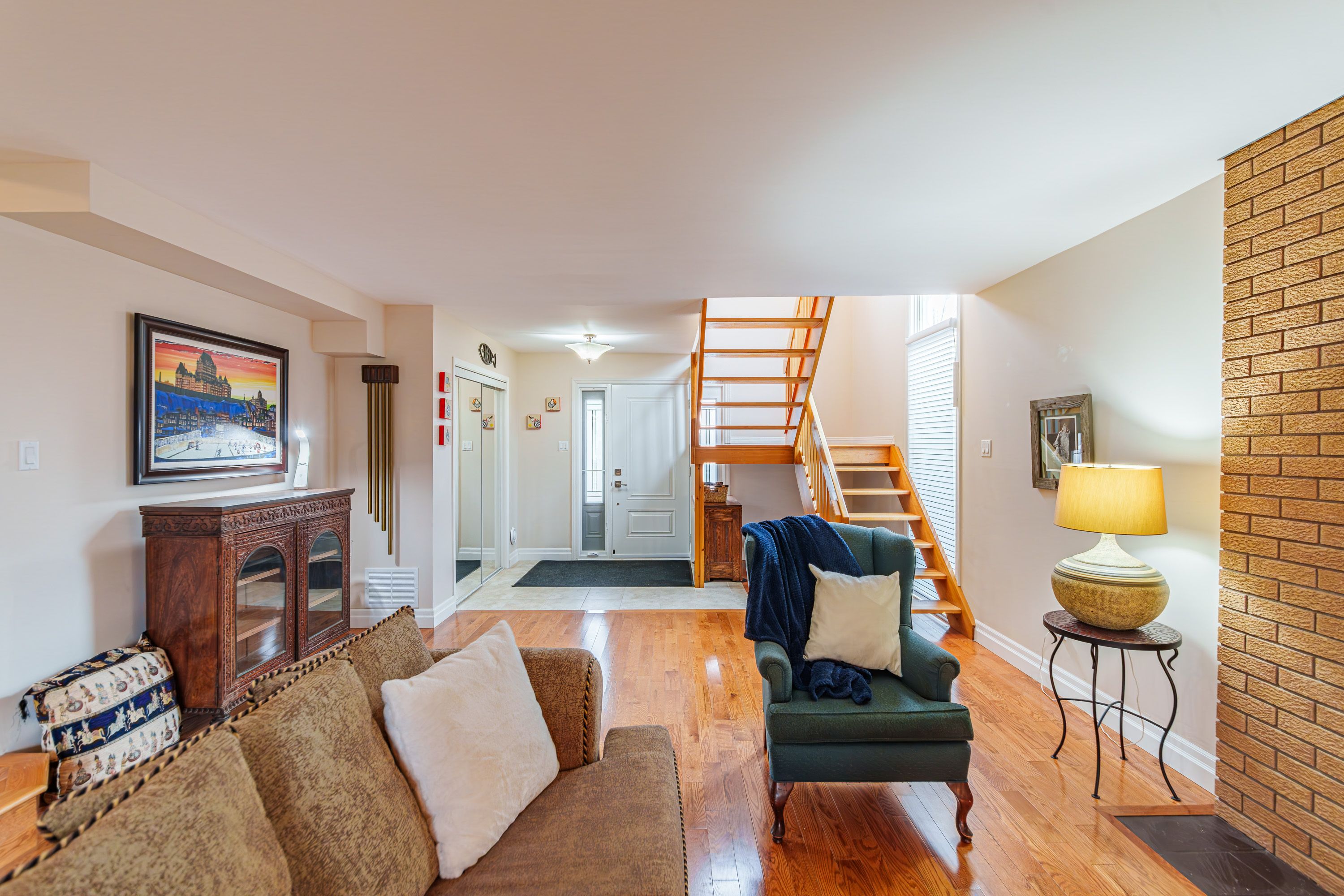 • Cozy living room with fireplace, perfect for gatherings and relaxation.