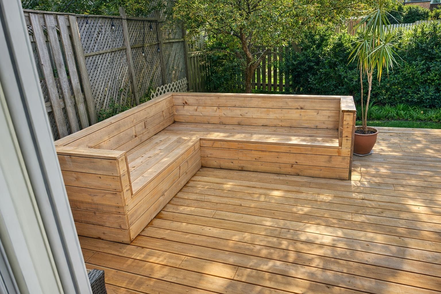 • Custom-built deck with seating, perfect for summer evenings.