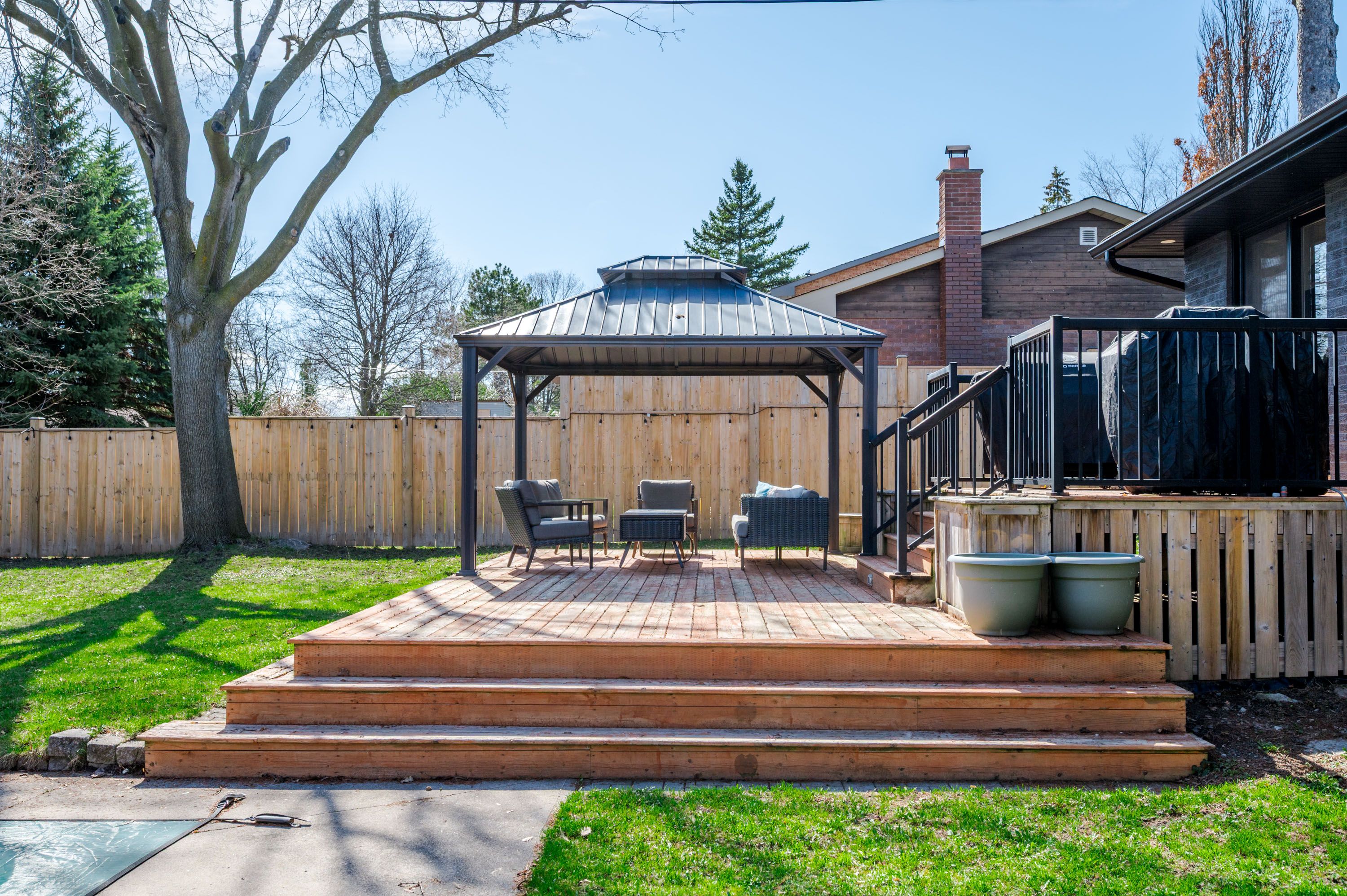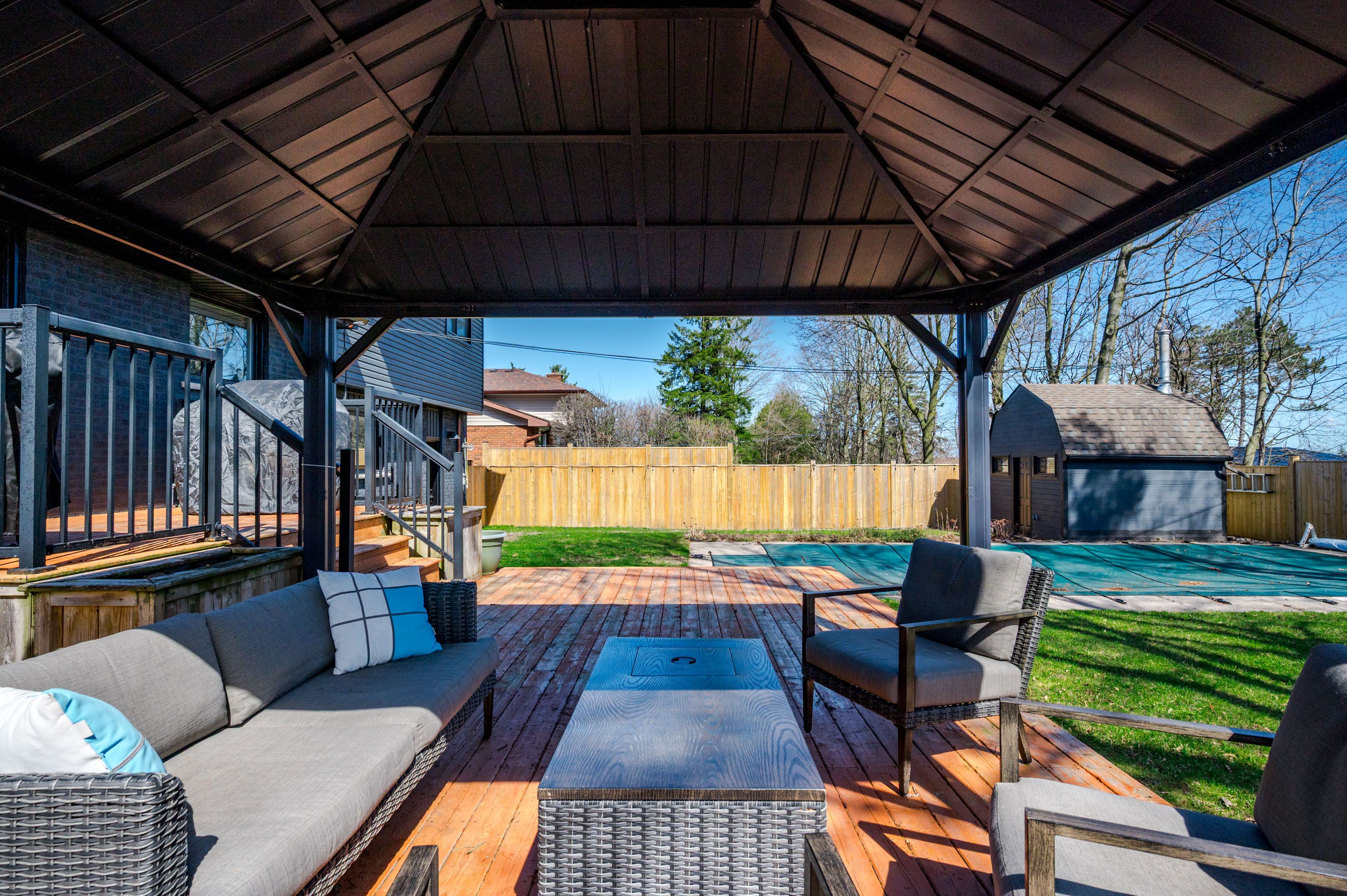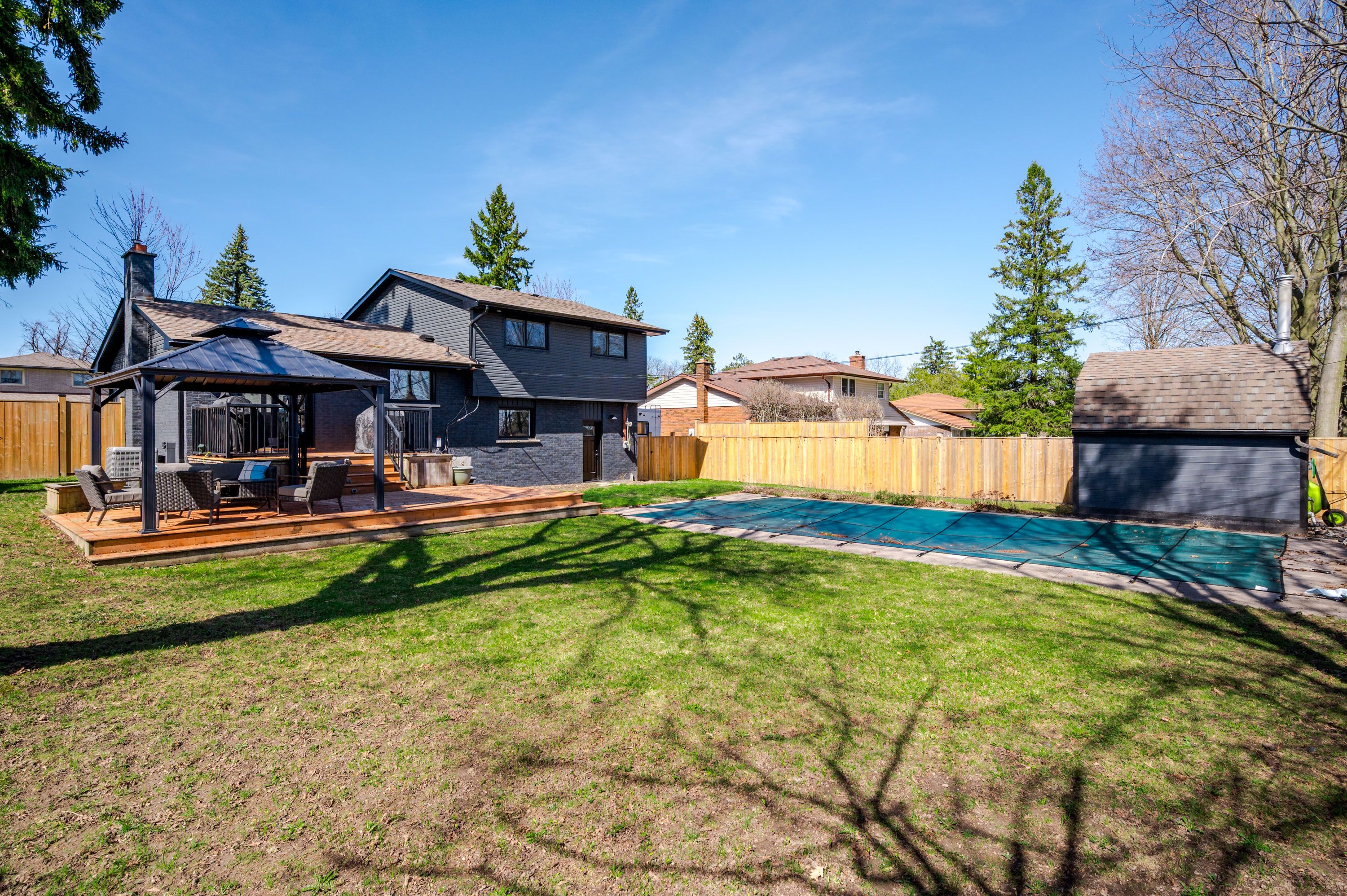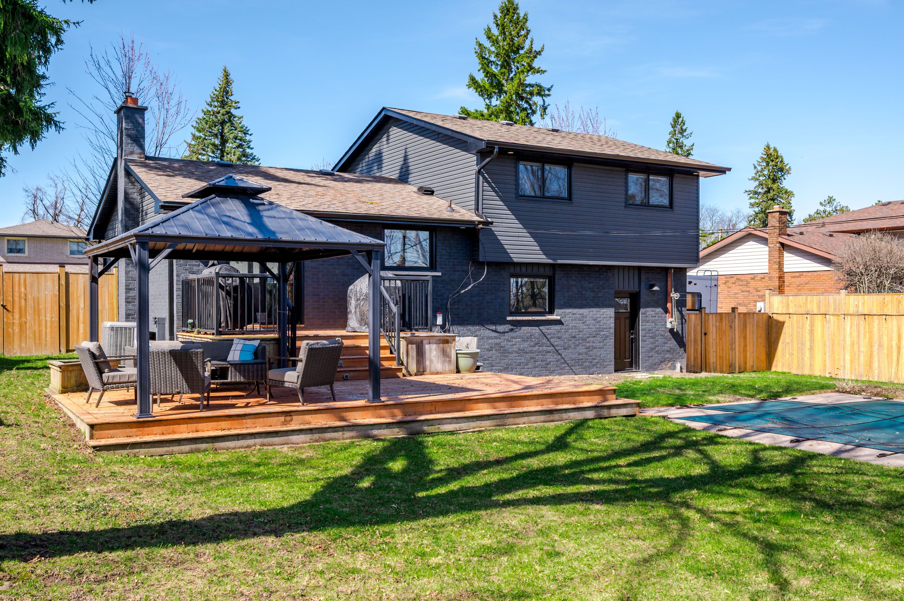 • Beautifully landscaped backyard with a heated in-ground pool and gazebo.