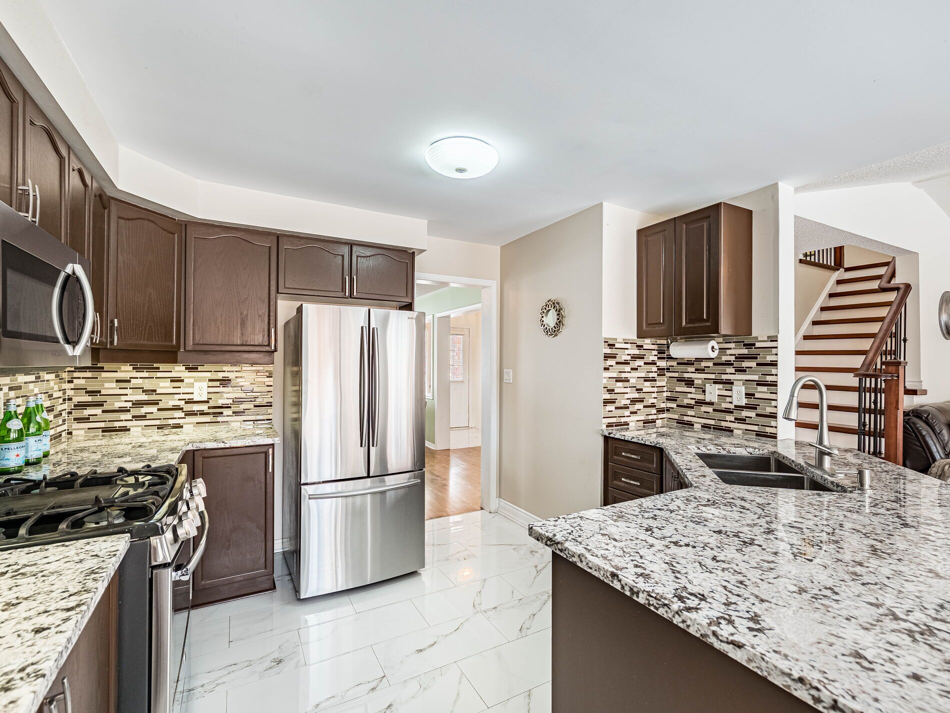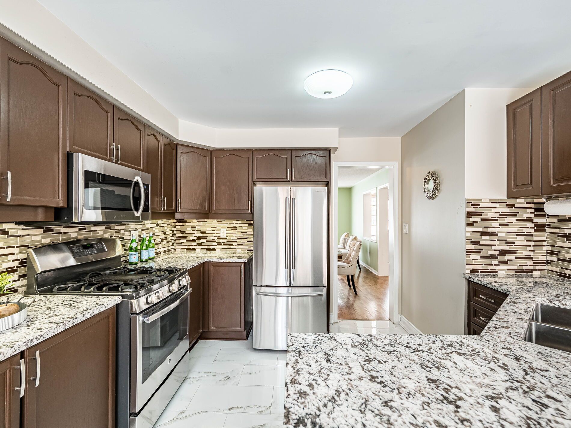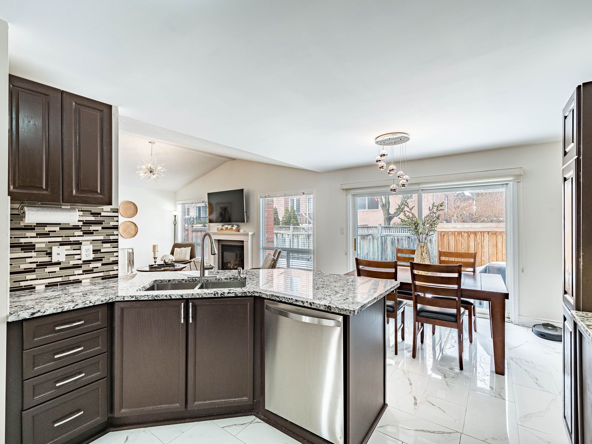 • Chef's eat-in kitchen with granite countertops and a walkout to the backyard.