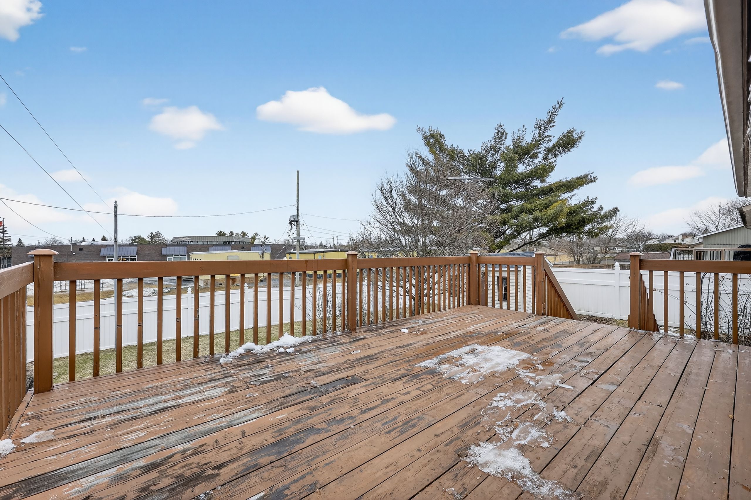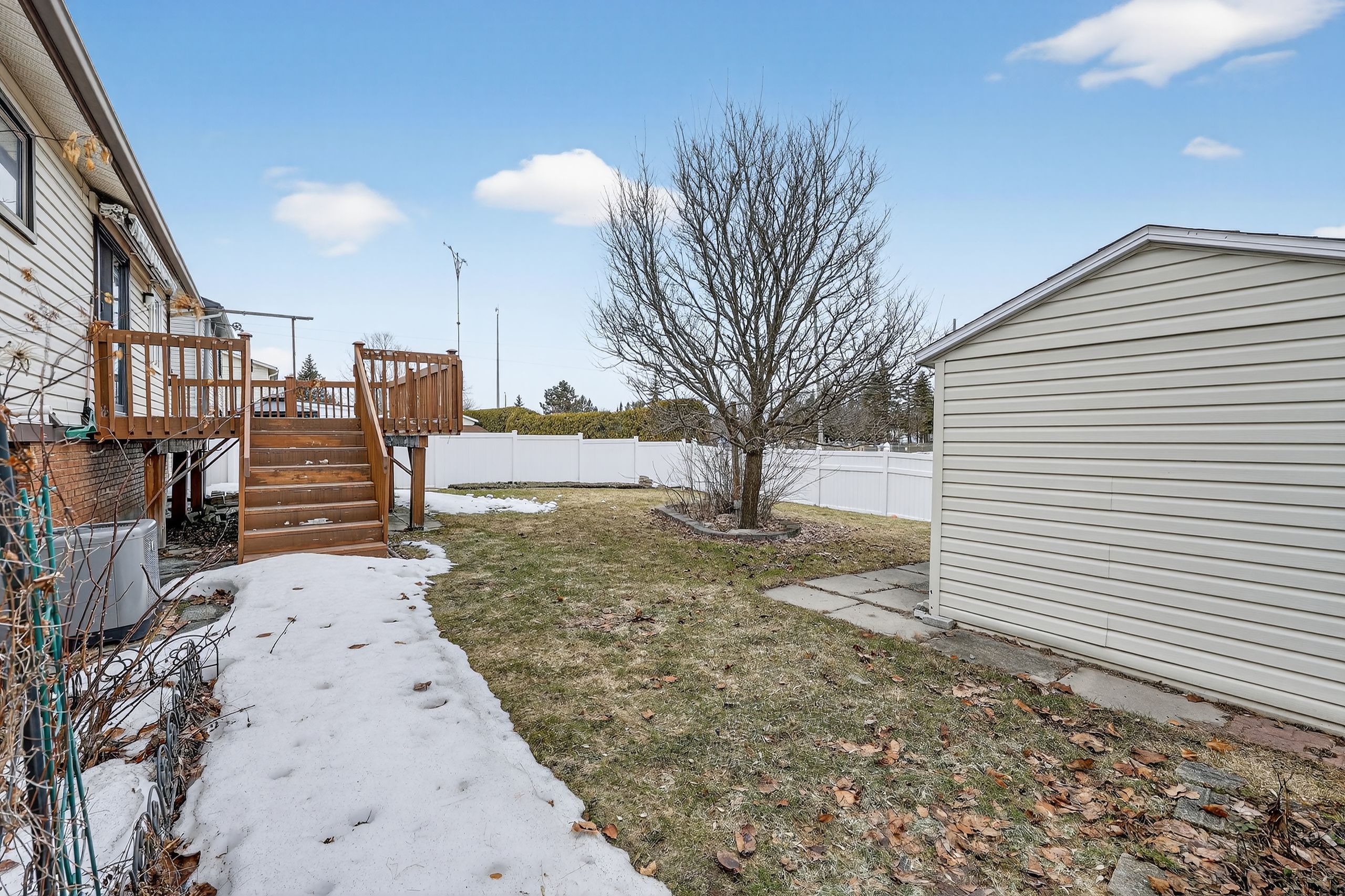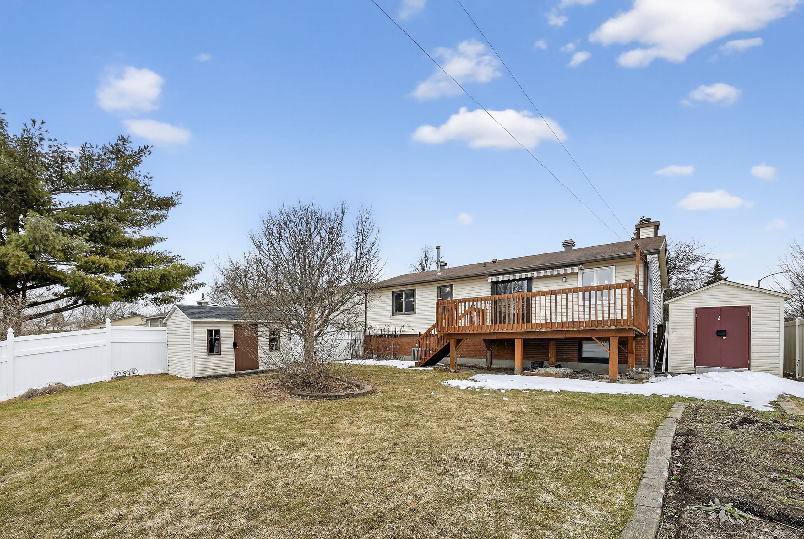 • Private fenced yard featuring a large deck and storage sheds.