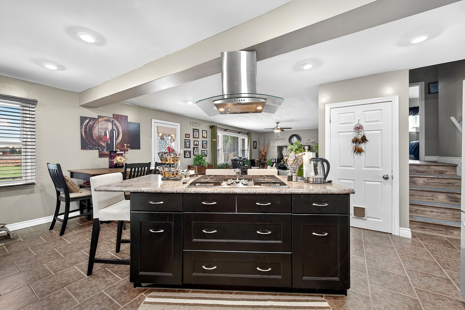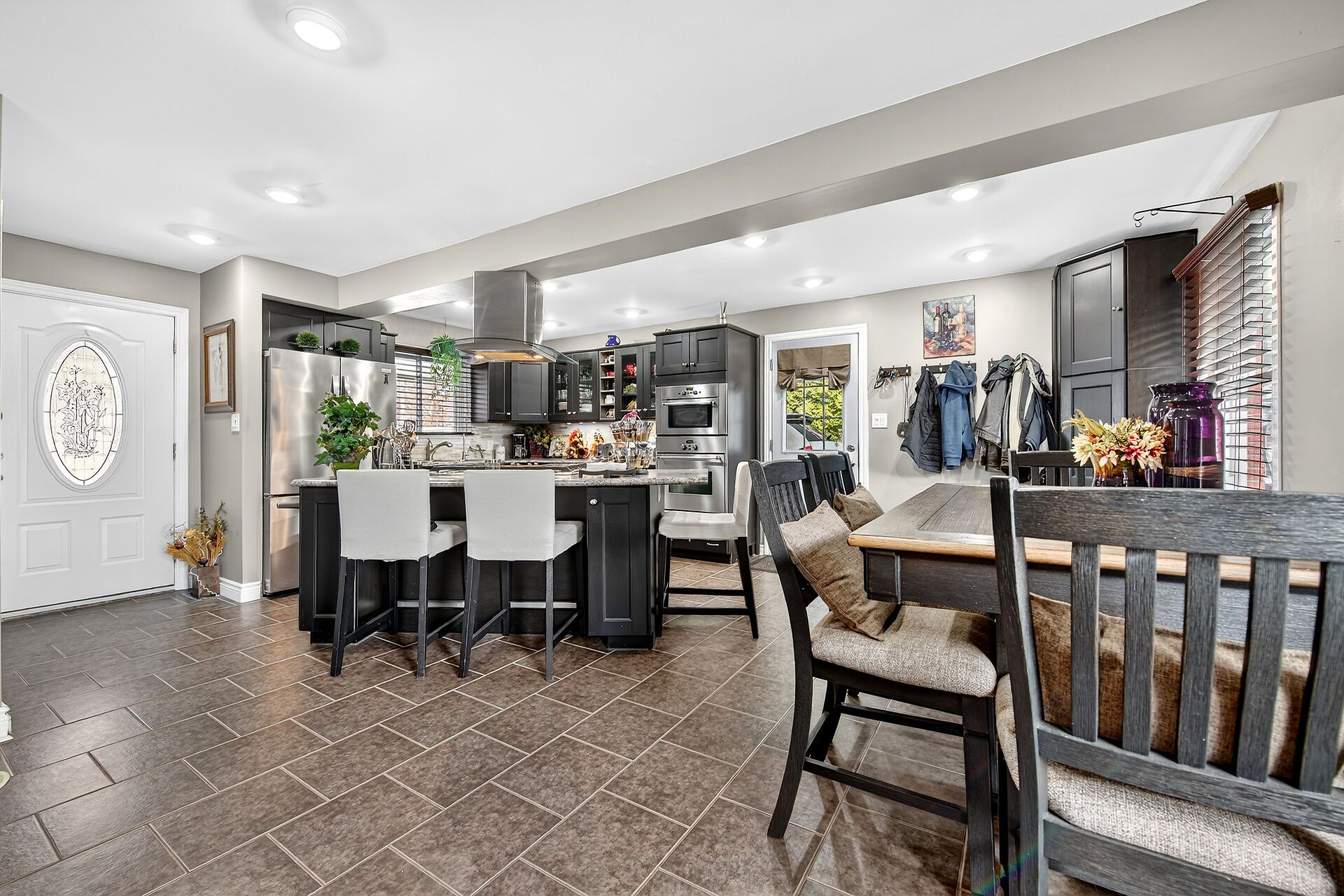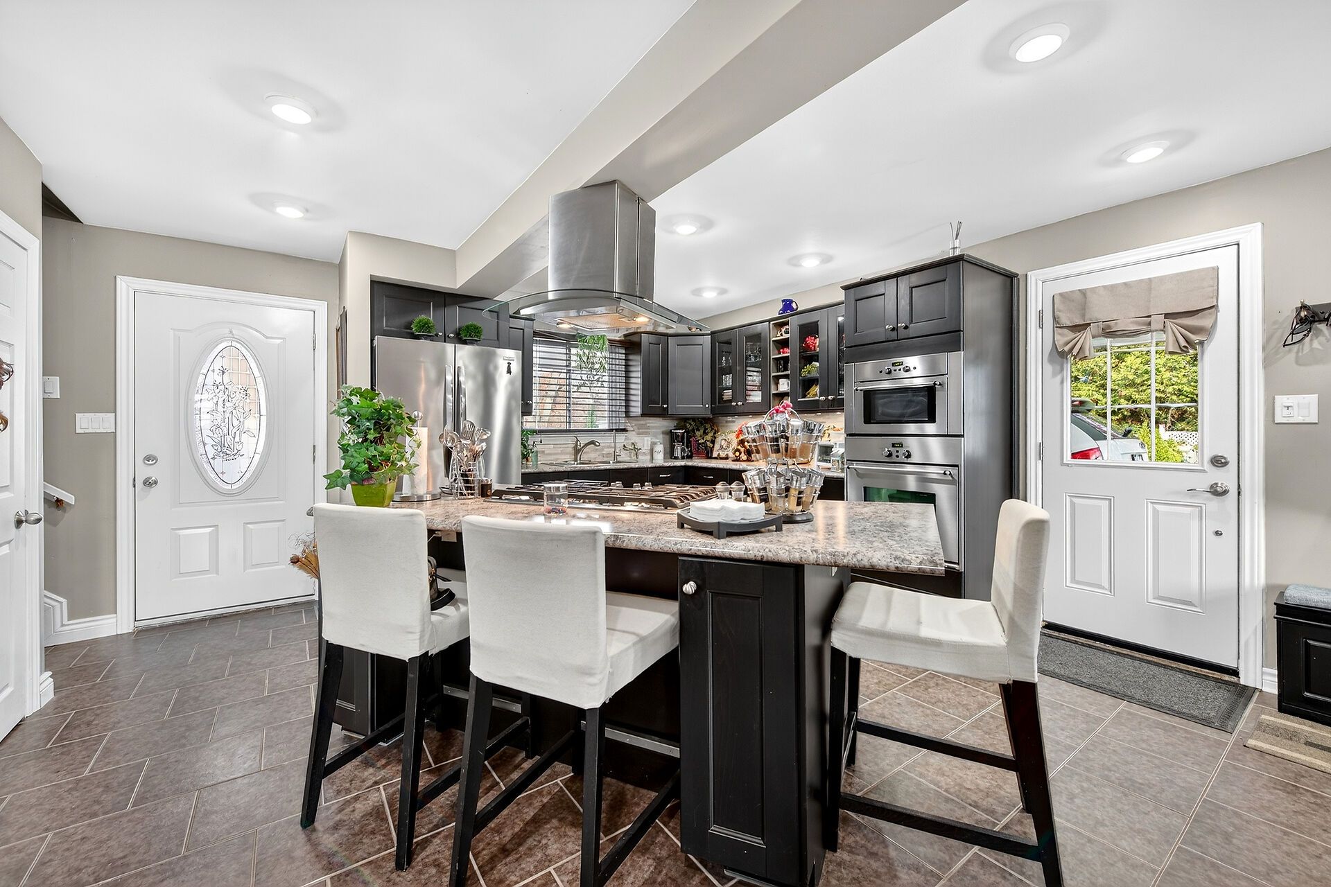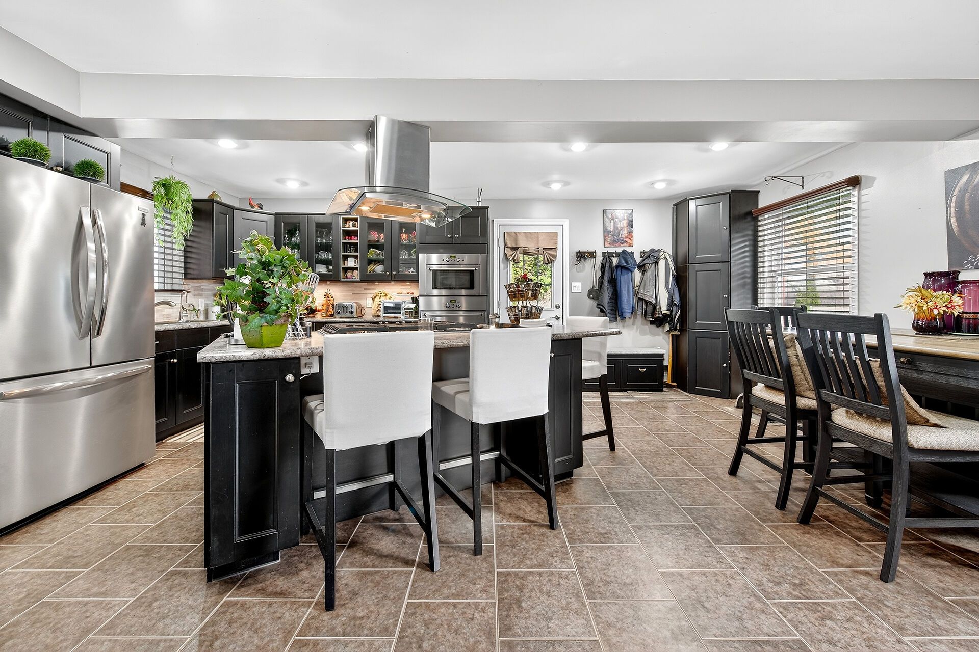 • Gourmet kitchen features oversized island and stainless steel appliances.