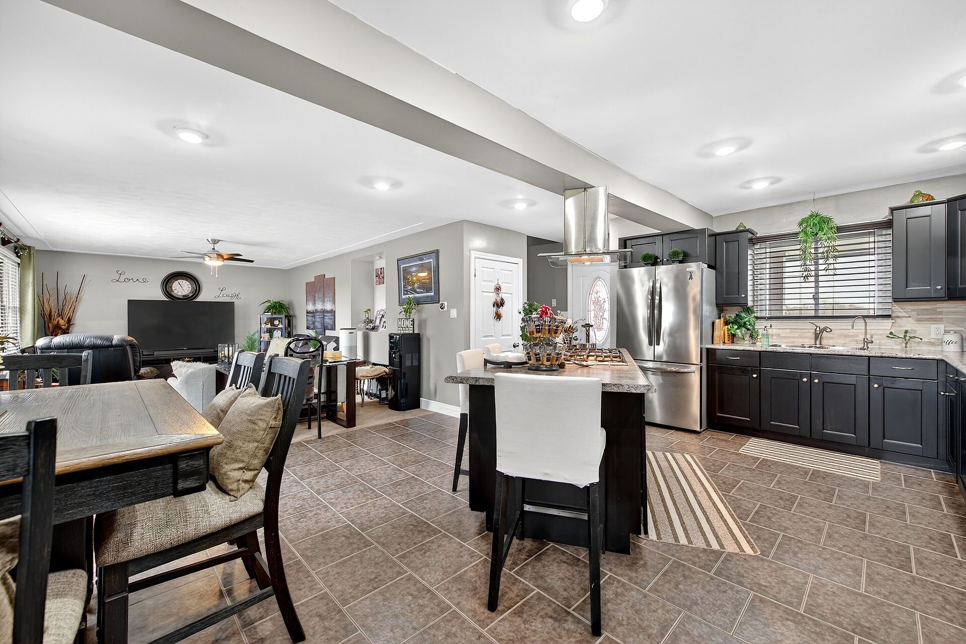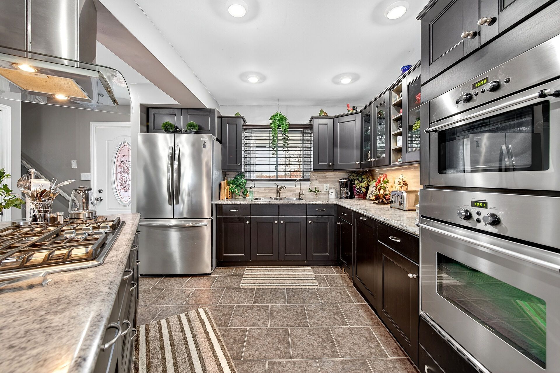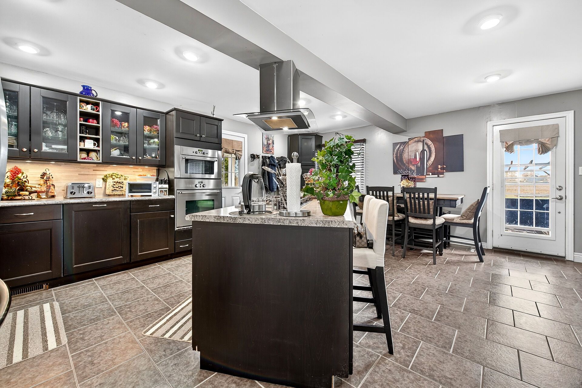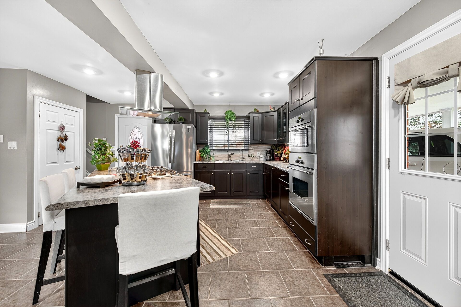 • Gourmet kitchen features oversized island and stainless steel appliances.