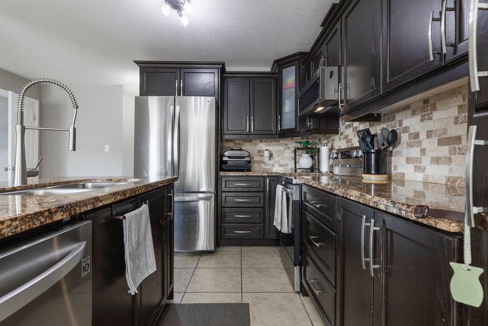 • Upgraded kitchen with granite countertops and rich wood cabinetry.