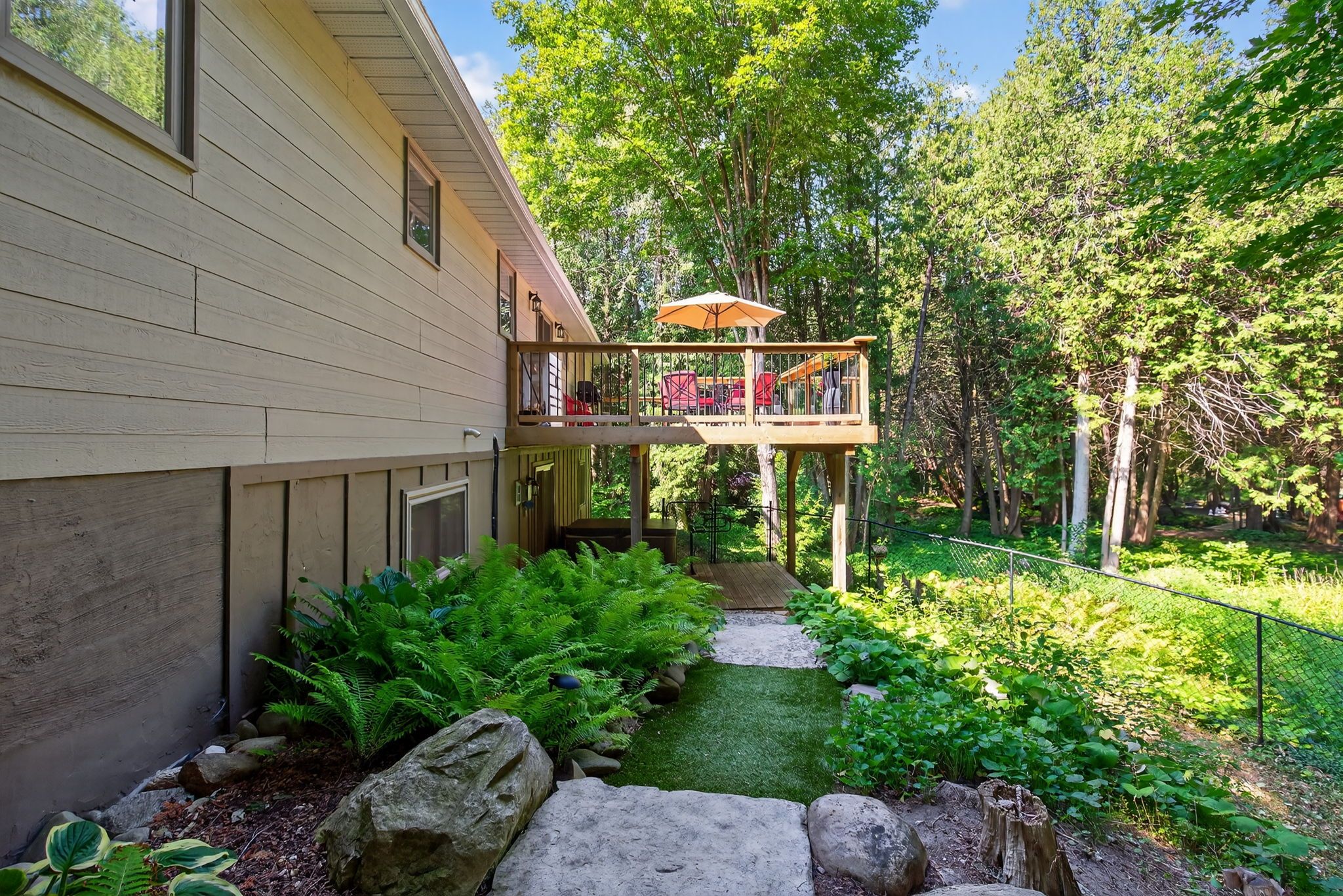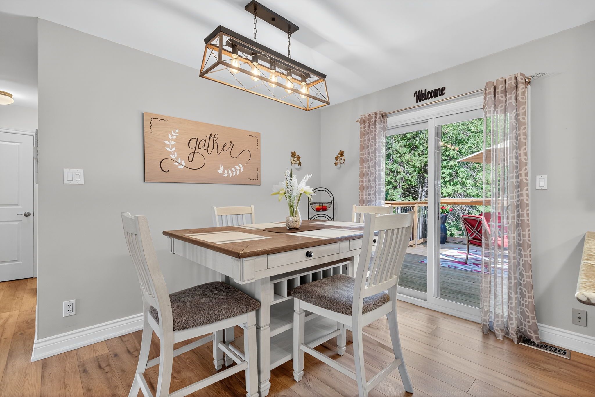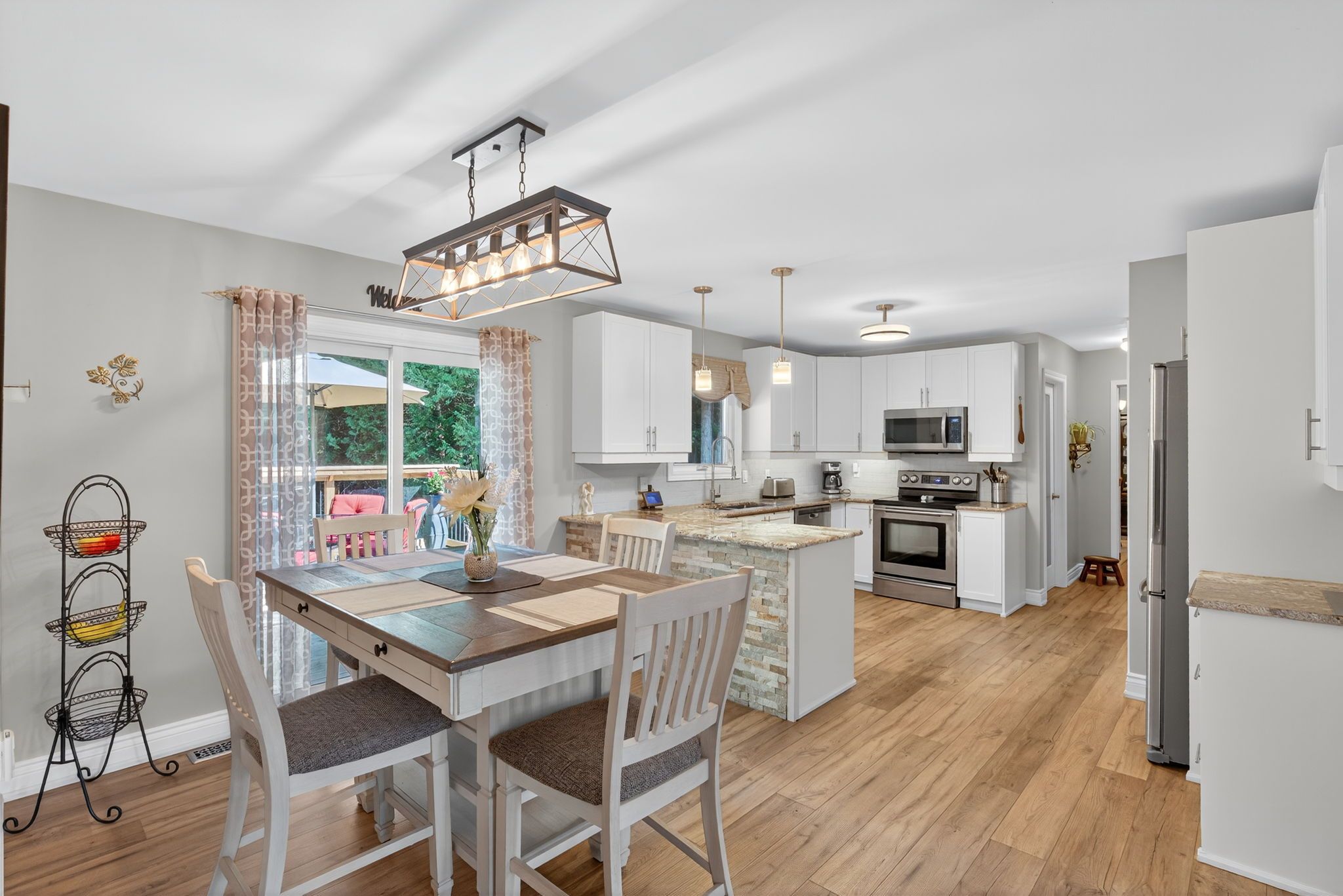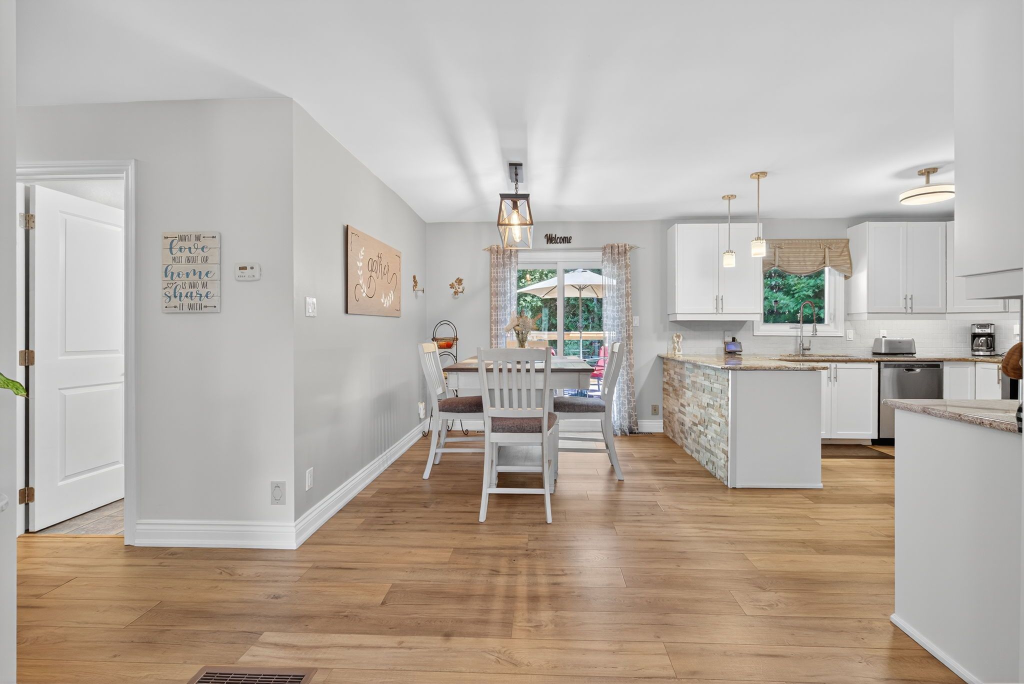 Discover this stunning bungalow nestled on a quiet dead-end country road, set on a breathtaking 1. 2 acre lot with serene views and the peaceful sound of sheldon creek running behind the property. The main floor offers a spacious living room, formal dining room and an updated kitchen featuring granite countertops and a walk-in pantry. Enjoy meals in the bright eat-in area, or step outside to the large 2022 built deck perfect for relaxing and entertaining. The home features 3 generously sized bedrooms, with the primary suite boasting a private 3-piece ensuite. Luxury vinyl flooring runs throughout the main level for a modern, low maintenance finish. The lower level is ideal for both relaxing and entertaining, with a large recreation room, a walk=out to the patio and hot tub area (hot tub included as is) plus abundant storage. There is also a roughed in sauna ready for your personal touch. Recent updates & features: roof(2019)windows(2010)furnace & a/c(2015)water softener(2019)ultra violet system (2015)hot water tank (owned)gas stove & bbq line (2020)new well pump(2021)whether you're looking to raise a family, downsize , or enjoy a peaceful retirement, this property offers the perfect blend of country charm and modern comfort. Enjoy evening walks on the quiet dead end country rd. Enjoy breakfast on an elevated deck surrounded by a canopy of trees and relax to the sound of the creek. Finished walk out basement has in-law potential. Side entrance from den to partially fenced back yard!