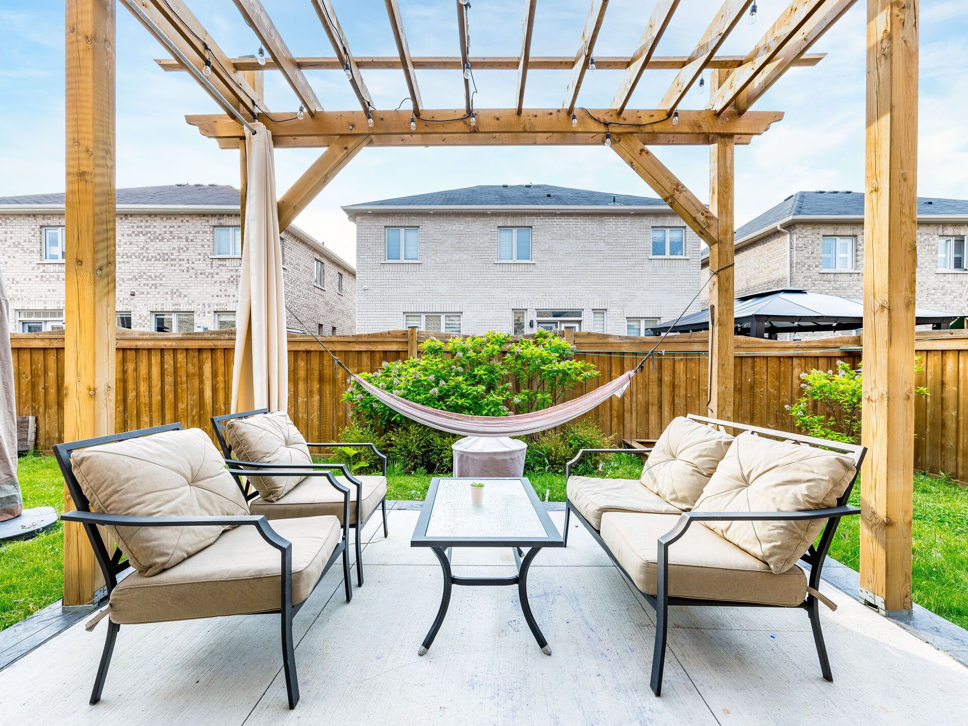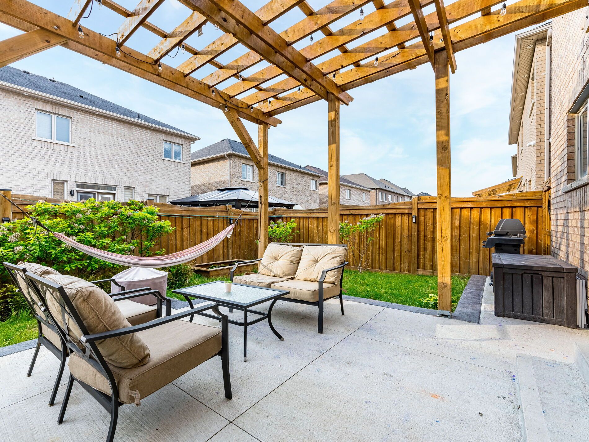 • Beautiful backyard with a pergola and concrete patio for gatherings.