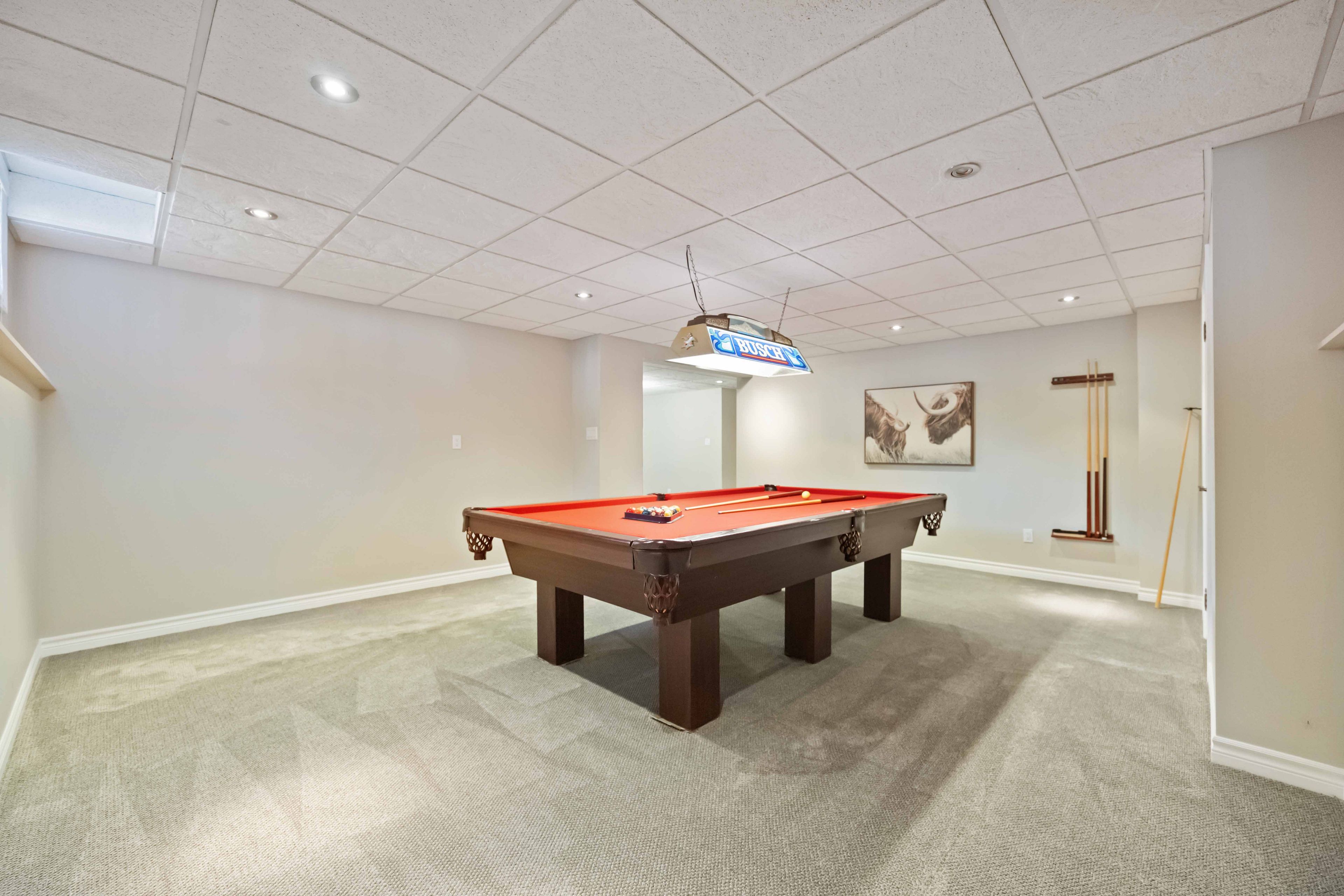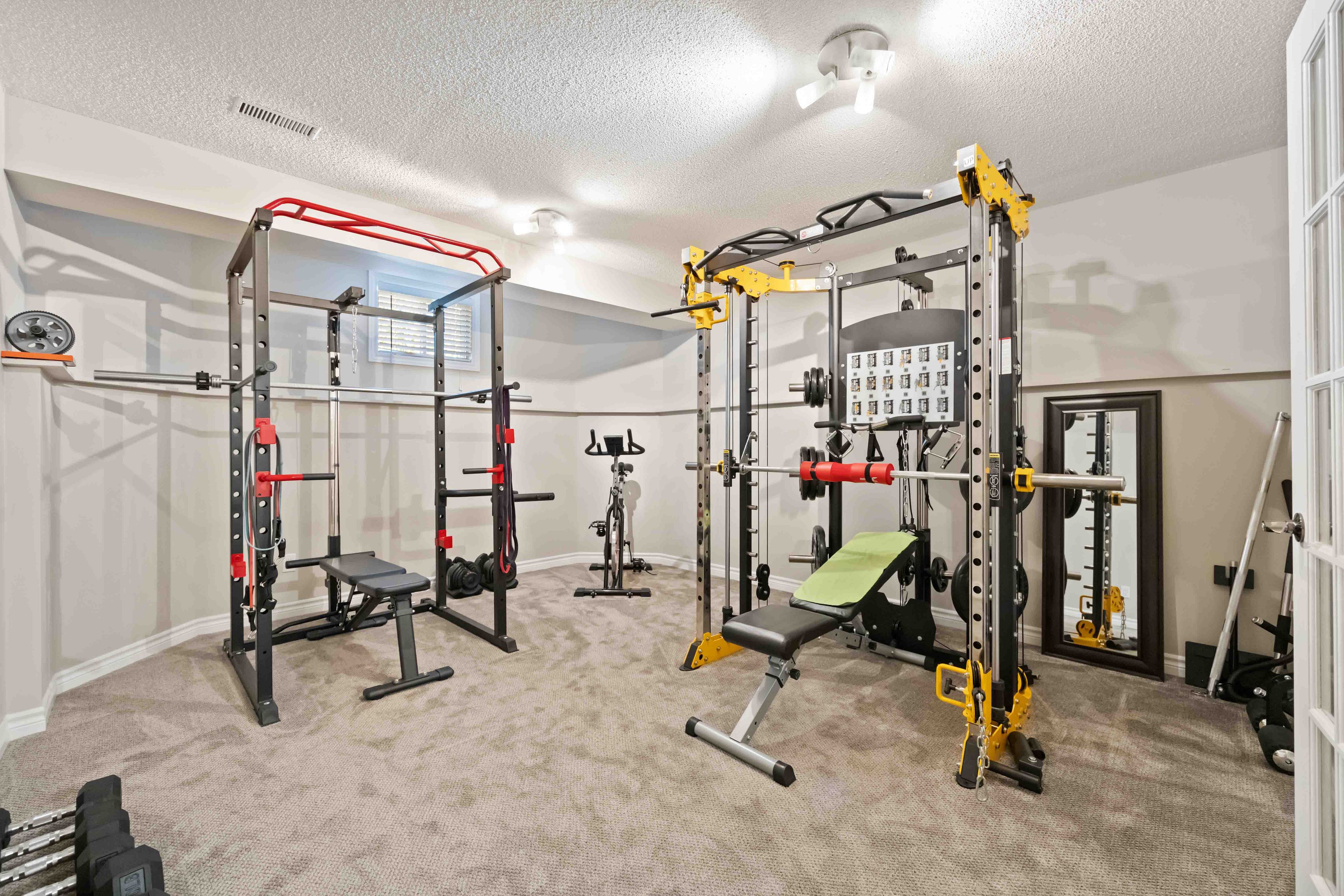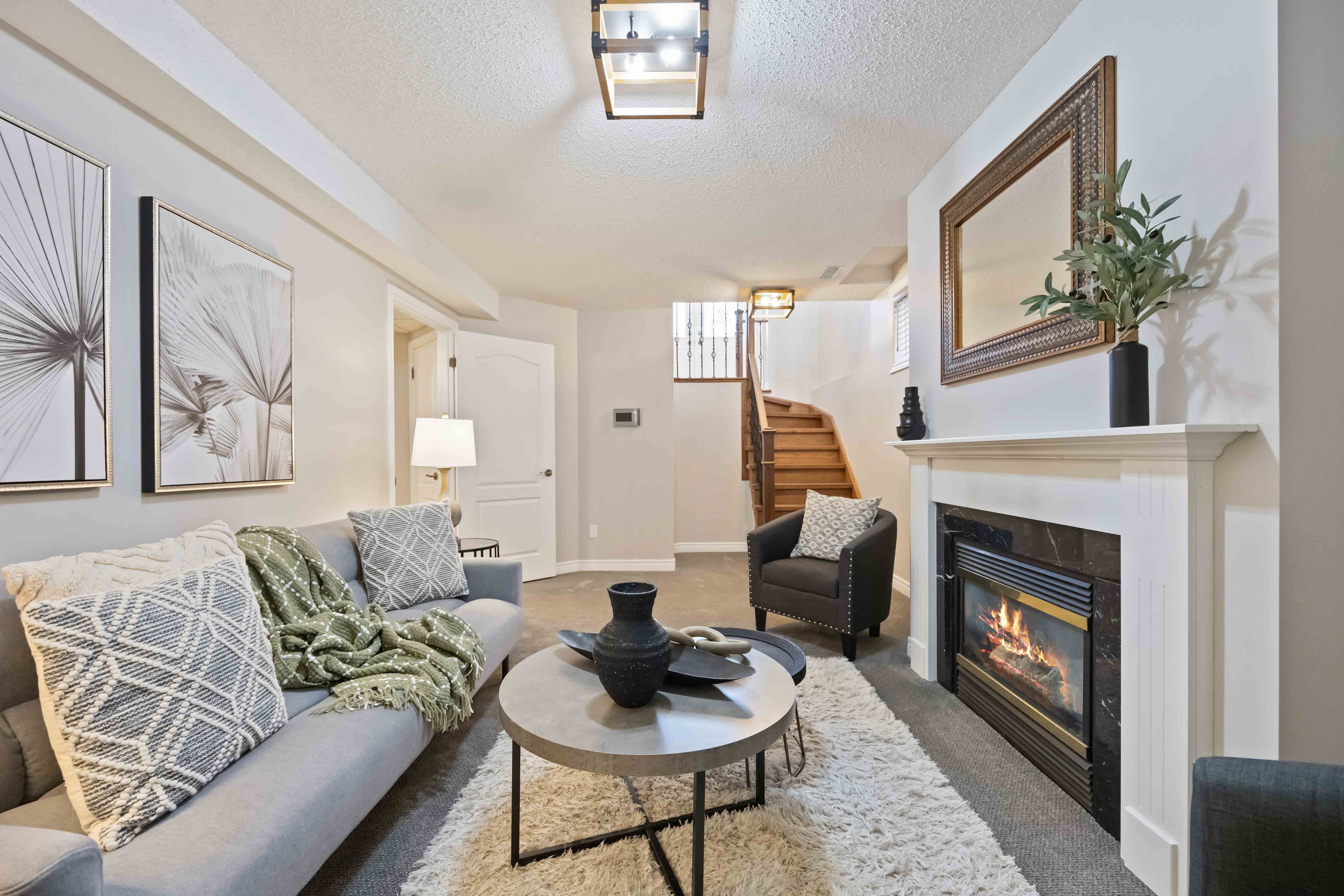 • Fully finished basement with a cozy fireplace and multiple rooms.