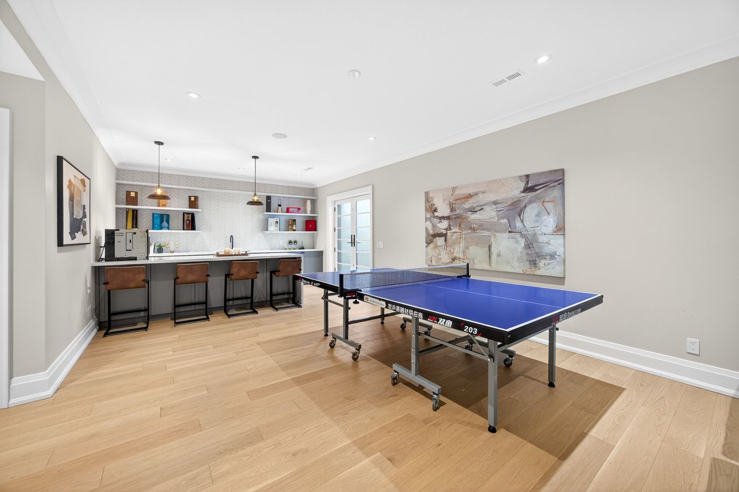 • Lower level offers a theatre, bar, and various entertainment spaces.