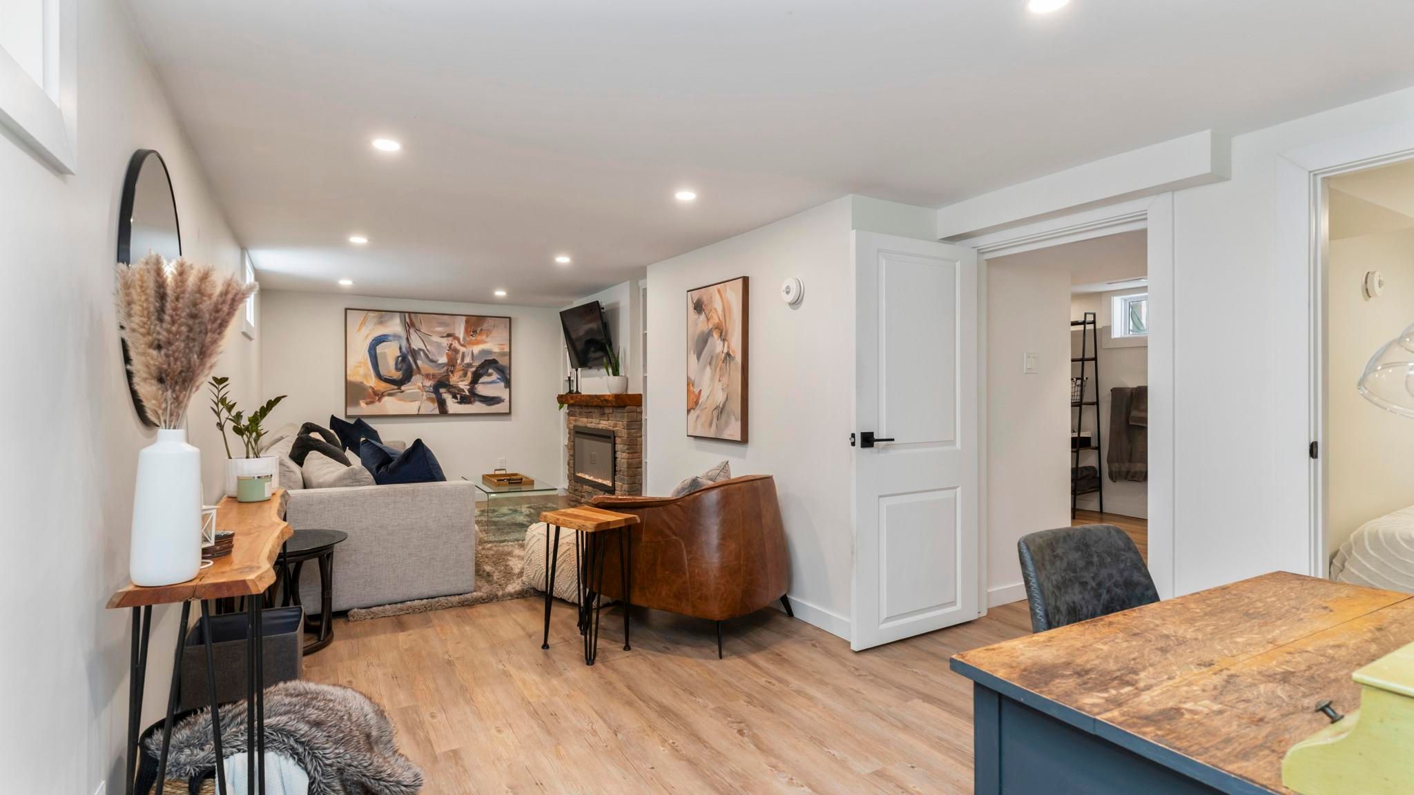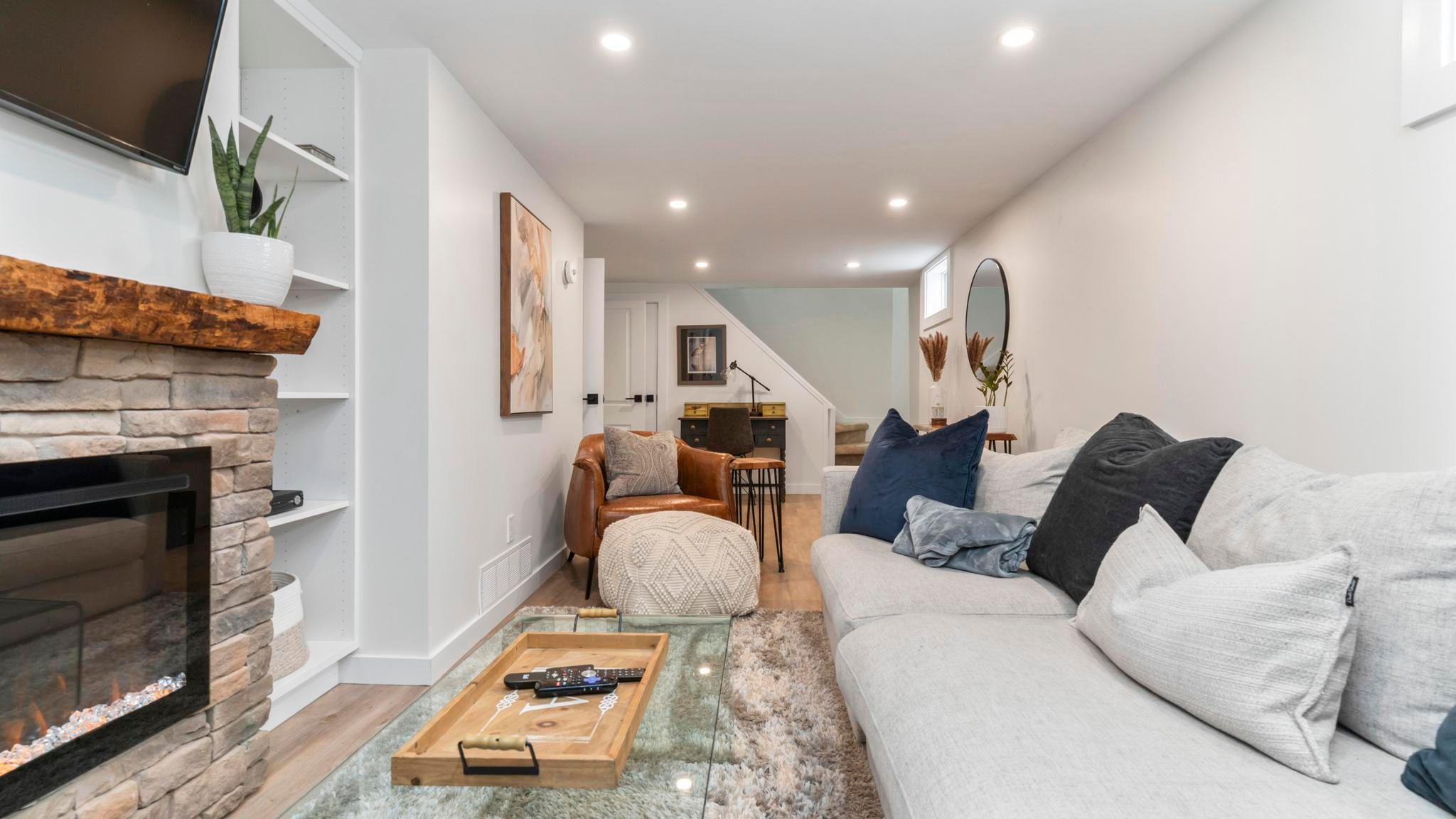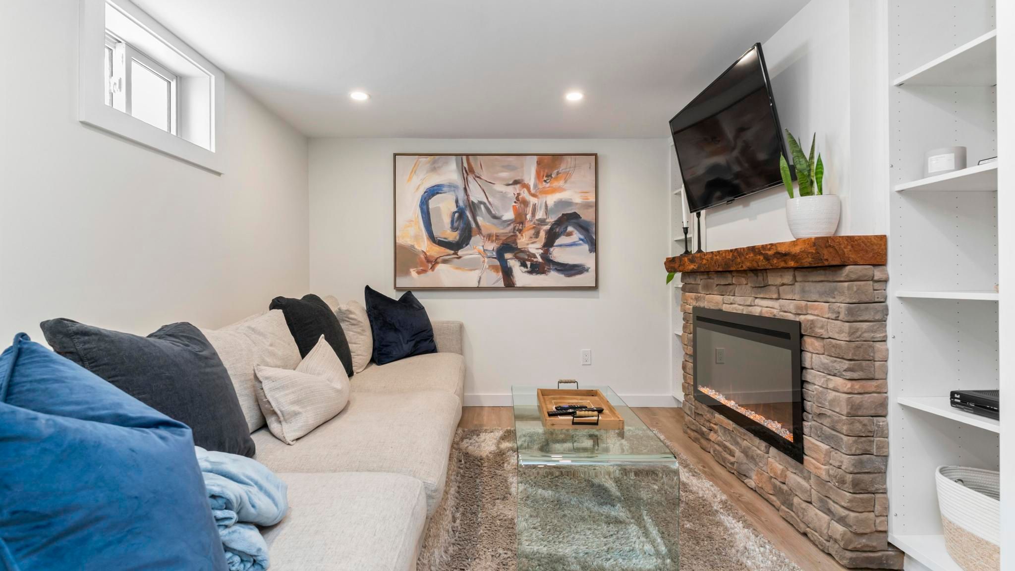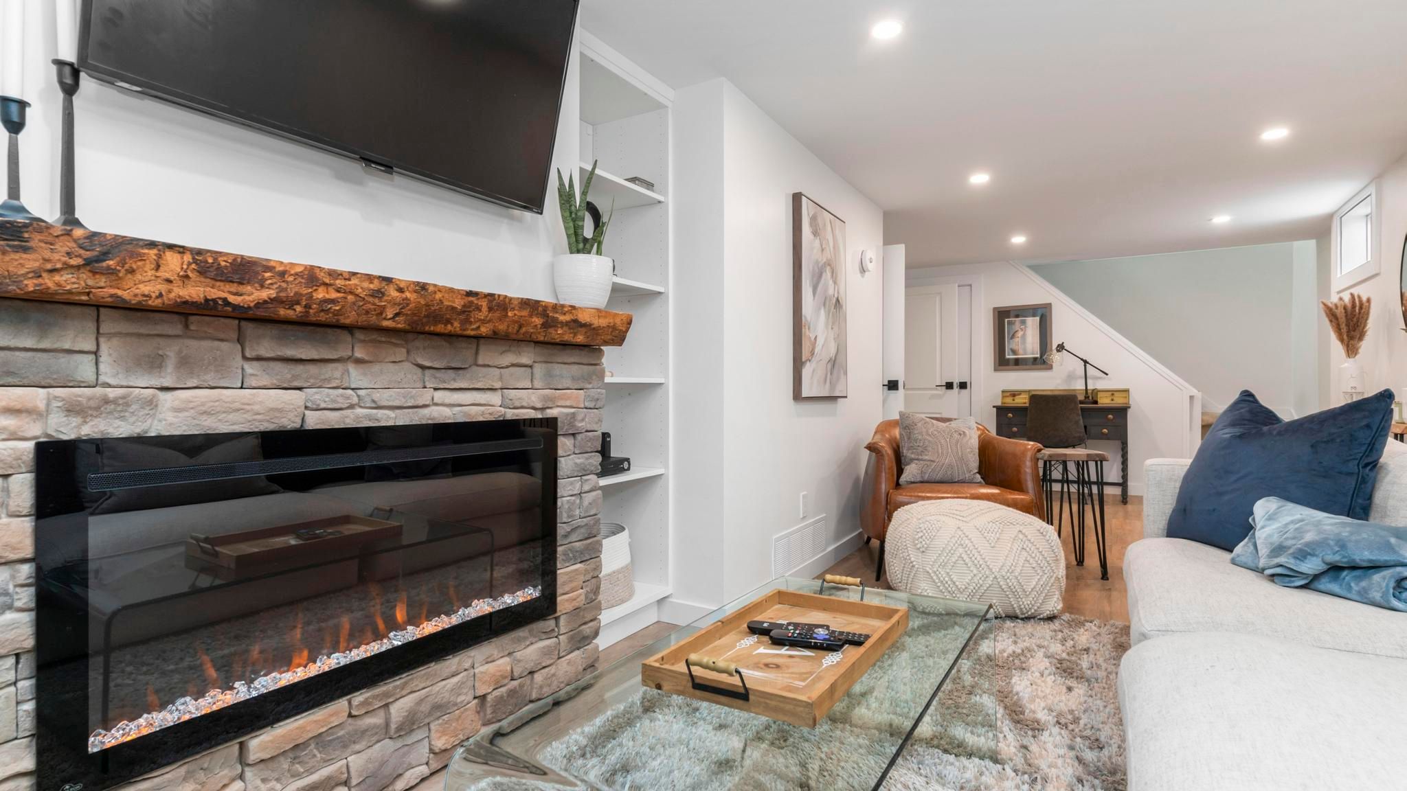 • Renovated lower level features cozy electric fireplace and extra bedroom.