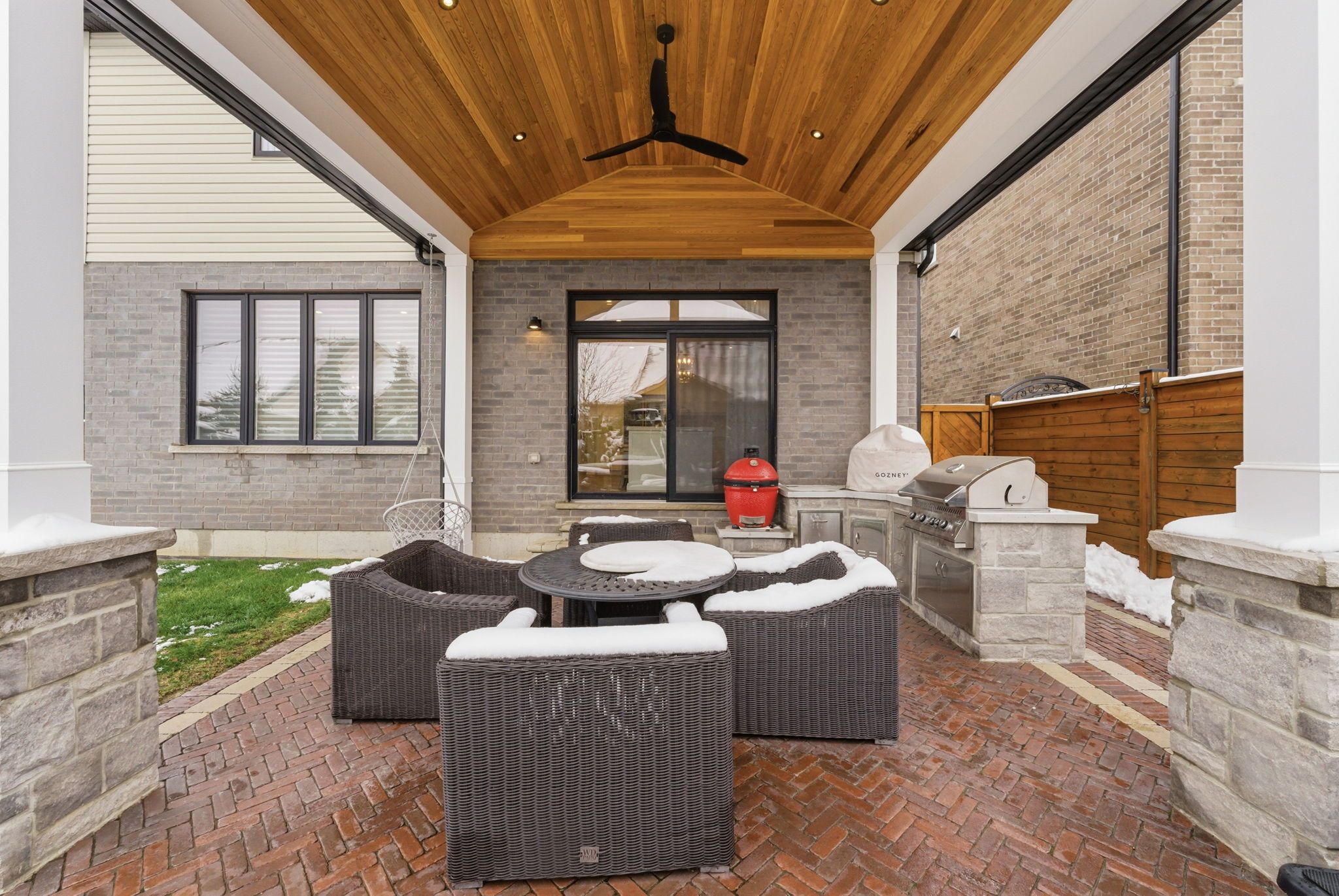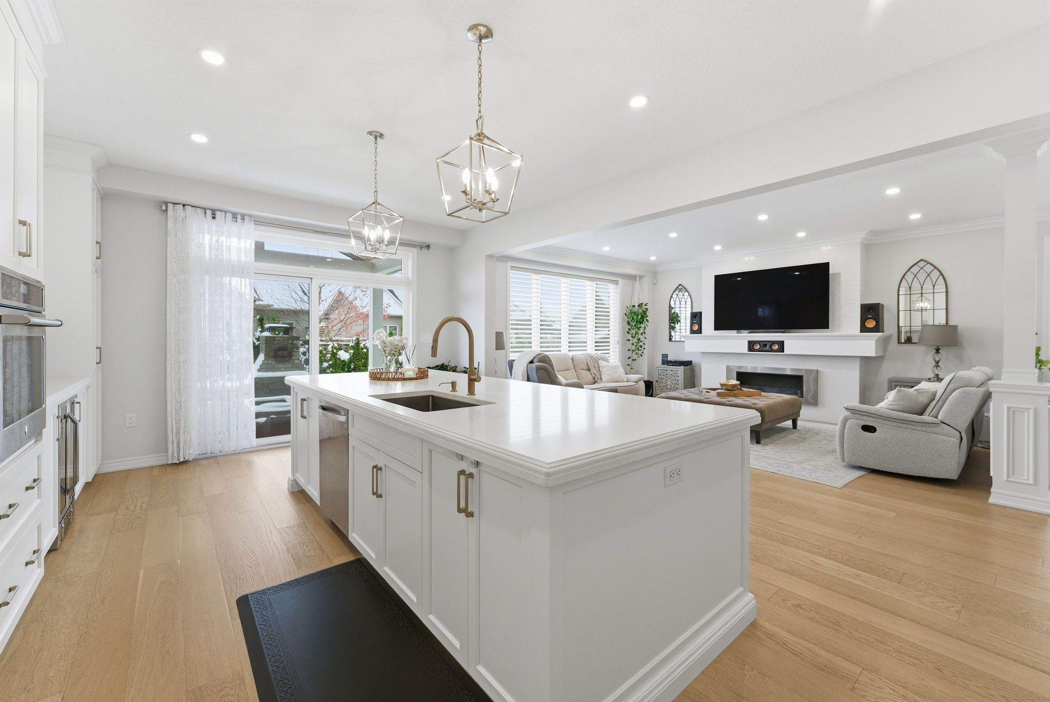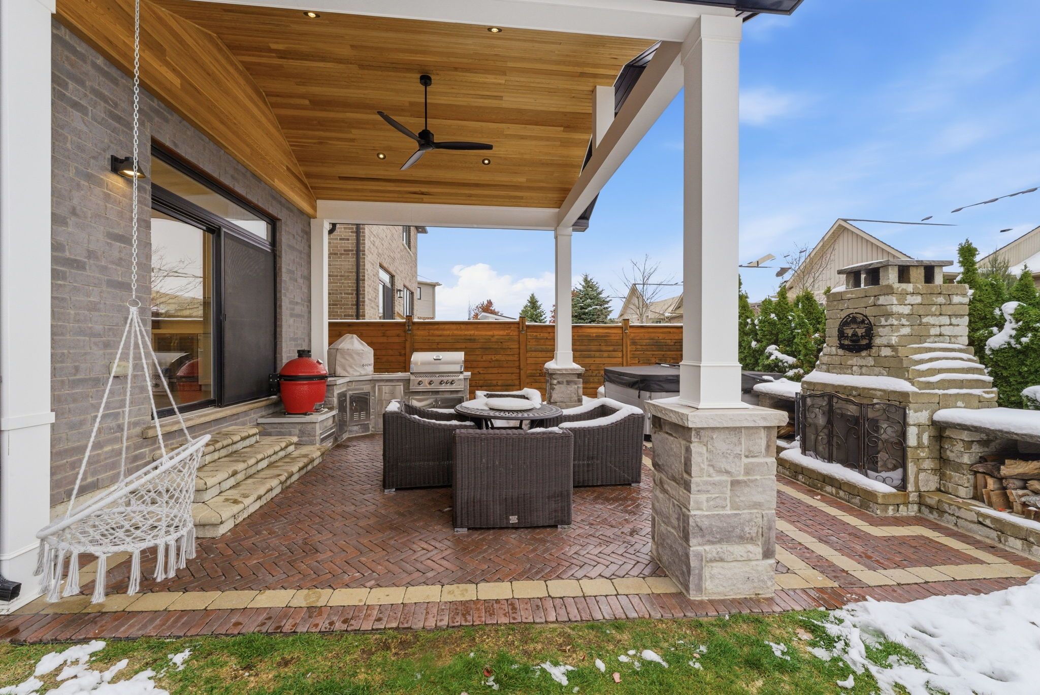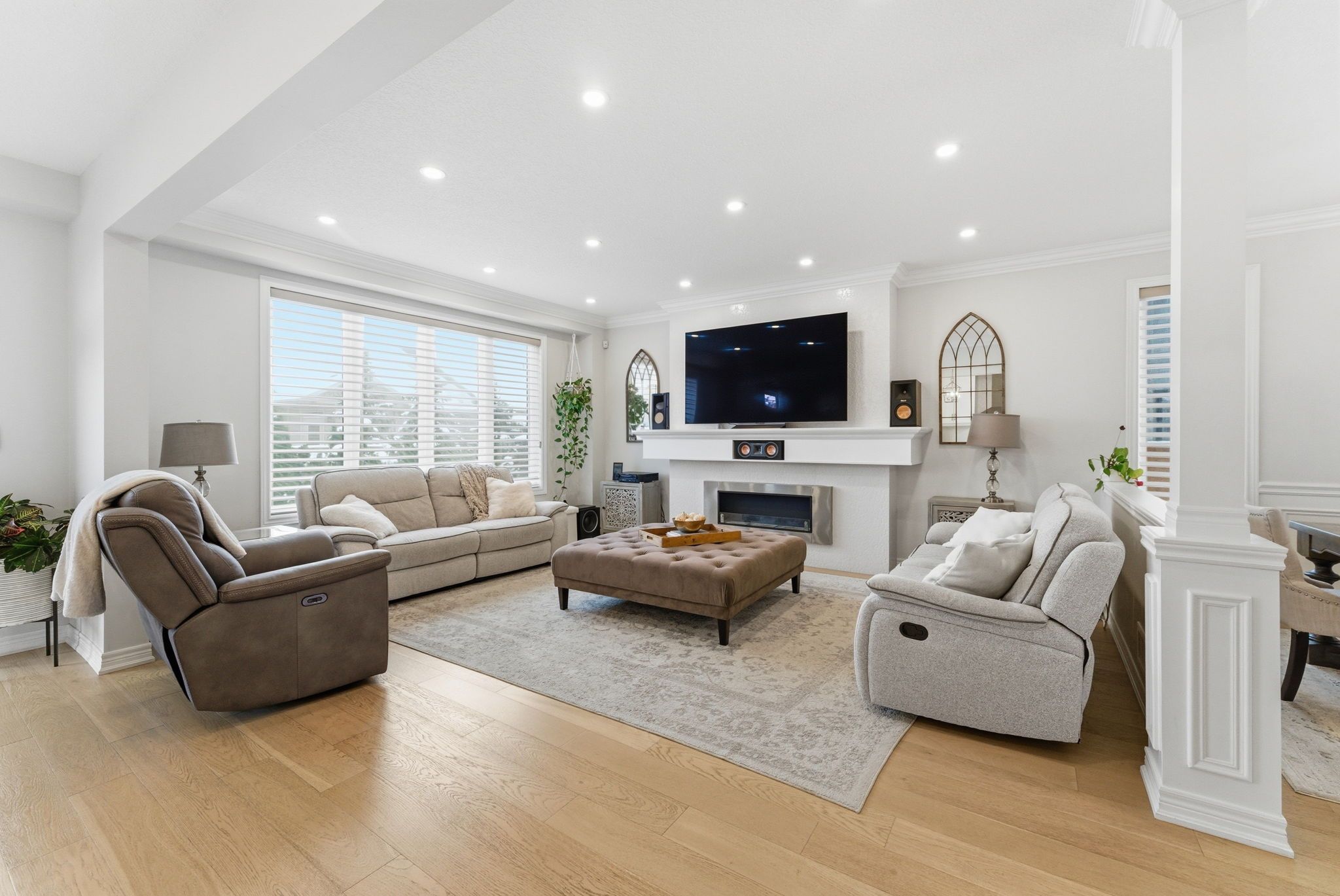 Welcome to 16 festival way, an executive residence featuring nearly 3,700 sq. Ft. Of luxuriously finished living space, set on a large, pool-sized, pie-shaped lot. Nestled in one of binbrook's most prestigious courts, this exceptional 4 bedroom, 4 bath home effortlessly blends timeless elegance with modern sophistication. Step into the impressive 2-storey foyer, where wainscoting and herringbone tile set the tone for refined design. The open-concept main floor showcases natural white oak hardwood and crown moulding throughout, creating an inviting yet upscale atmosphere. At the heart of the home lies the custom chef-inspired kitchen, featuring an expansive 10-foot island, oversized cabinetry, quartz countertops, and top-of-the-line ge café and jenn-air appliances. The adjoining living room centers around a custom tiled bio-ethanol fireplace, while the formal dining room, powder room, and laundry/mudroom complete this beautifully designed level. Beyond the 8-foot glass doors, your outdoor oasis awaits a custom stone kitchen with concrete countertops, built-in natural gas napoleon grill, and a spacious covered patio with cedar ceiling & pot lights ideal for year-round entertaining. A massive stone fireplace adds warmth and ambiance, making this the perfect retreat for cozy evenings. The upper level continues to feature white oak hardwood floors and crown moulding, leading to four generous sized bedrooms. The primary suite is a true sanctuary, featuring a spa-inspired 4-piece ensuite and a custom-built walk-in closet designed for ultimate organization and style. The fully finished basement provides comfort and versatility, complete with plush designer carpeting, an open-concept media room with a 130" high-end projector screen and built-in surround sound system, plus an oversized gym with mirror wall, a 3-piece bathroom, and ample storage. This remarkable home is rare, combines luxury, craftsmanship, and thoughtful design inside and out.
