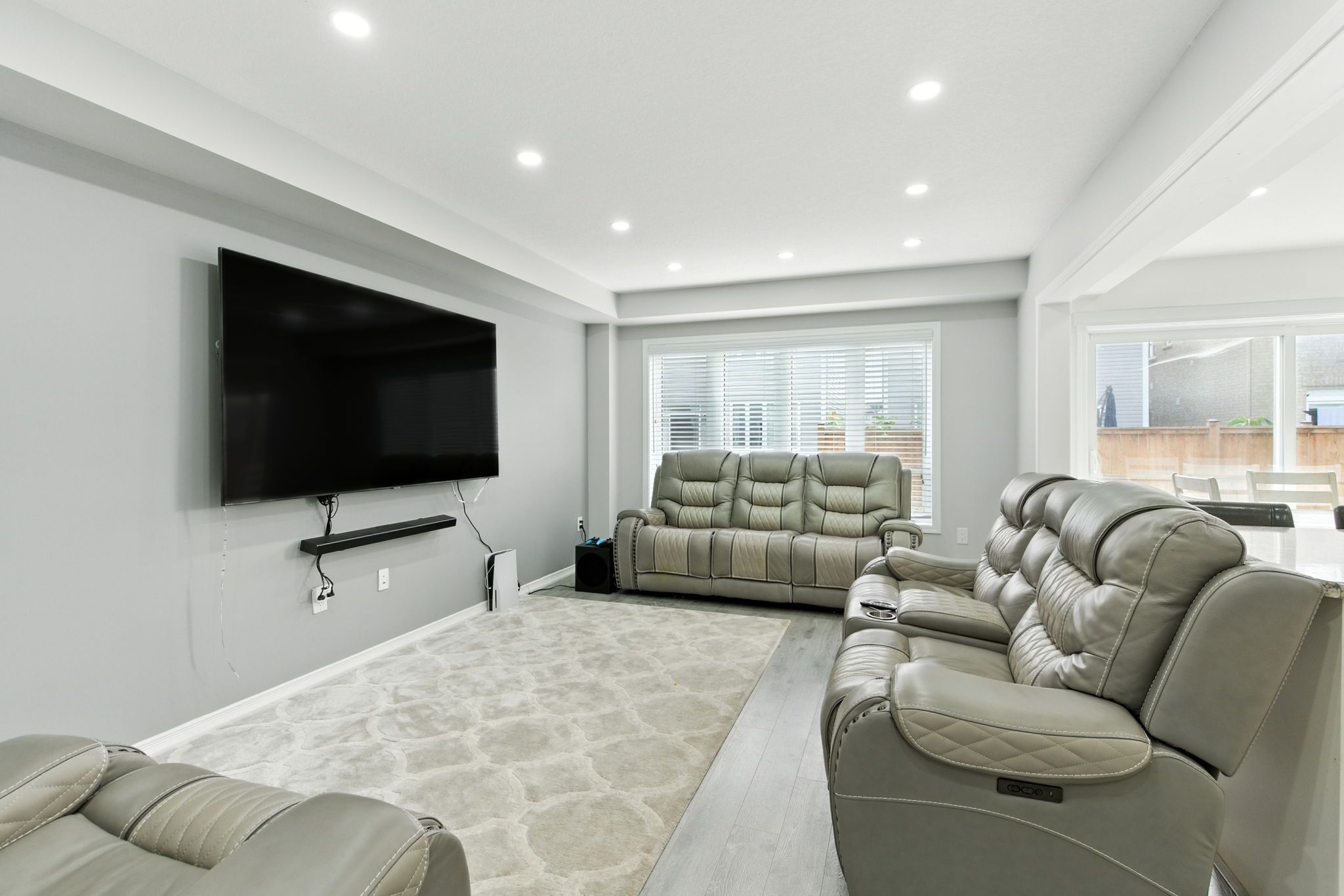• Open-concept great room and modern eat-in kitchen with stainless steel appliances.