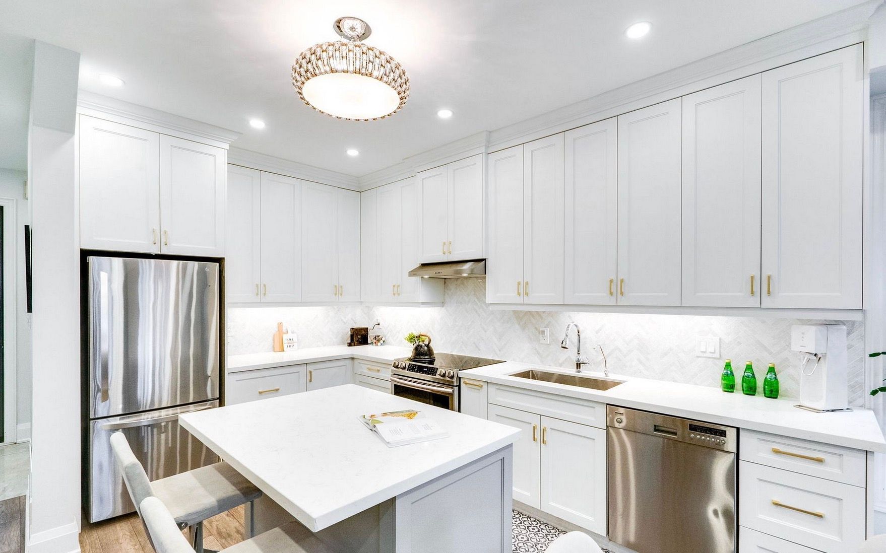 • High-end kitchen with quartz countertops and large center island.
