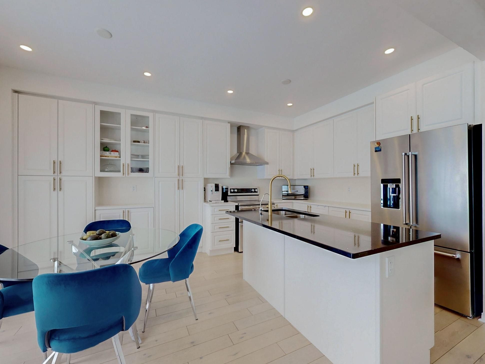 • Modern eat-in kitchen featuring quartz counters and tall cabinets.