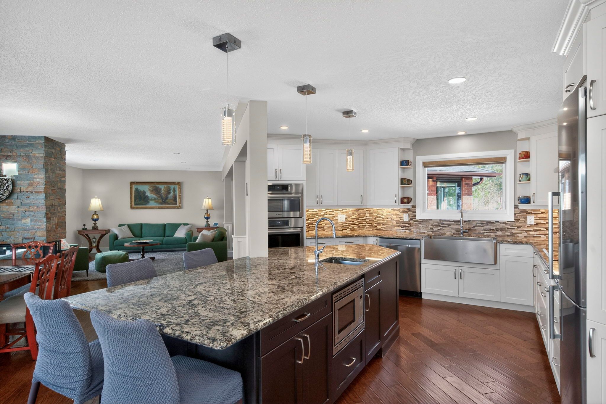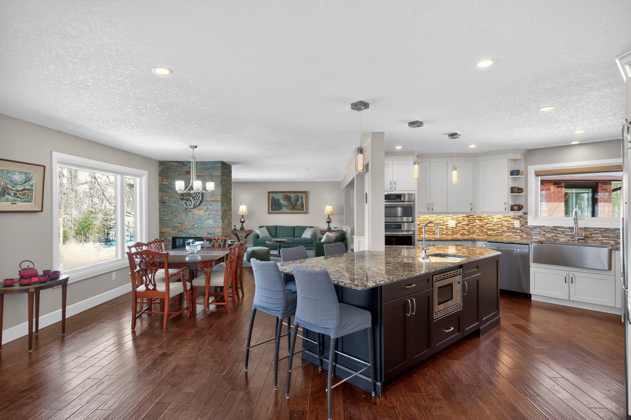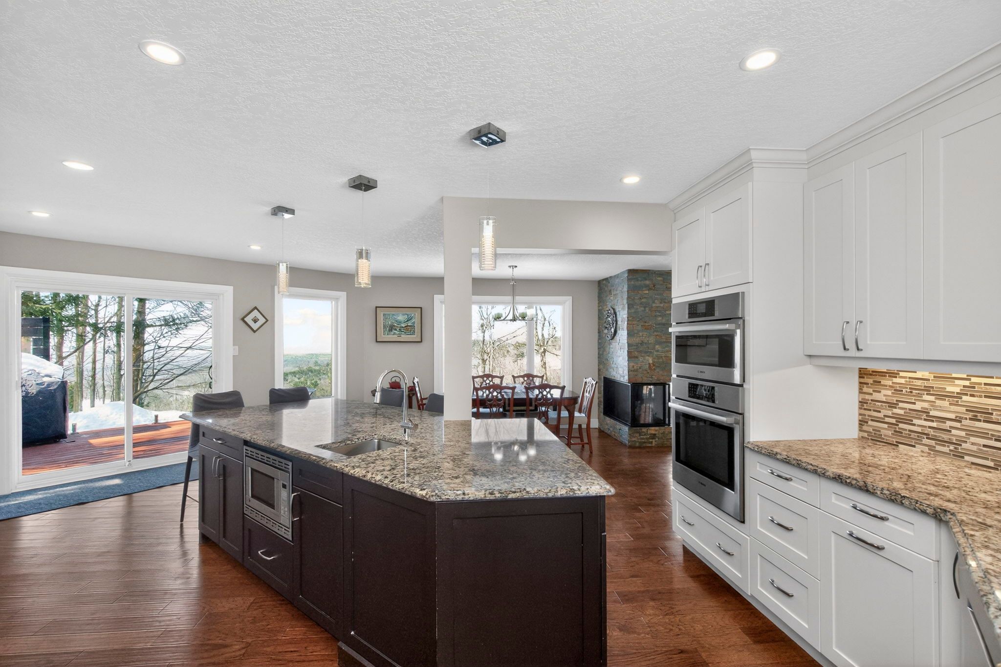 • Updated kitchen with granite countertops and large island for gatherings.