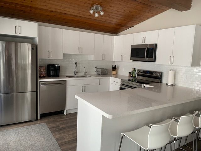 • Bright living area with vaulted ceiling and modern kitchen amenities.