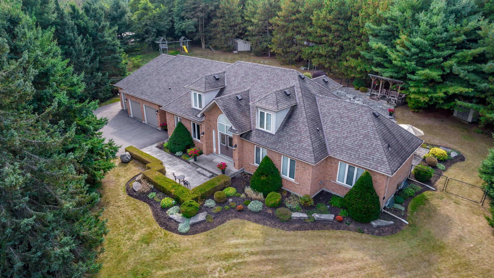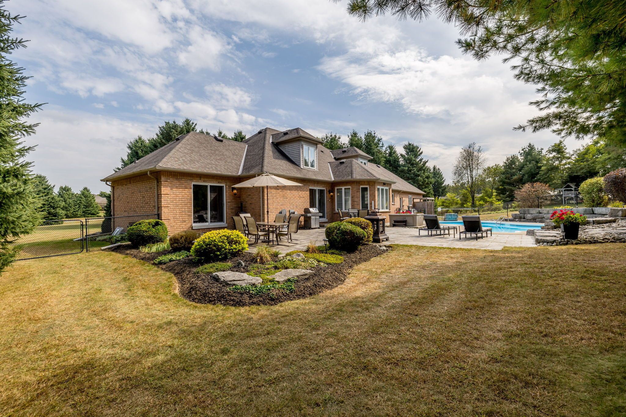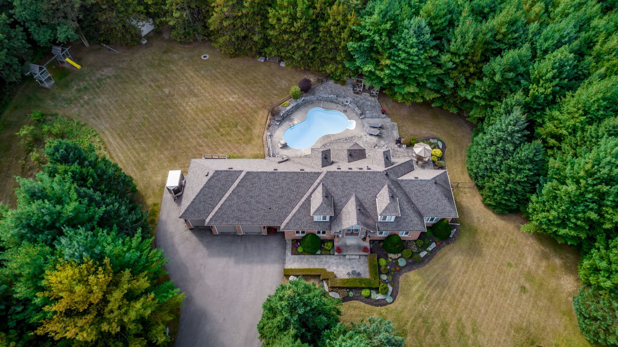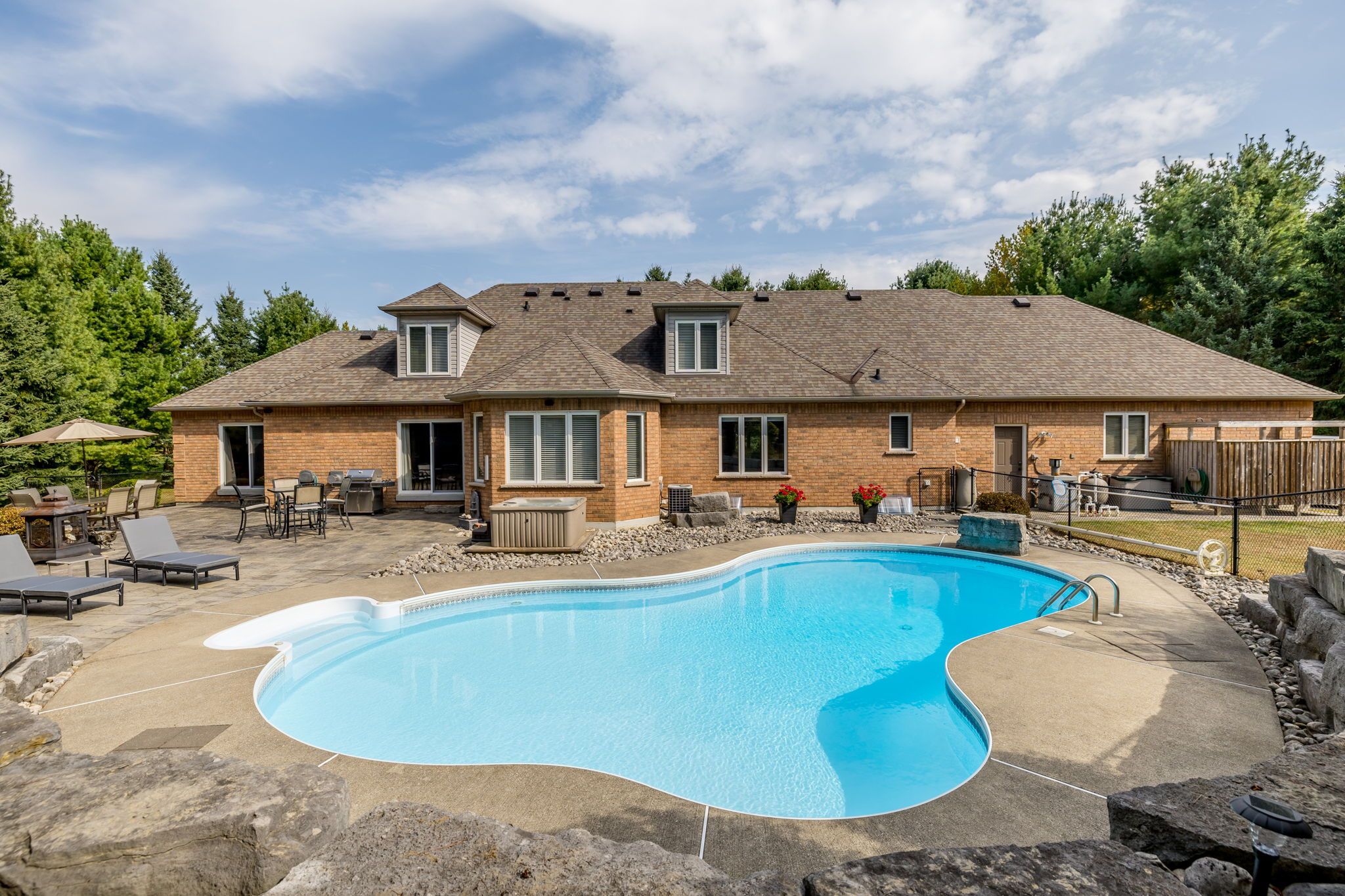 Welcome to this exceptional 2-storey custom built estate home, perfectly nestled on a private and mature treed 4. 83 acre lot. The kitchen is surrounded by windows, and fills the space with natural light. The family room, featuring a gas fireplace and a walkout to the patio, provides a cozy gathering space, while the formal dining room is ideal for hosting. An elegant office with french doors adds charm and functionality for remote work or study. This home offers 5 bedrooms, including a main-floor primary suite with a walk-in closet, private ensuite, and walkout access to the back patio. Upstairs, you'll find four spacious bedrooms, including one with a private 2-piece ensuite, ensuring comfort for family and guests. Outdoors, enjoy time with family or entertaining guests with a spectacular inground pool, 65 yard golf hole and a versatile outdoor rink, perfect for skating in the winter and other activities in the warmer months. The expansive backyard provides ample space, sheds for storage, surrounded by lush greenery, and a private trail to access the caledon trailway. Additional highlights include an oversized 3-car garage, mudroom/laundry room with garage access and walk-up from the basement. Partly finished basement/rec room/man cave/play zone, and large amounts of additional storage. Don't miss your opportunity to own this incredible home - schedule your showing today!