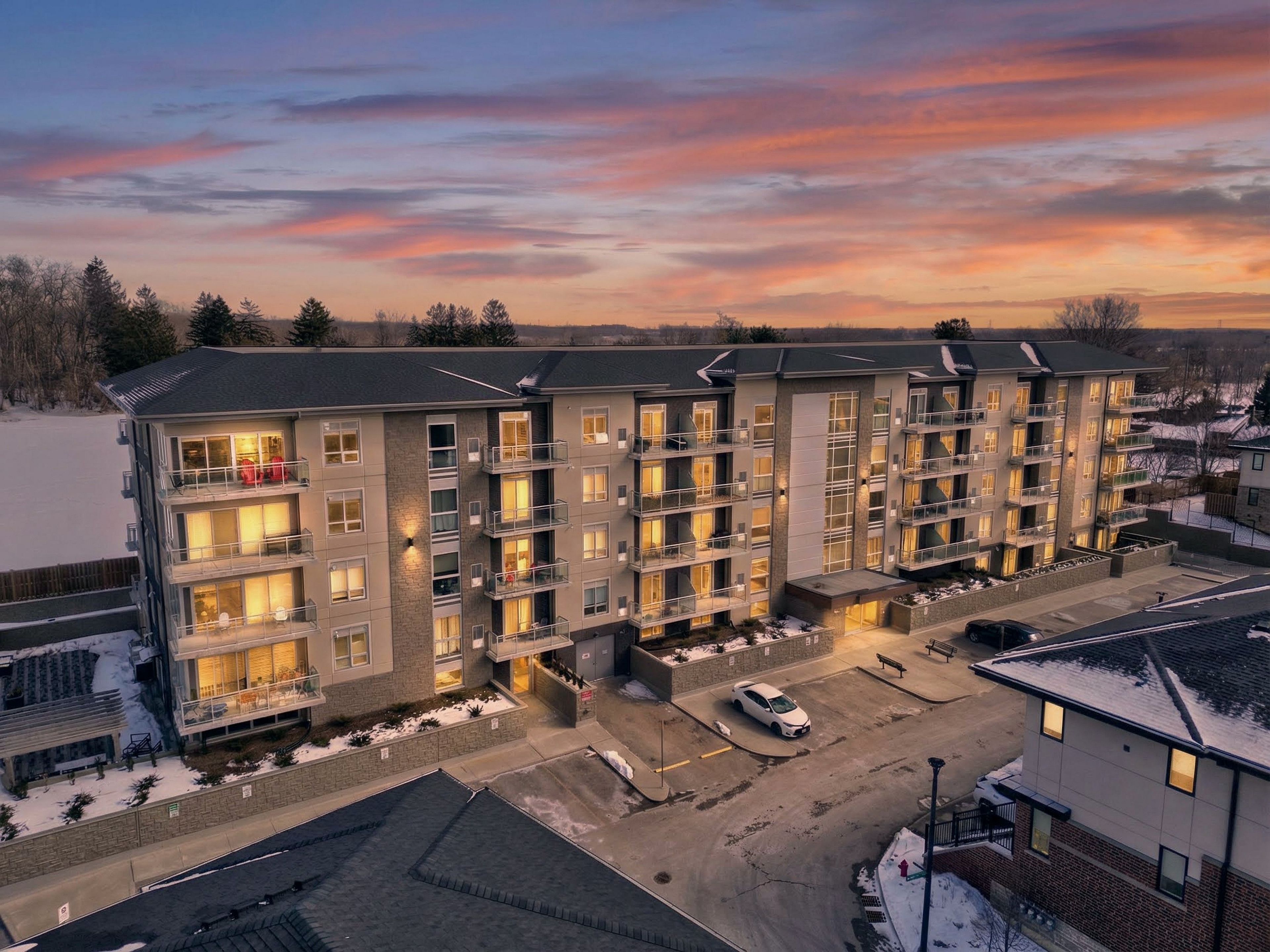 Welcome to the pinnacle of contemporary condo living in ancaster's prestigious monterey heights at 16 markle crescent. This 2 bdrm, 2 bath penthouse corner suite offers 857 sq ft of refined living space, thoughtfully designed w/ an open-concept layout that maximizes light, flow, & functionality. The kitch is both stylish & practical, feat s/s app, an attractive tiled backsplash, striking pendant lighting, & a generous centre island w/ seating for 3+ - perfect for casual dining or entertaining. The space seamlessly connects to a formal din area w/ sliding doors that lead to a private covered balcony, creating an effortless indoor-outdoor lifestyle. The form liv rm is framed by dramatic flr-to-ceil windows, flooding the suite w/ natural light & showcasing elevated penthouse views. The primary retreat offers comfort and privacy, complete w/ a 3-pc ensuite w/ an oversized glass shower. A well-proportioned 2nd bdrm & a full 4-pc bath w/ a shower/tub combo provide flex for guests, family, or a home office. In-suite laund adds convenience. This suite also includes 1 underground parking space & a dedicated storage locker (#9). Monterey heights delivers exceptional amenities designed for modern living, incl a well-equipped fitness centre w/ cardio/strength equip, a yoga/stretch area, & an elegant party lounge w/ a chef-inspired kitchen. The outdoor terrace features multi seating areas - ideal for gathering w/ friends or relaxing on warm summer evenings. Secure entry, underground parking, & meticulously maintained common areas enhance peace of mind. Situated in a convenient location, this address places you steps to shopping, restaurants, groceries, & everyday essentials. Quick access to highway 403 ensures effortless commuting, while nearby parks, trails, golf courses, & top-rated schools complete the offering. Penthouse living, premium amenities, & an unbeatable ancaster location - a rare opportunity to enjoy carefree luxury in one of the area's most sought-after buildings.