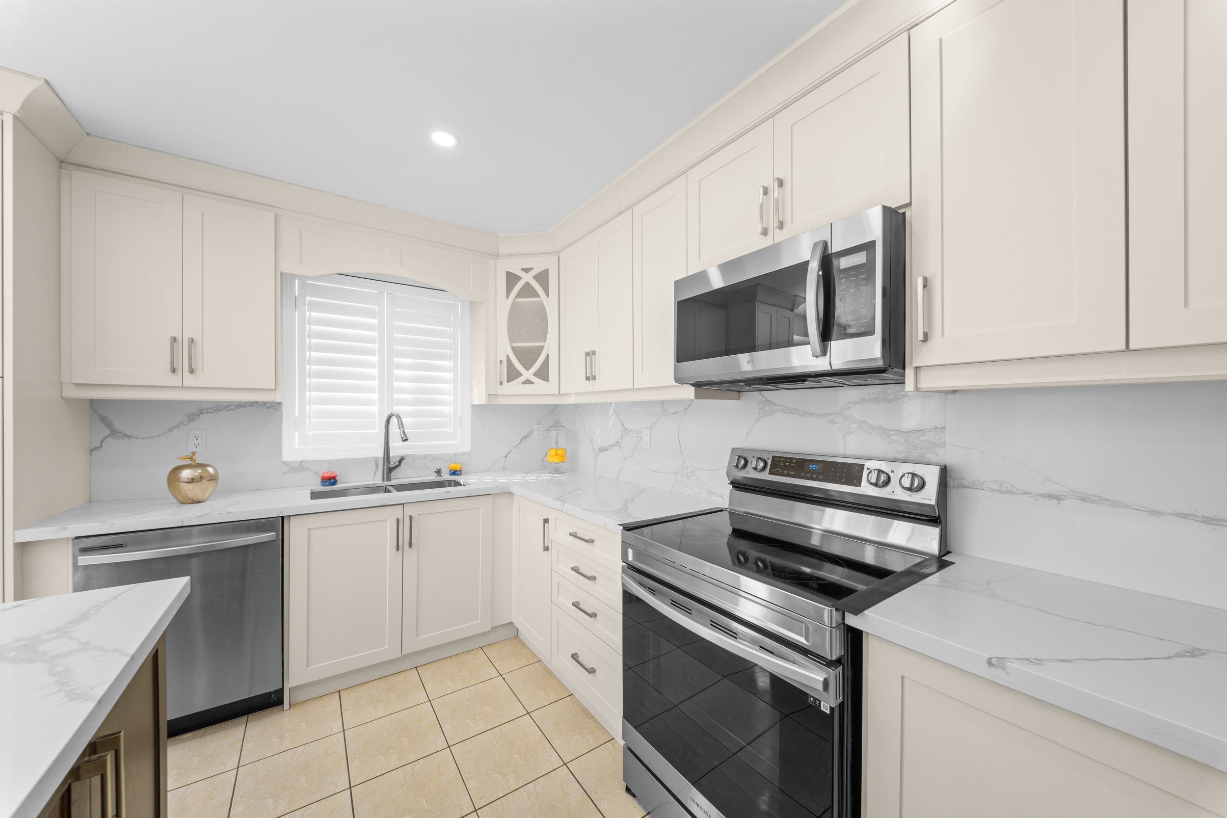 • Modern kitchen with quartz countertops and a breakfast area leading to deck.
