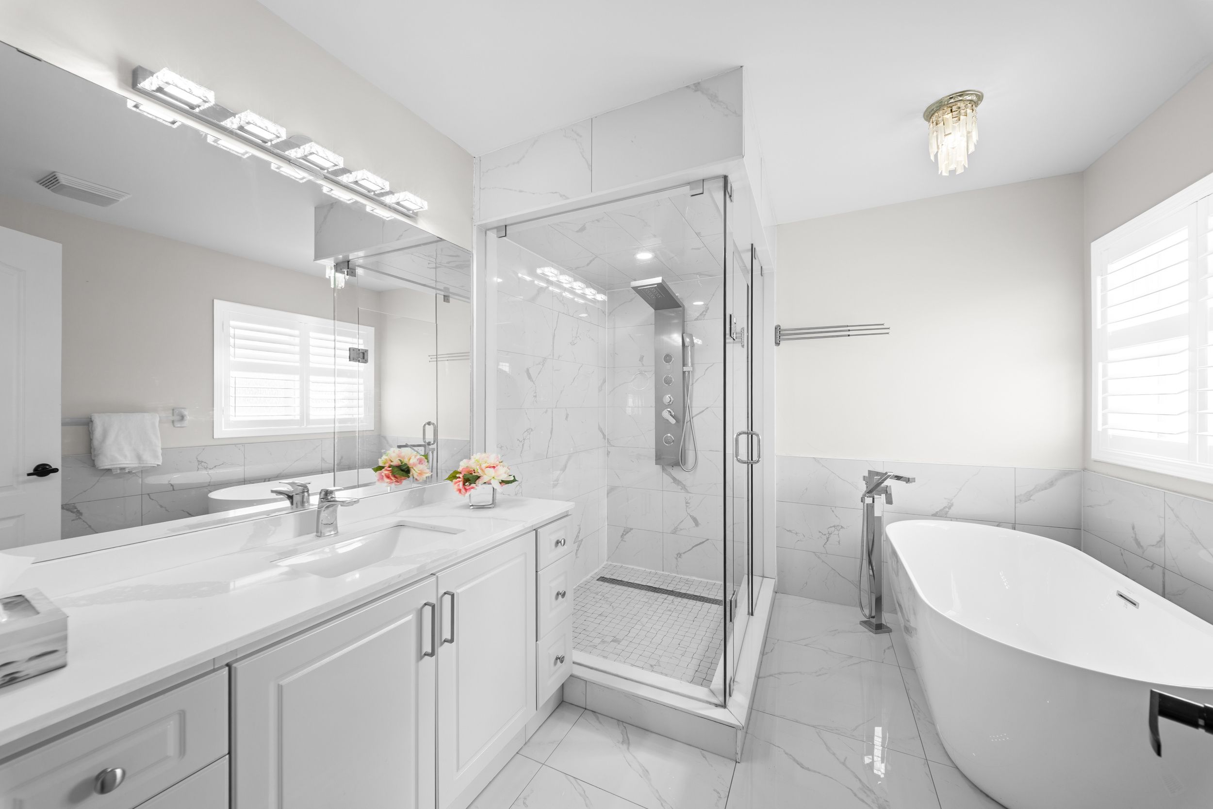 • Renovated primary ensuite featuring a glass shower and soaker tub.