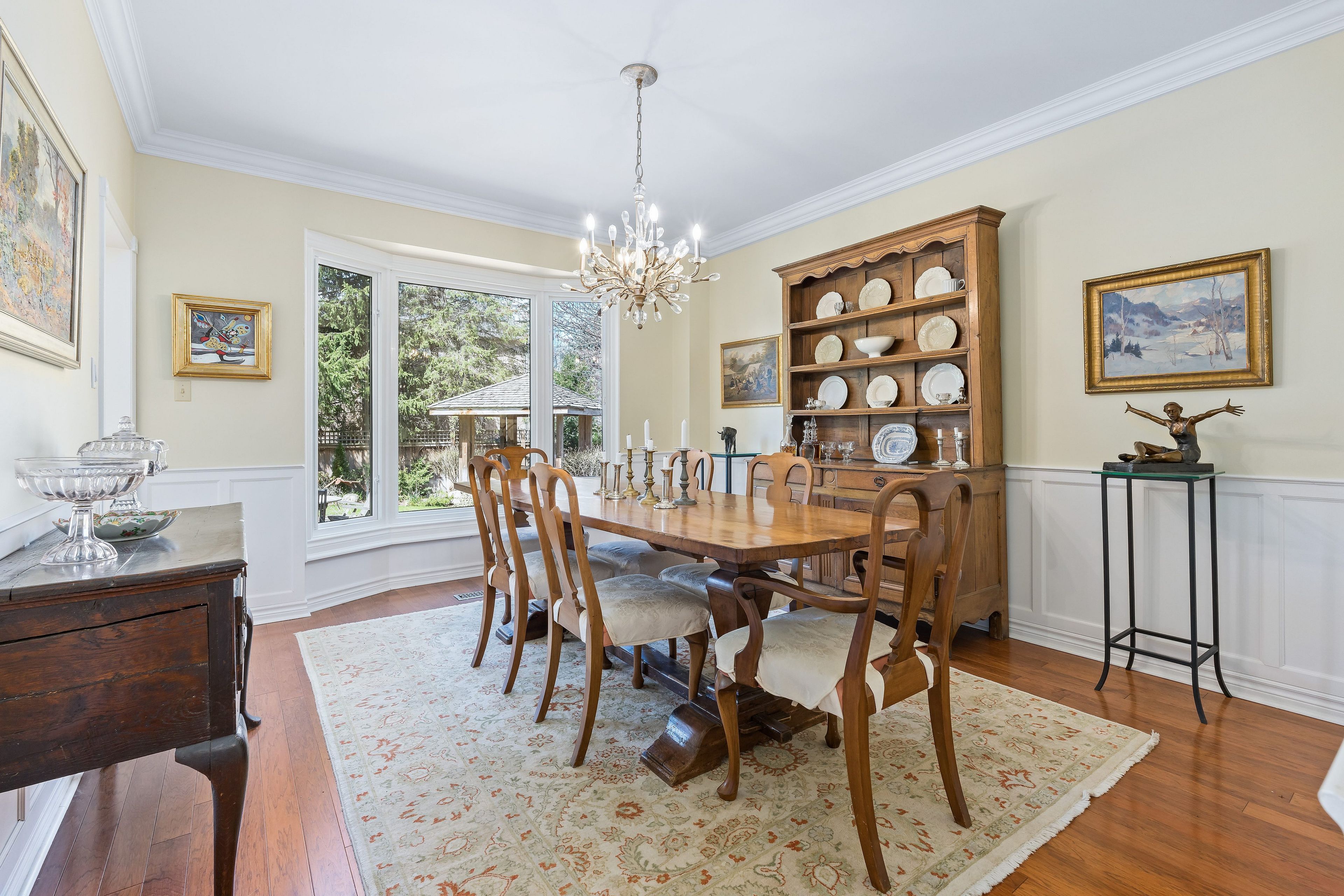 Elegant executive home in sought-after wildwood estates, set on a stunning 1/2 acre lot in the charming hamlet of glen williams. Perennial gardens and refined landscaping create exceptional curb appeal and a warm welcome. The home features a beautifully updated chef's kitchen (2024) with quartz countertops, wolf range, oversized exhaust system, bosch dishwasher and refrigerator and abundant cabinetry. Enjoy picturesque views of the spectacular backyard, complete with a patterned concrete patio and a charming craftsman-style cedar gazebo-perfect for entertaining or relaxing outdoors. The main level offers elegant and functional living spaces, including a living room with custom built-in cabinetry, a cozy family room with wood-burning fireplace, and a formal dining room ideal for hosting large gatherings. Crown moulding throughout adds a timeless finish. A stylish butler's pantry with custom cabinetry and imported marble countertops offers flexibility as a servery or private home office. Upstairs, all four bedrooms are generously sized. Both bathrooms have been tastefully renovated, including the main bath (2026). The primary suite features a luxurious 5-piece ensuite with heated floors, along with a private balcony (new sliding door 2021) overlooking the beautifully landscaped gardens. The finished lower level offers exceptional versatility with a spacious recreation area, big-screen tv zone, games area, gas fireplace, kitchenette, wine storage, and a fifth bedroom or exercise room. A workshop and ample storage complete this level, making it ideal for extended family living or entertaining. Updates and features include steel roof, new garage doors (2025), furnace (approx. 2021), magic windows (2026), washer/dryer (2022), nordic front door (2022), irrigation system (2022), invisible fence (2023), whole-home generator (2021), gas bbq line, shutters (2022), garden shed, and more. Walk to historic downtown georgetown or glen williams.
