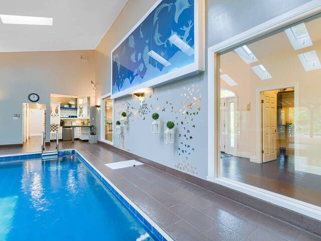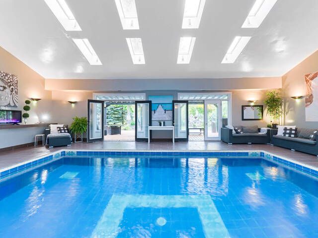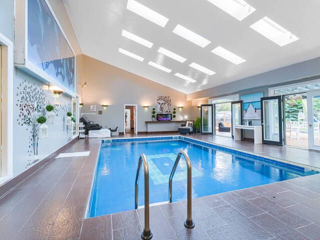 Welcome to a one-of-a-kind luxury retreat where every detail has been thoughtfully curated for upscale living, endless entertaining, and total comfort and home of two feature films. This show-stopping custom-built homeoffers over-the-top features you wont find anywhere else. Perfect for families, entertainers, or anyone seeking a lifestyle upgrade! Enjoy year-round swimming in your private indoor pool oasis, complete with custom-built bar, full change rooms, personal lockers, and 2 full bathrooms right in the pool area. Step outside to a covered deck featuring a top-of-the-line 8-seat, 40-jet hot tub the ultimate in relaxation! Host epic gatherings in your mancave-style game room, featuring a custom-built bar and stunning entertainment wall unit. The open-concept layout is flooded with natural light from 14 skylights, soaring 10-foot ceilings, and wide, inviting hallways. This home boasts 4 bedrooms including 2 primary suites, each withwalk-in closets, jacuzzi tubs, and private garden walkouts. Plus: 6 luxurious washrooms, a dedicated walk-in shoe closet, and rich hardwood floors throughout. Equipped with s/s appliances including a fridge, stove, 2 built-in dishwasher, 2 bar fridges, commercial washer/dryer, for comfort and convenience: enjoy the -in-floor heating throughout the entire home including the garage, 3 fireplaces for cozy ambiance, wheelchair accessible layout, lawn sprinkler system for low-maintenance landscaping . This property isnt just a home its an experience. Live where luxury meets lifestyle, and where every day feels like a getaway.