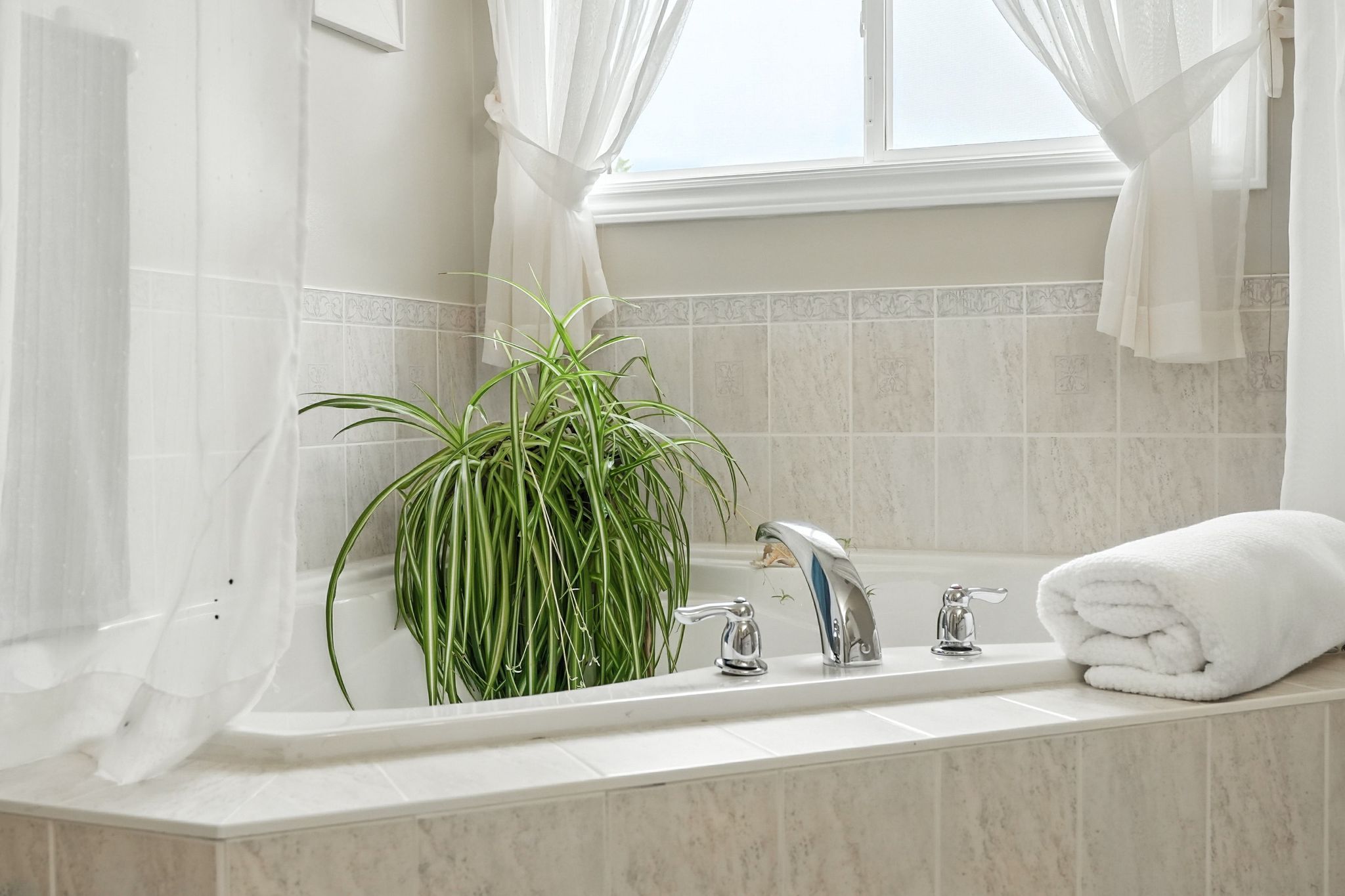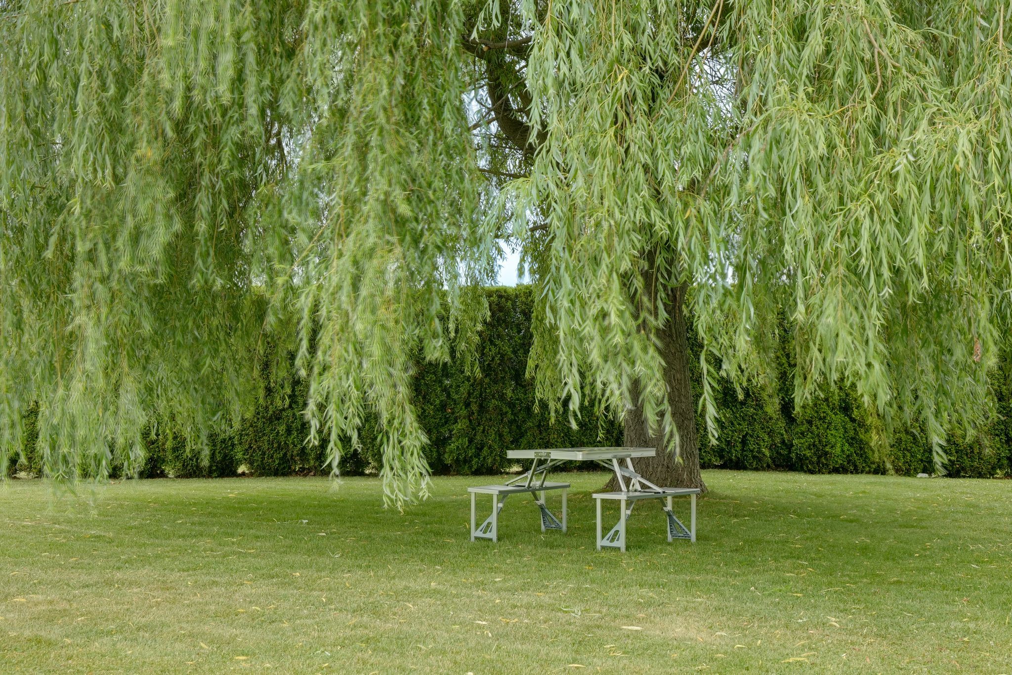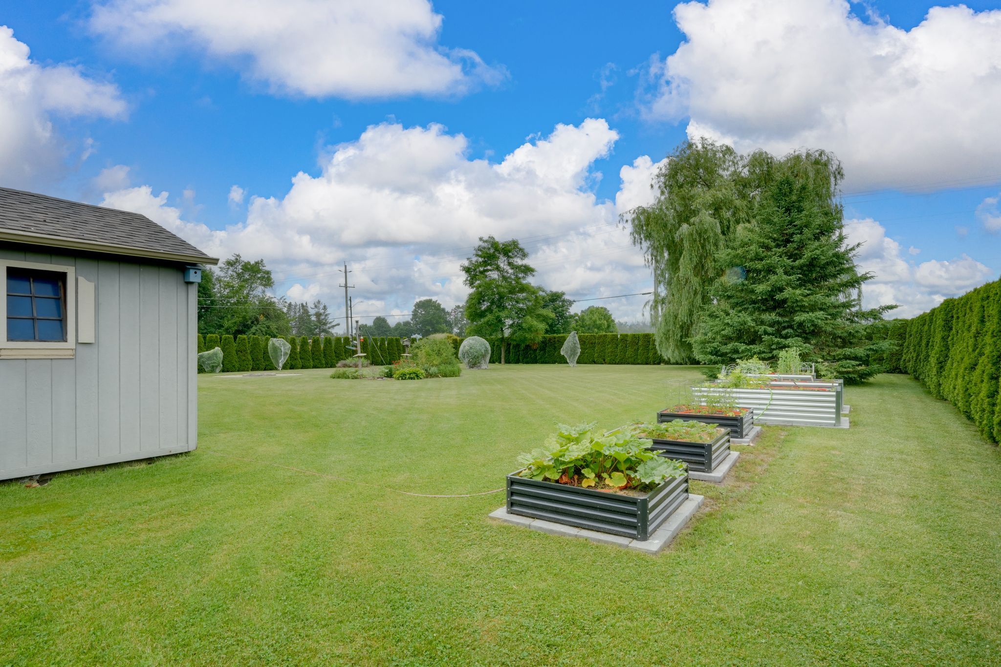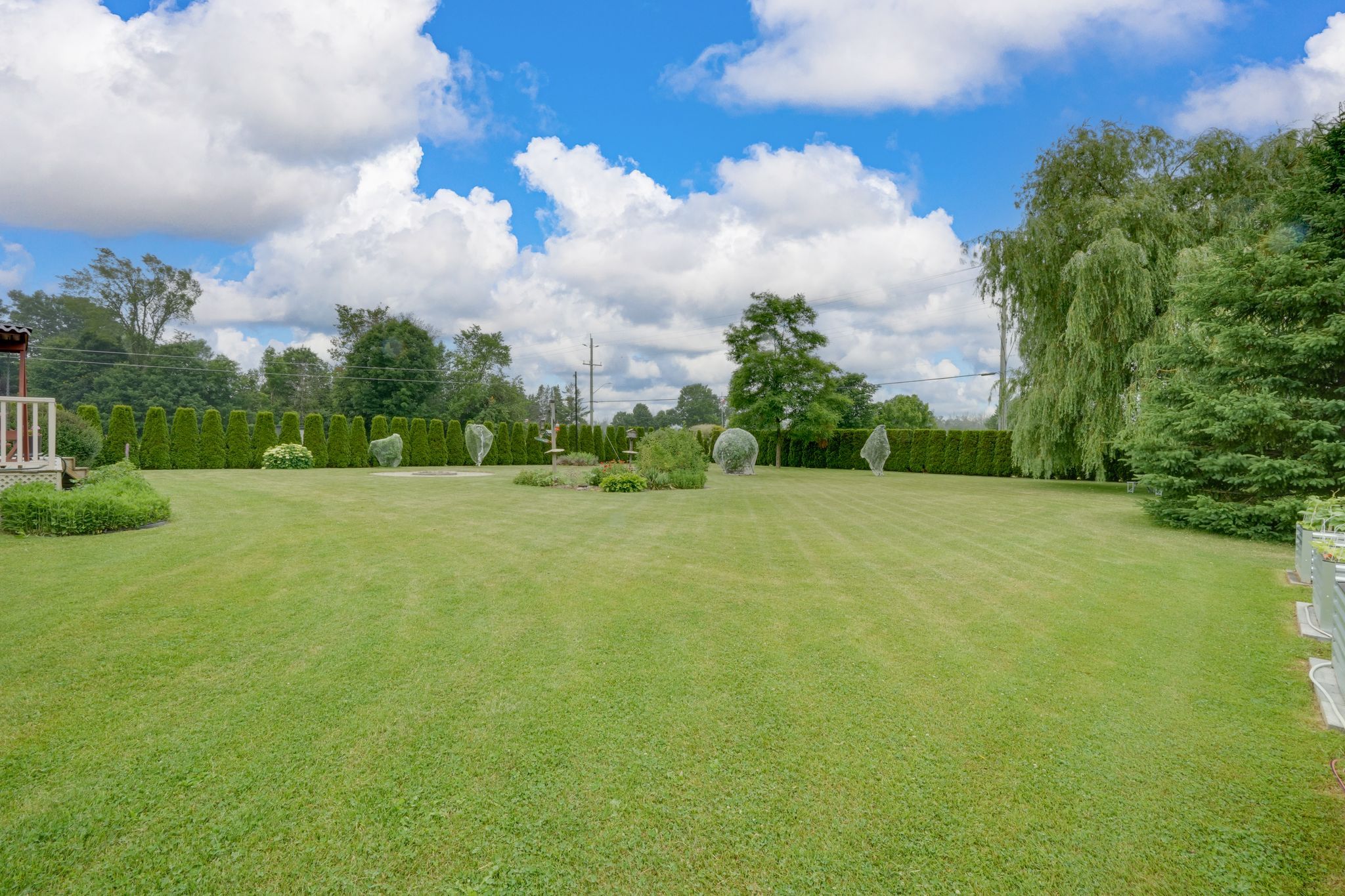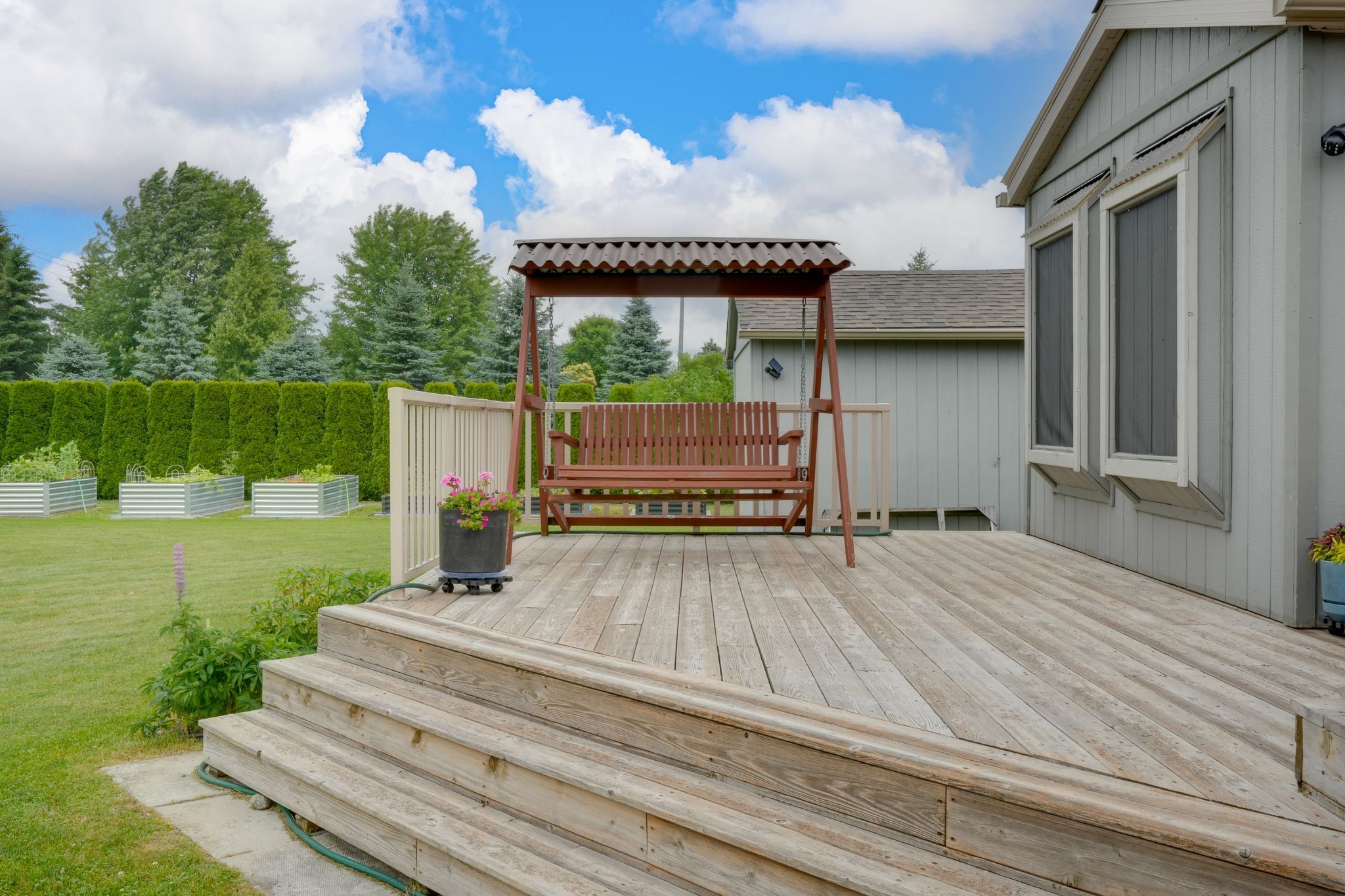 • Private backyard sanctuary surrounded by lush greenery and mature trees.