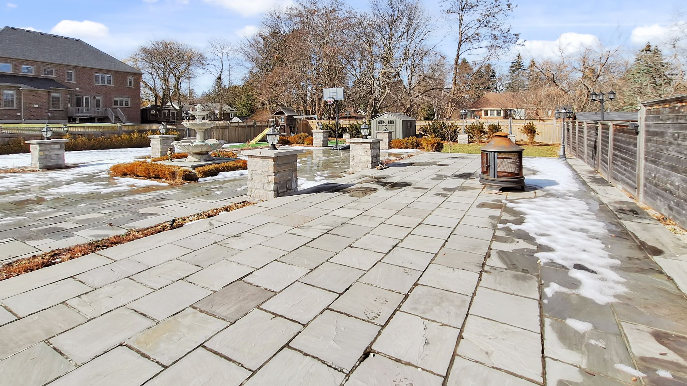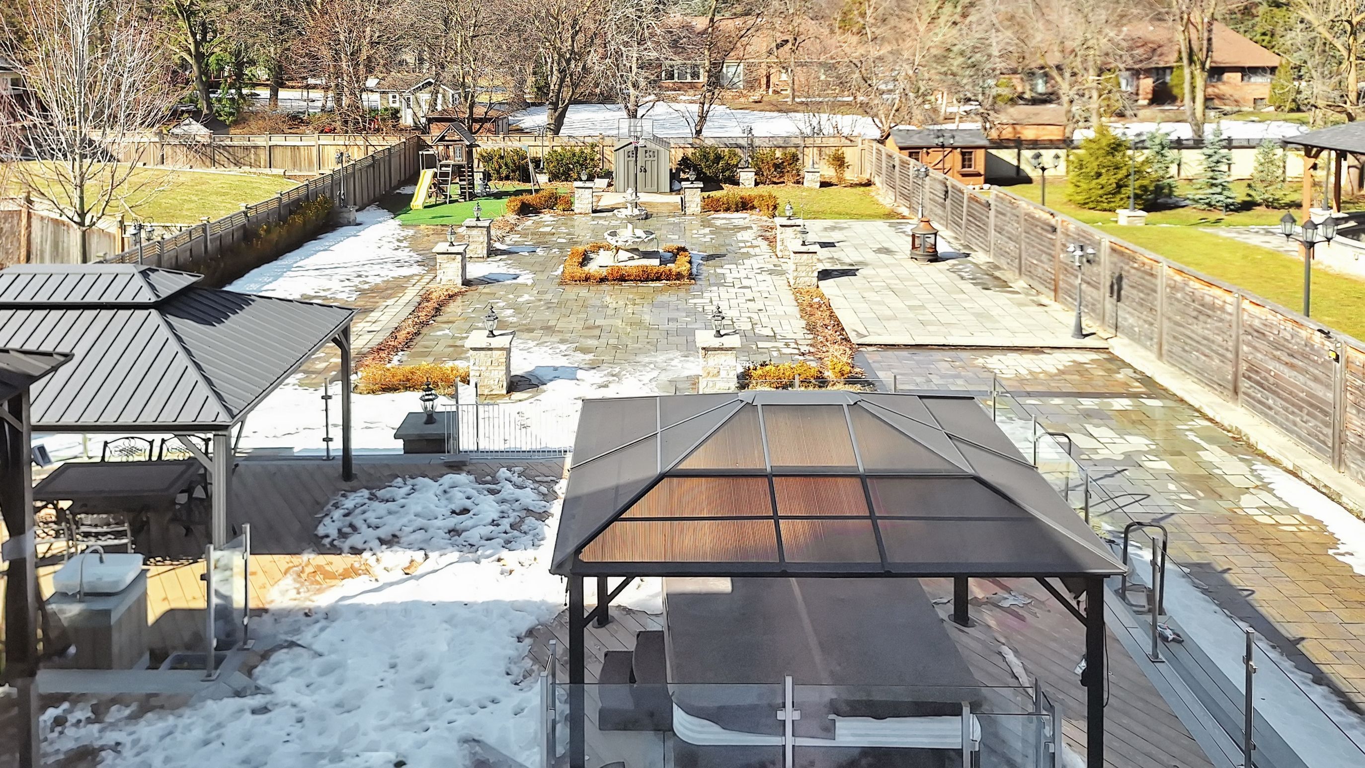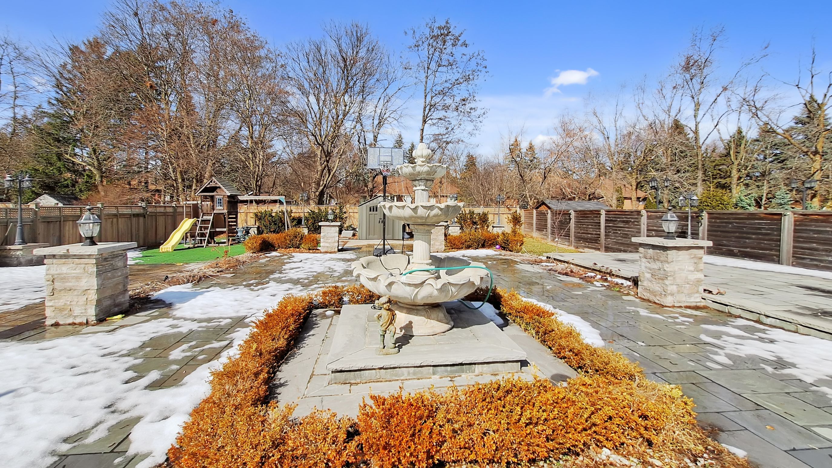 • Professionally landscaped backyard oasis with water features and hot tub.