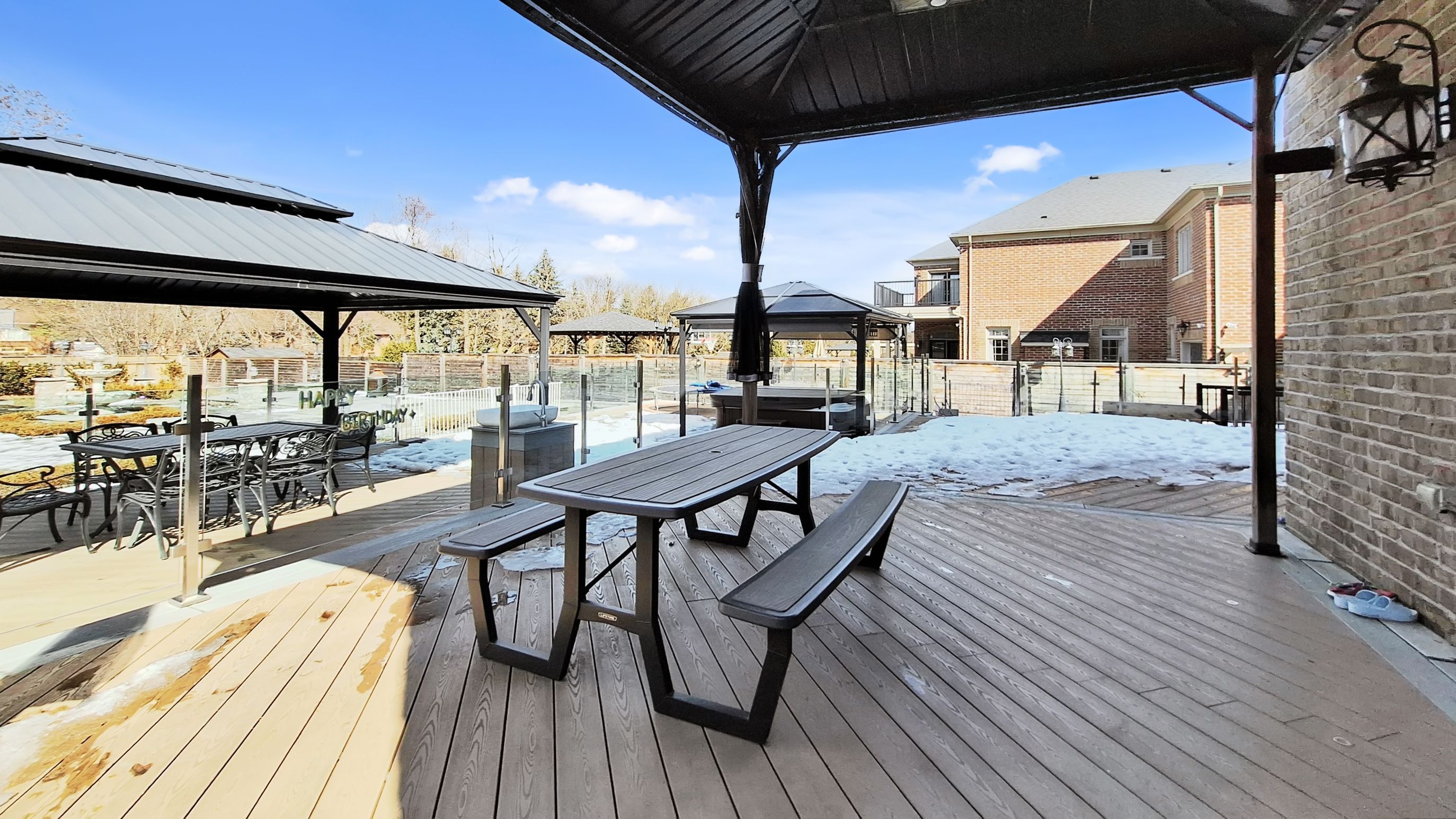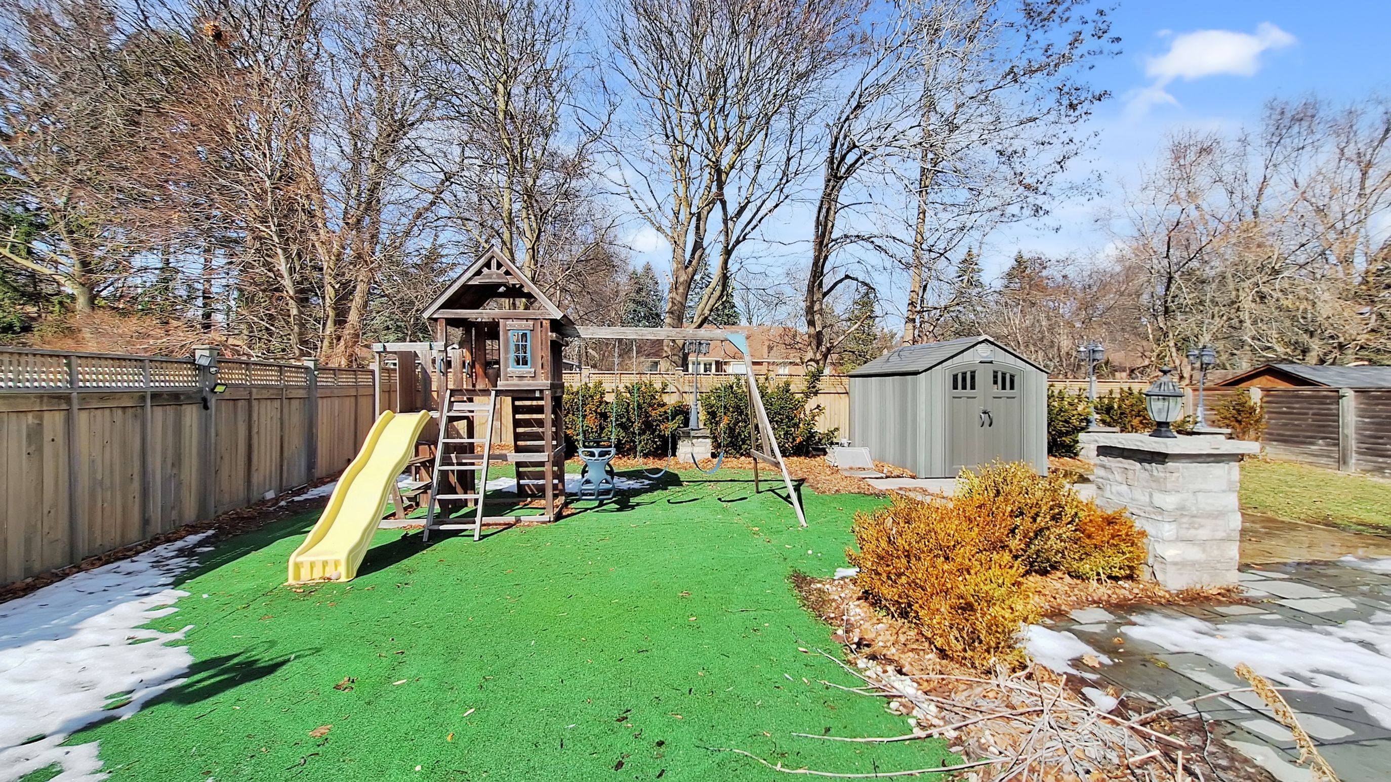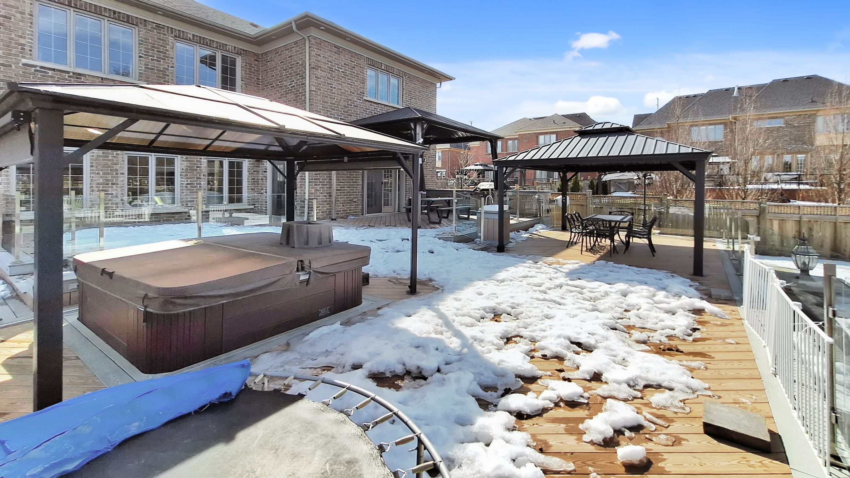 • Professionally landscaped backyard oasis with water features and hot tub.