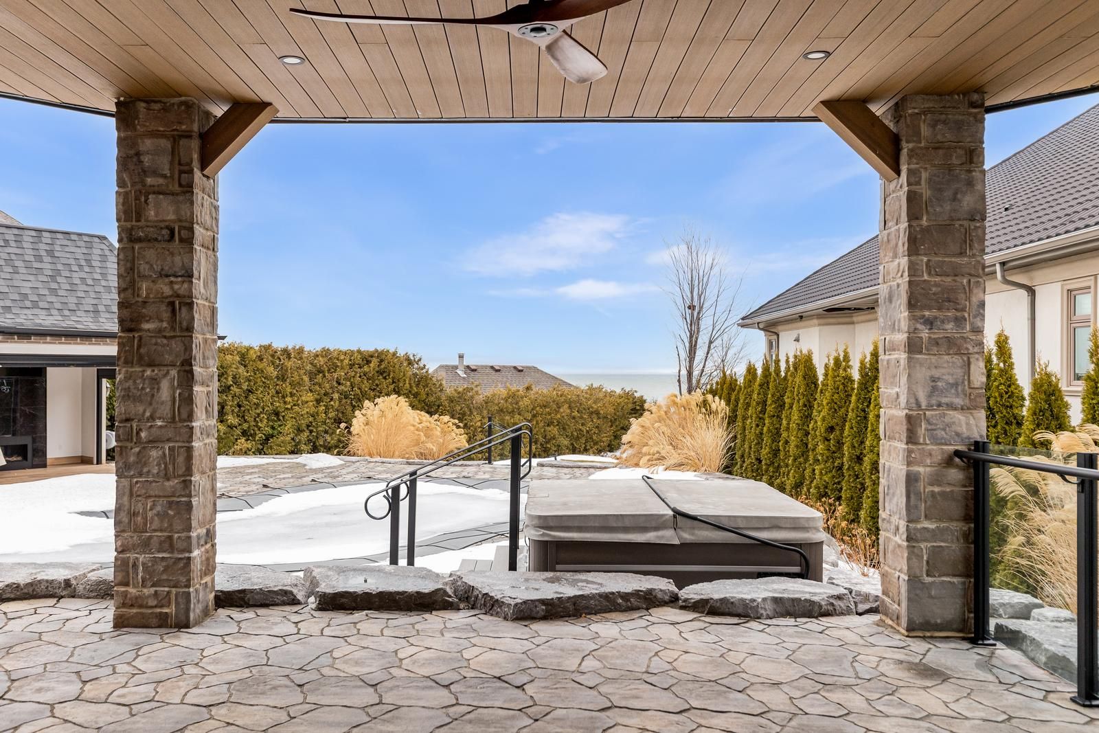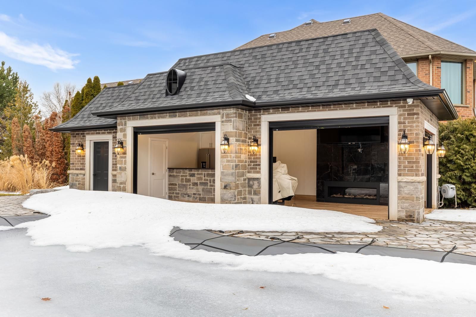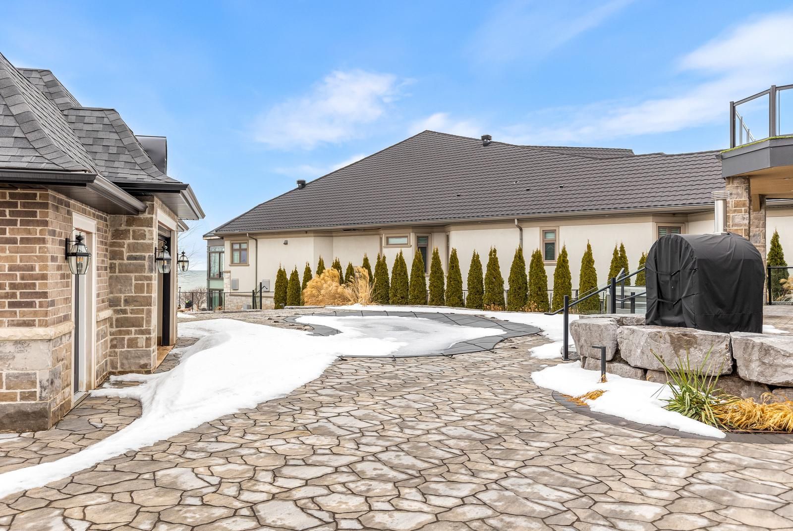 Custom-built in 2021 with a recent addition, this exceptional lake view home in grimsby showcases breathtaking views of lake ontario from multiple levels. Designed with luxury and functionality in mind, the open-concept main floor features soaring ceilings, a statement fireplace, and a chef-inspired kitchen with an oversized island and abundant counter space. Laundry is conveniently located on both the main and upper levels. Upstairs offers two private suites, including a stunning primary retreat with a spa-like5-piece ensuite, walk-in closet, and a beautiful see-through fireplace into the bathroom. An additional bedroom features its own terrace/deck-perfect for enjoying the incredible lakeviews. An elevator provides seamless access to all three floors. The bright, fully finished basement offers large windows with plenty of natural light, a spacious recreation area, exercise room, sauna, second kitchen, and double doors leading to a stone staircase that opens to the backyard. Step outside to your private backyard oasis complete with a pool, hot tub, and a separate secondary building with its own kitchen and living space for effortless indoor-outdoor entertaining. Complete with a 3-car garage and gated driveway, this beautifully finished home delivers elevated living with spectacular lake views.