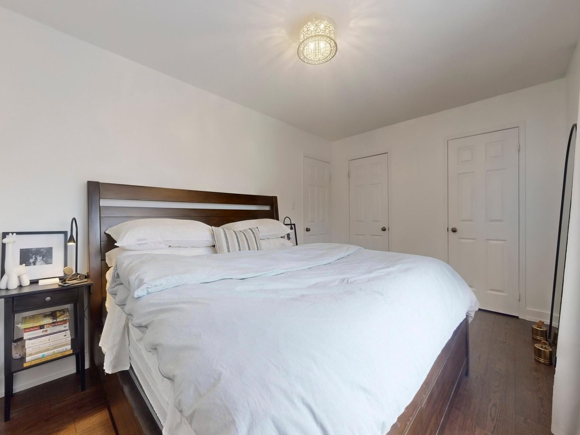 • Spacious primary bedroom with his-and-her closets, accommodates a king-size bed.