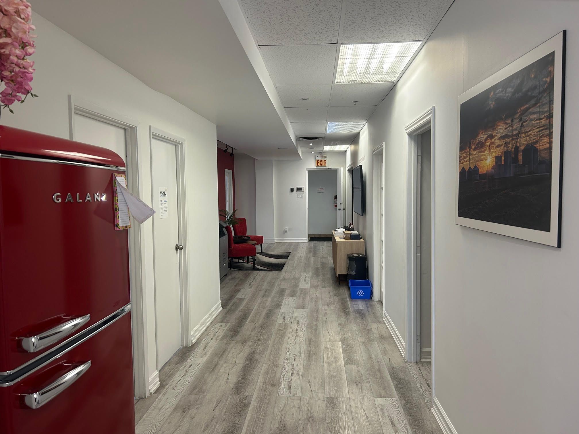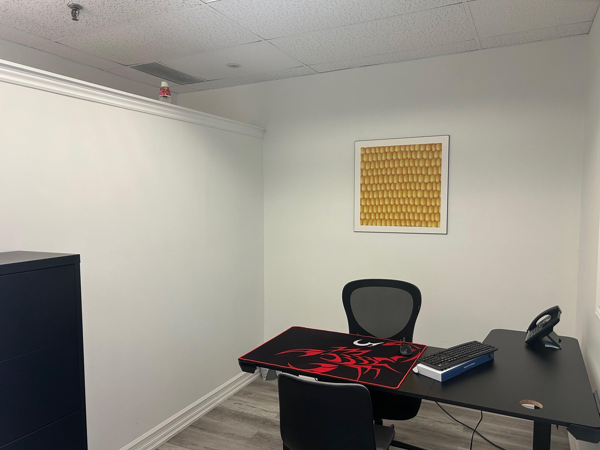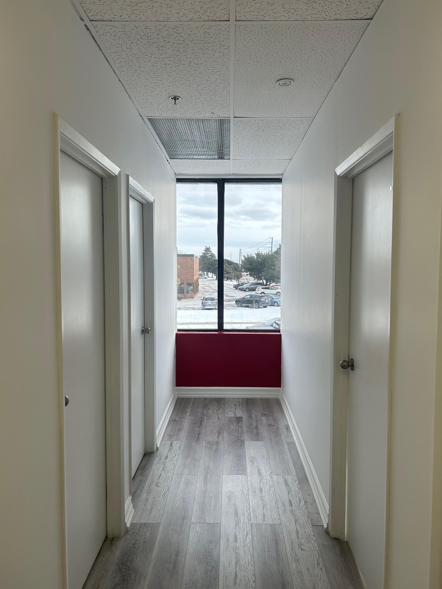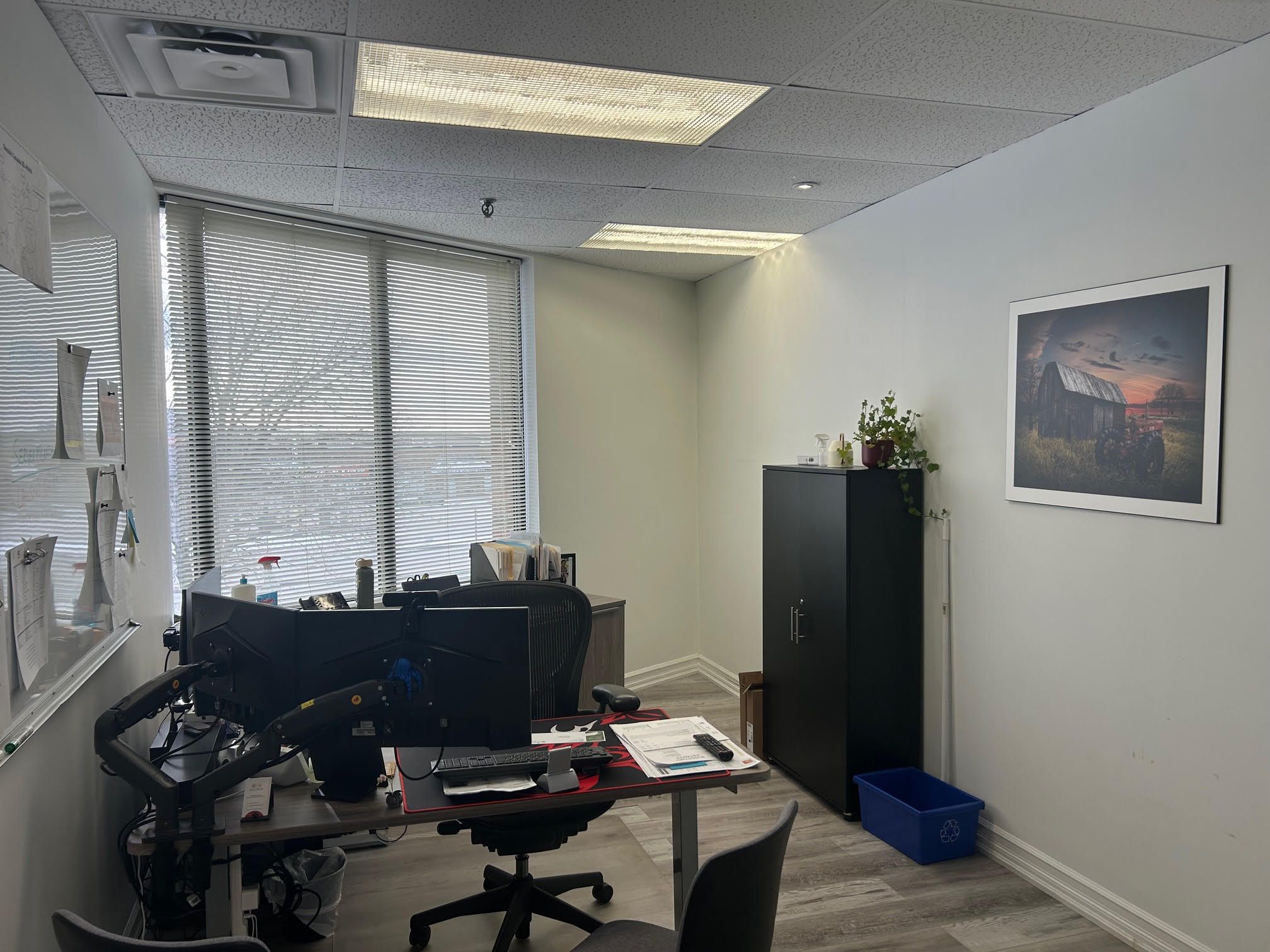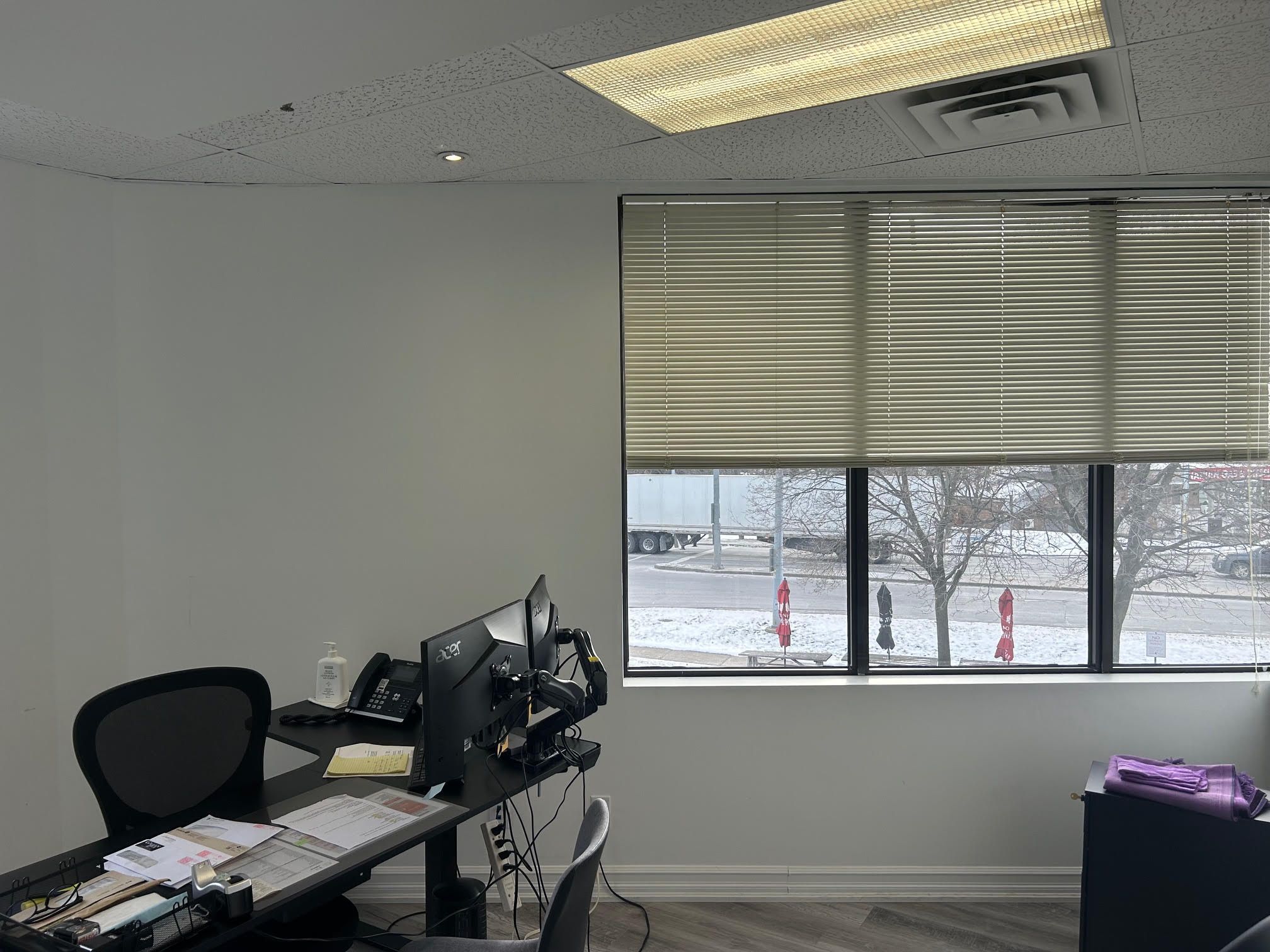 Excellent and prestigious location! 2nd floor corner office unit facing langstaff 9 private offices + board room, and reception area. 2 washrooms, totally renovated, freshly painted. Has a/c, updated ceiling tiles, laminate floors throughout, extra large windows all around, and ample parking.