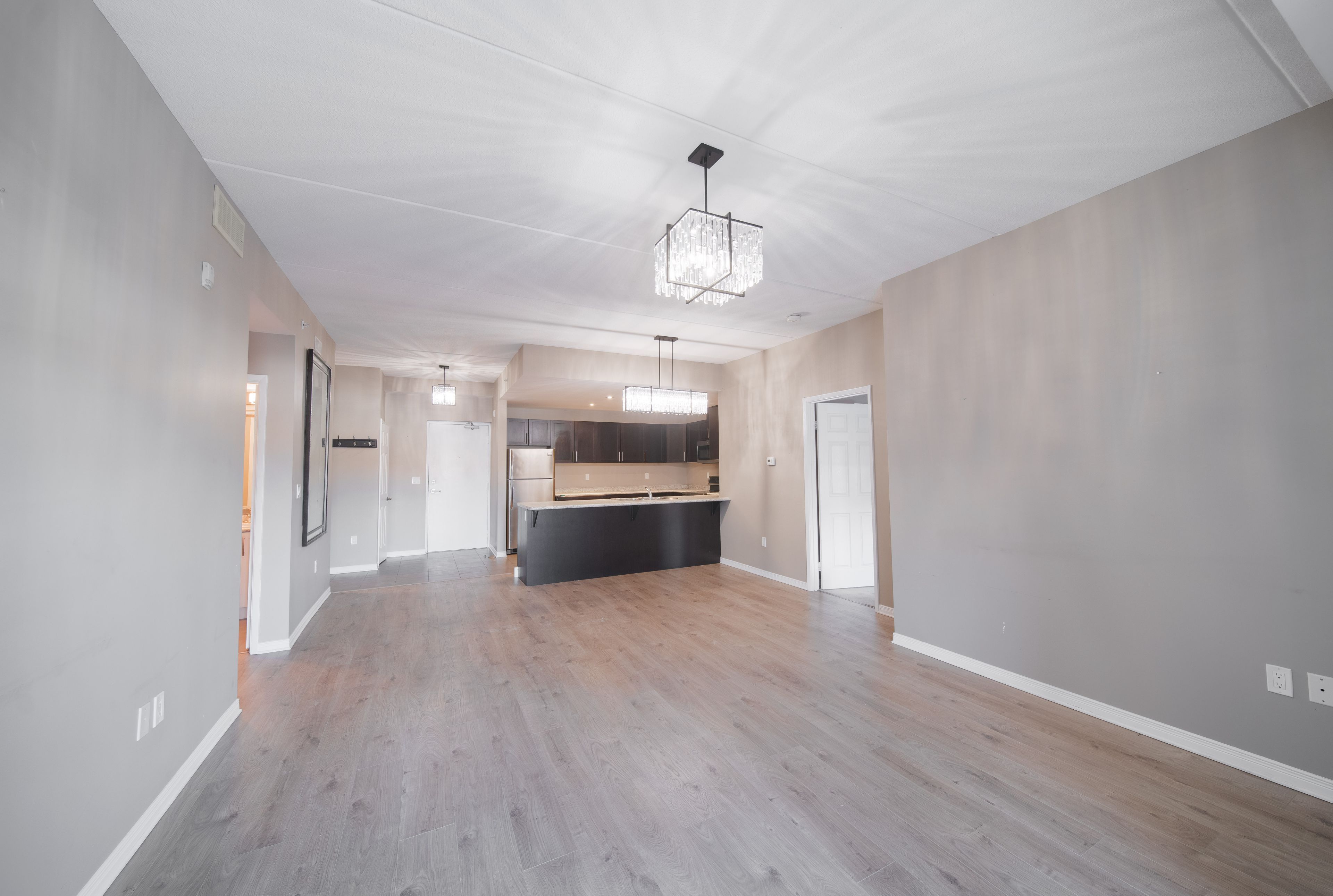 Rarely found in newer condo buildings, this expansive 1,100 sq ft open-concept 2-bedroom, 2-bath unit offers a truly generous kitchen and living room layout that feels more like a home than a condo. Bright, spacious and thoughtfully designed with high ceilings and an accessible, open flow throughout. The kitchen features abundant cabinetry, a breakfast bar and a full dining area-ideal for both everyday living and entertaining. The split-bedroom layout provides excellent privacy. The primary suite includes an ensuite bath with oversized step-in shower, linen closet and mirrored medicine cabinet. A full-size laundry room offers side-by-side washer and dryer, laundry sink and excellent storage. Enjoy a private balcony and abundant natural light. Includes central air, owned hot water tank, one surface parking space, owned basement locker, additional storage for patio furniture and bike storage. Well-maintained 3-storey building with exercise room, party/social room and hobby/workshop space. No underground parking or pool helps keep condo fees well controlled. Walk to shops, dining, groceries, parks, churches, transit, with easy access to hwy 58, 406 & qew.