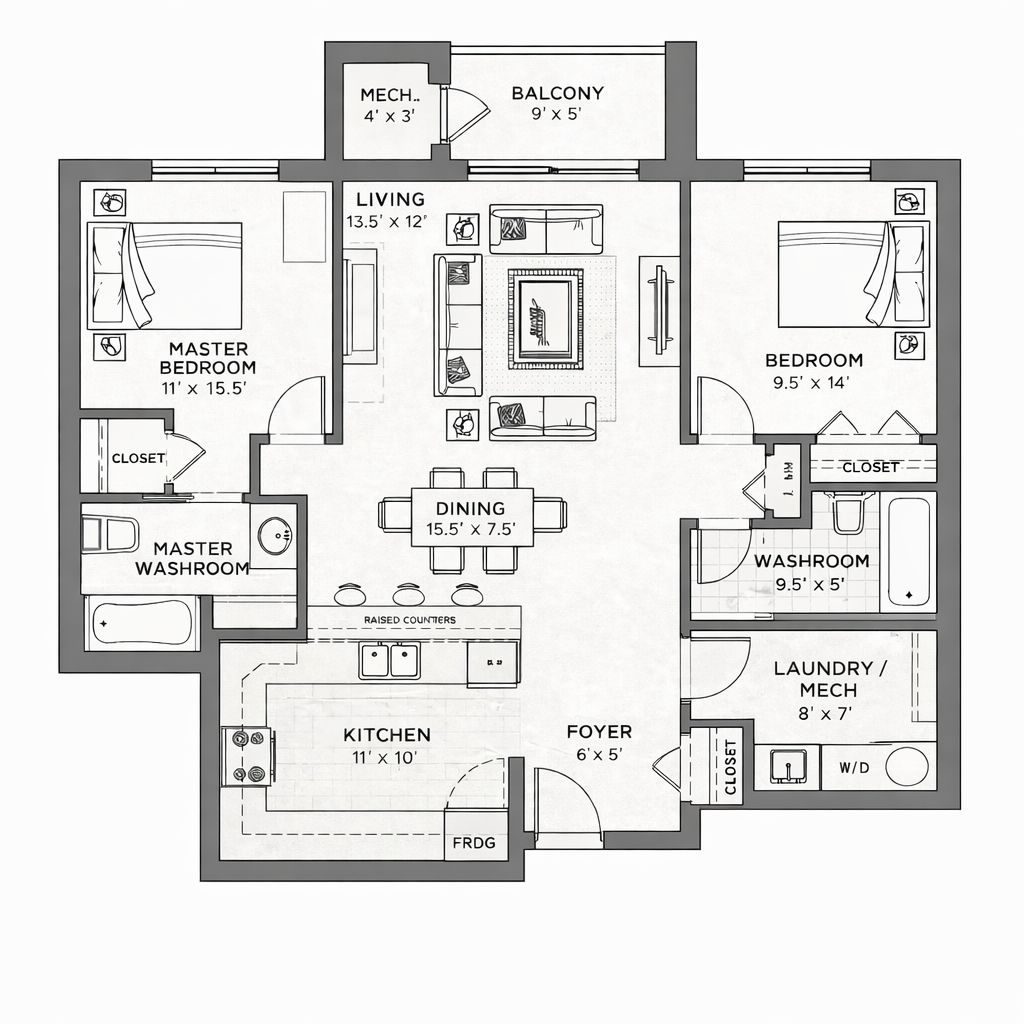 • Spacious 1,100 sq ft open-concept layout feels like a home.